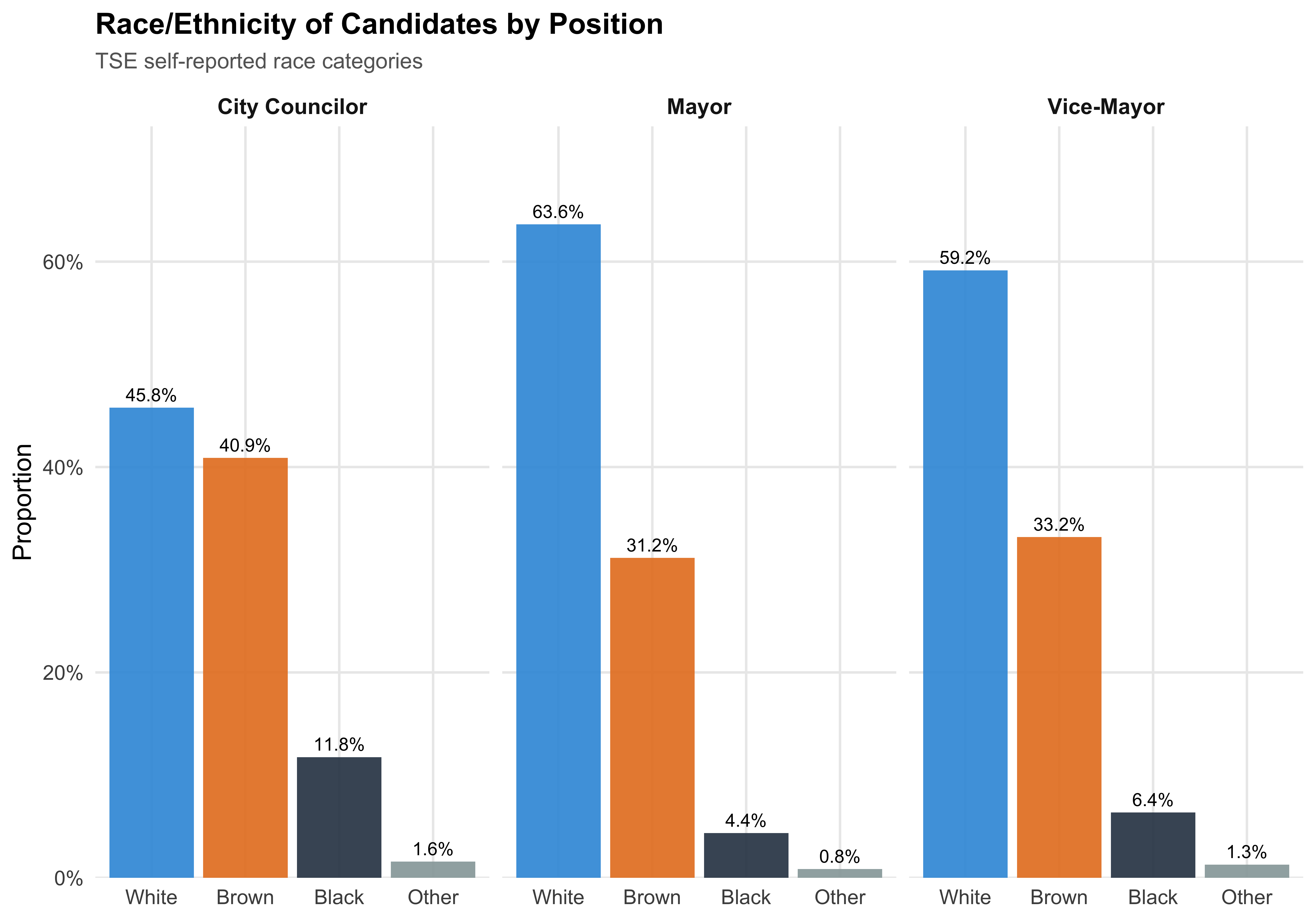 Race/ethnicity is self-reported by candidates on TSE registration forms, using Brazil’s official census categories (Branca, Parda, Preta, Amarela, Indigena). We translate these as White, Brown, Black, Asian, and Indigenous, respectively, and group the latter two plus unreported cases as “Other” for analytical simplicity.