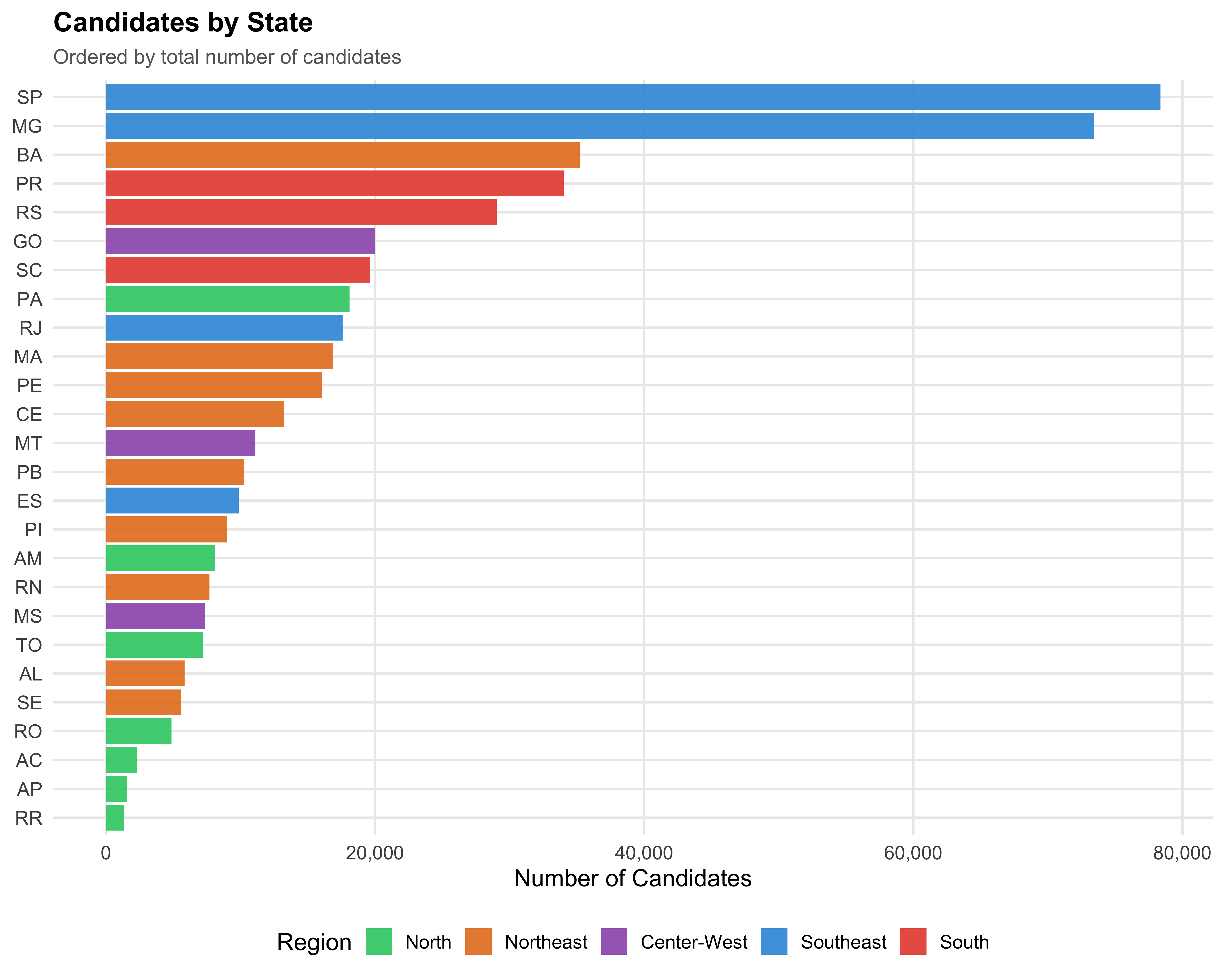 Brazil's 27 states are grouped into five macro-regions: North, Northeast, Center-West, Southeast, and South. The table below shows the distribution of candidates across regions.