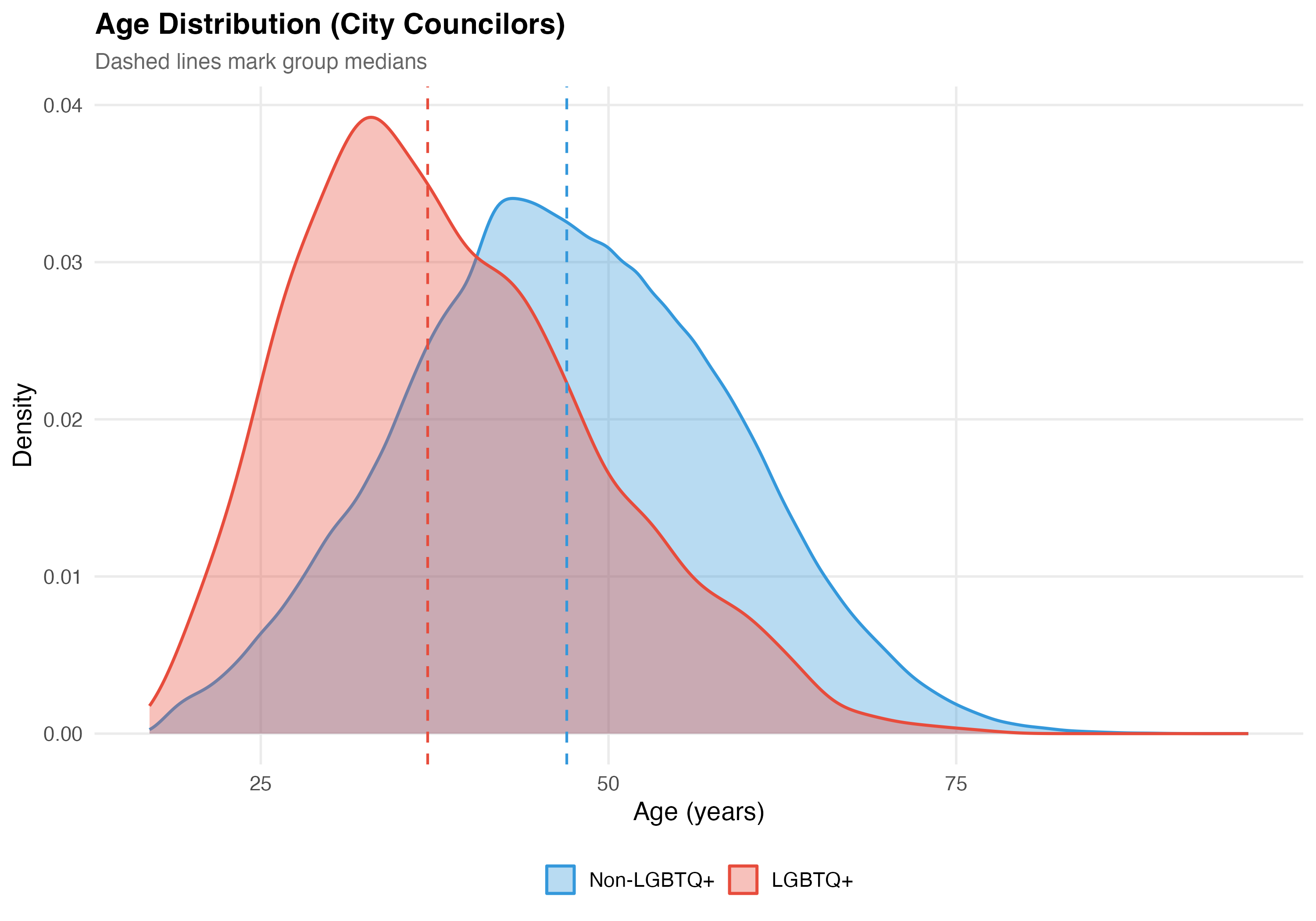 We compare the two groups across demographics (age, gender, race, education), political positioning (ideology, party, position), and electoral outcomes. Every comparison shown here treats the non-LGBTQ+ population as the baseline and highlights where LGBTQ+ candidates diverge --- and by how much.