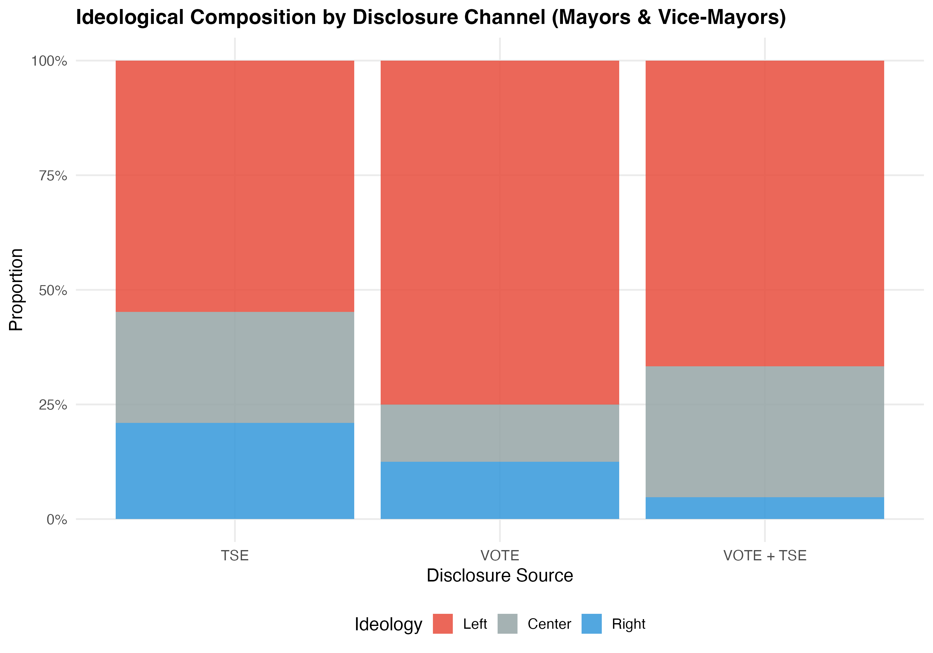 TSE self-declaration captures candidates who voluntarily check the LGBTQ+ box on the official registration form, while VOTE LGBT identifies candidates through civil society networks. Differences in ideological and regional composition across channels suggest these sources are complementary rather than redundant.