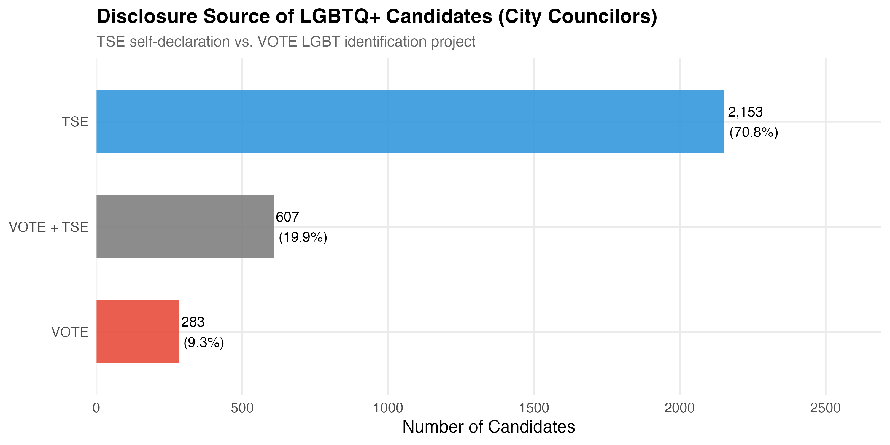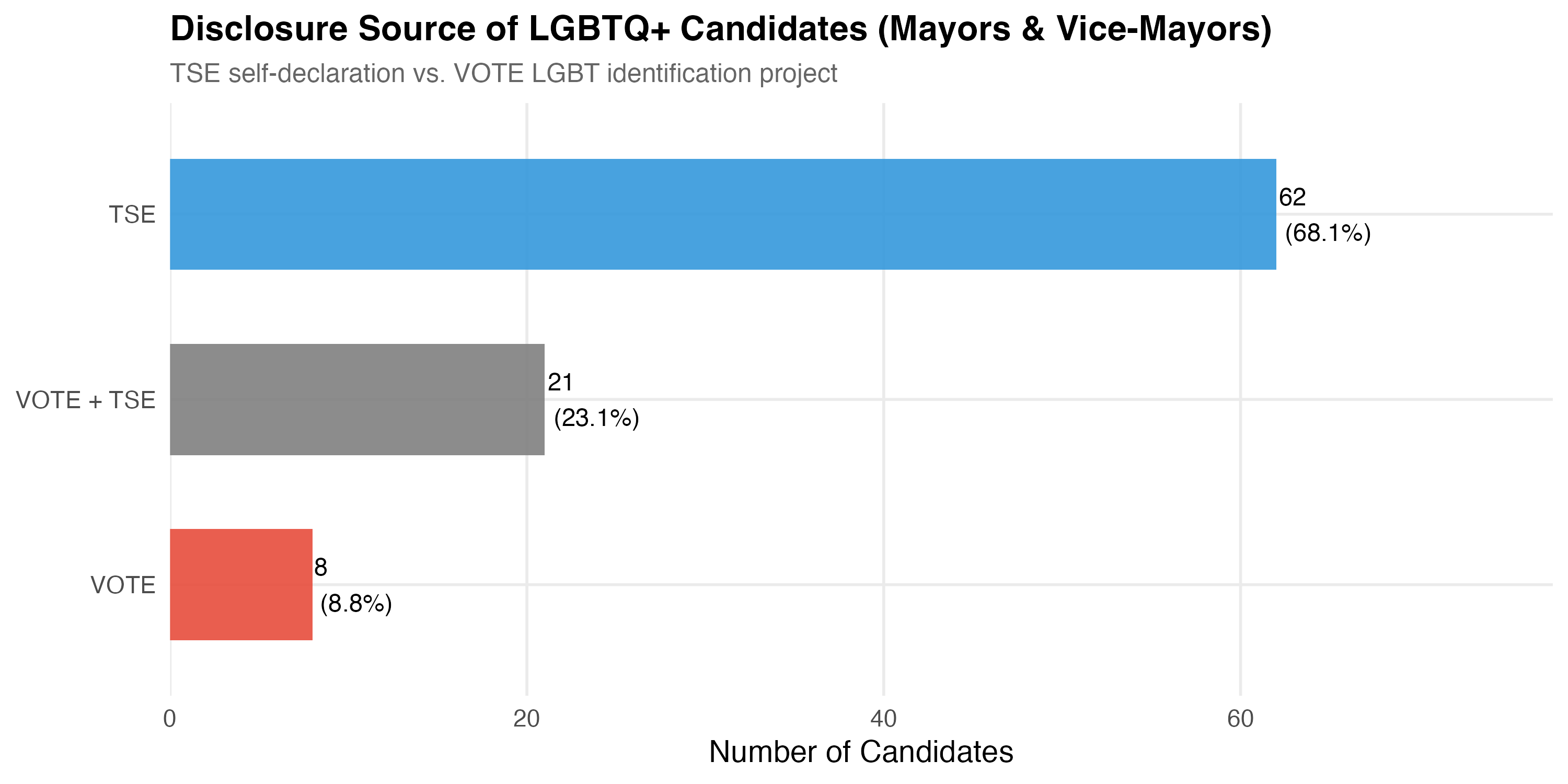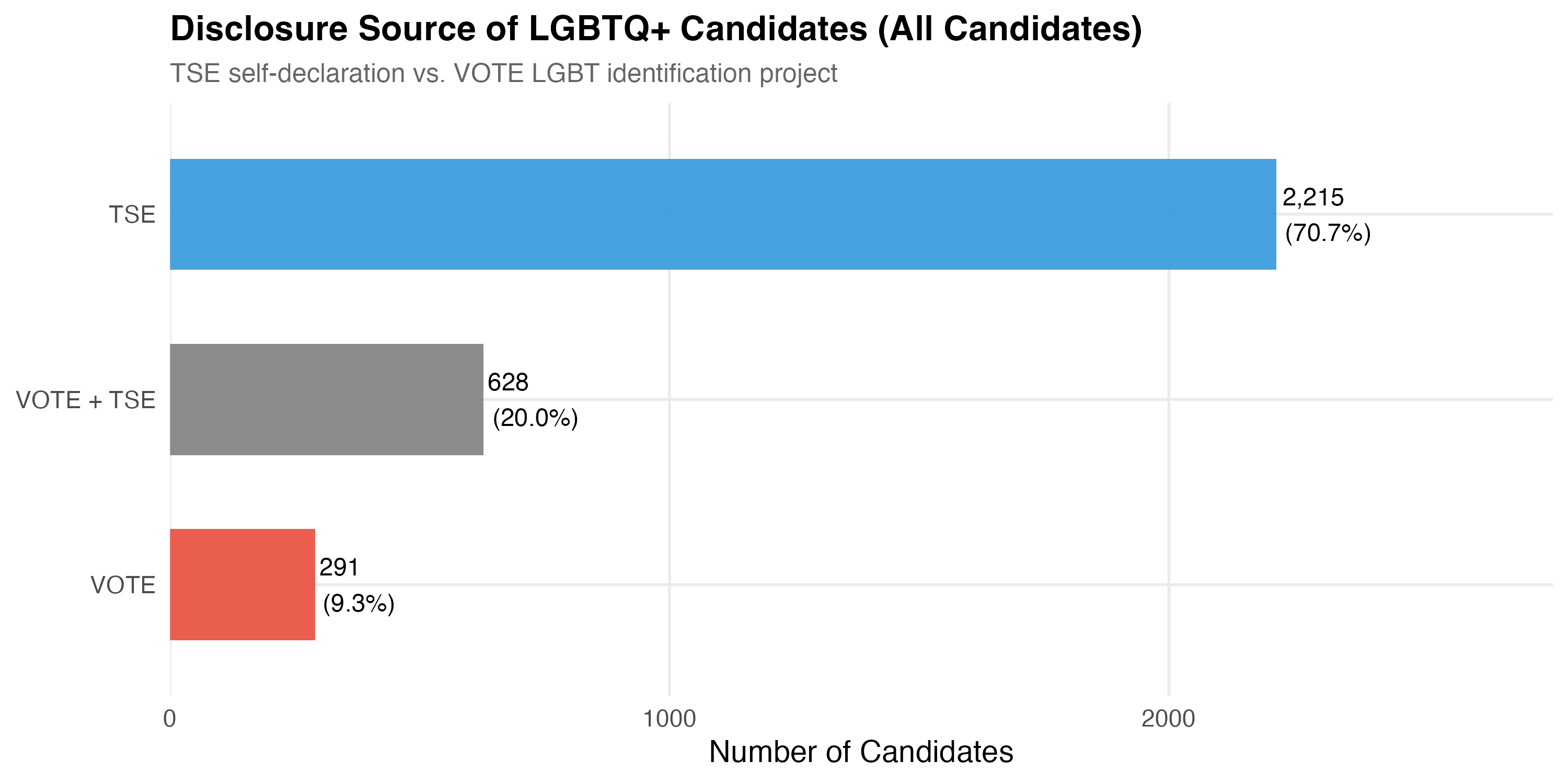 Some candidates appear in both sources, which strengthens confidence in their identification. Disclosure source indicates whether a candidate was identified via TSE self-declaration only, VOTE LGBT matching only, or both. The panels below show the distribution across these categories.