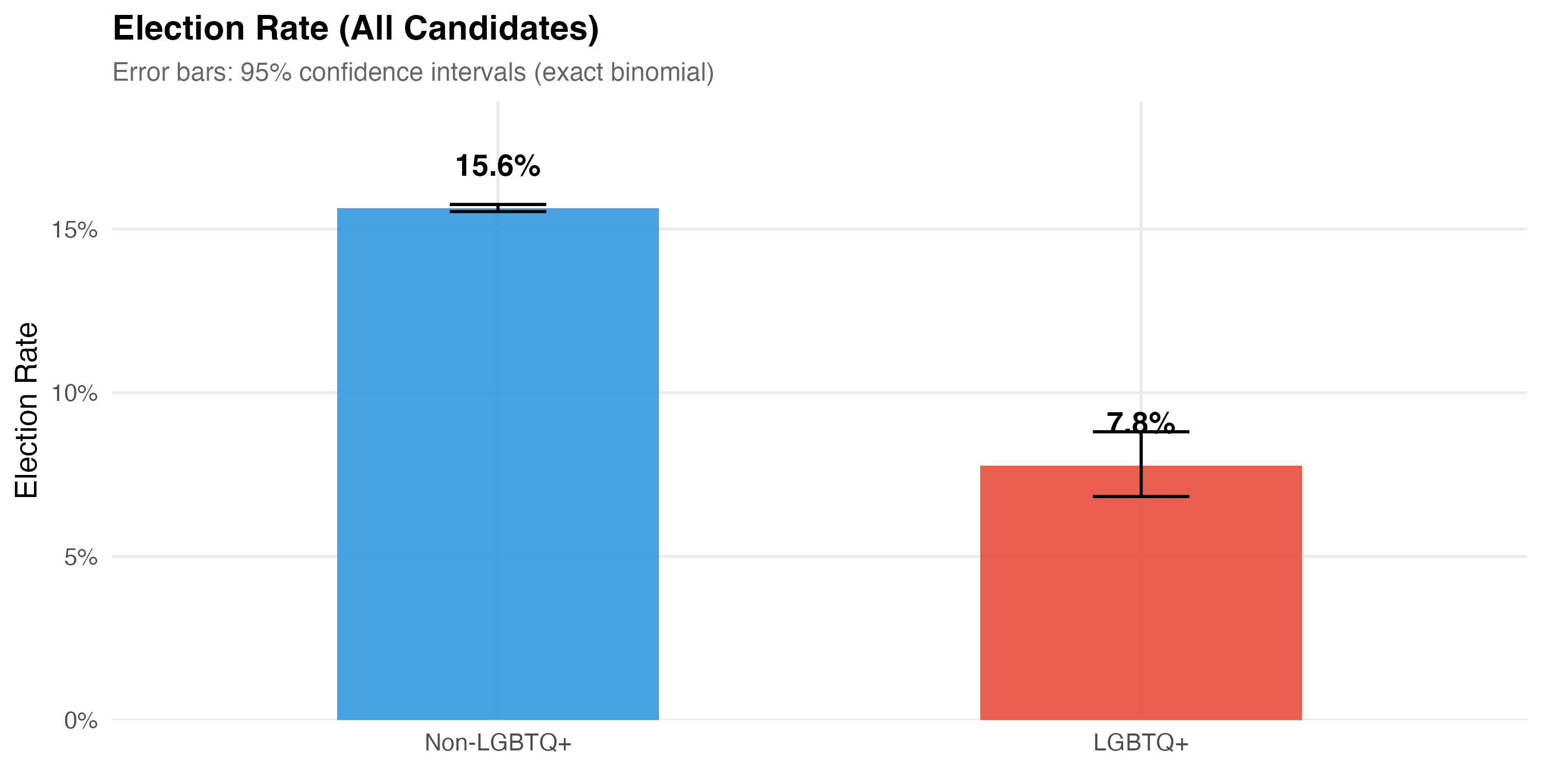The dataset contains `r format_n(nrow(df))` candidates, of whom `r format_n(sum(df$lgbtq_candidate, na.rm = TRUE))` (`r format_pct(mean(df$lgbtq_candidate, na.rm = TRUE))`) are identified as LGBTQ+.