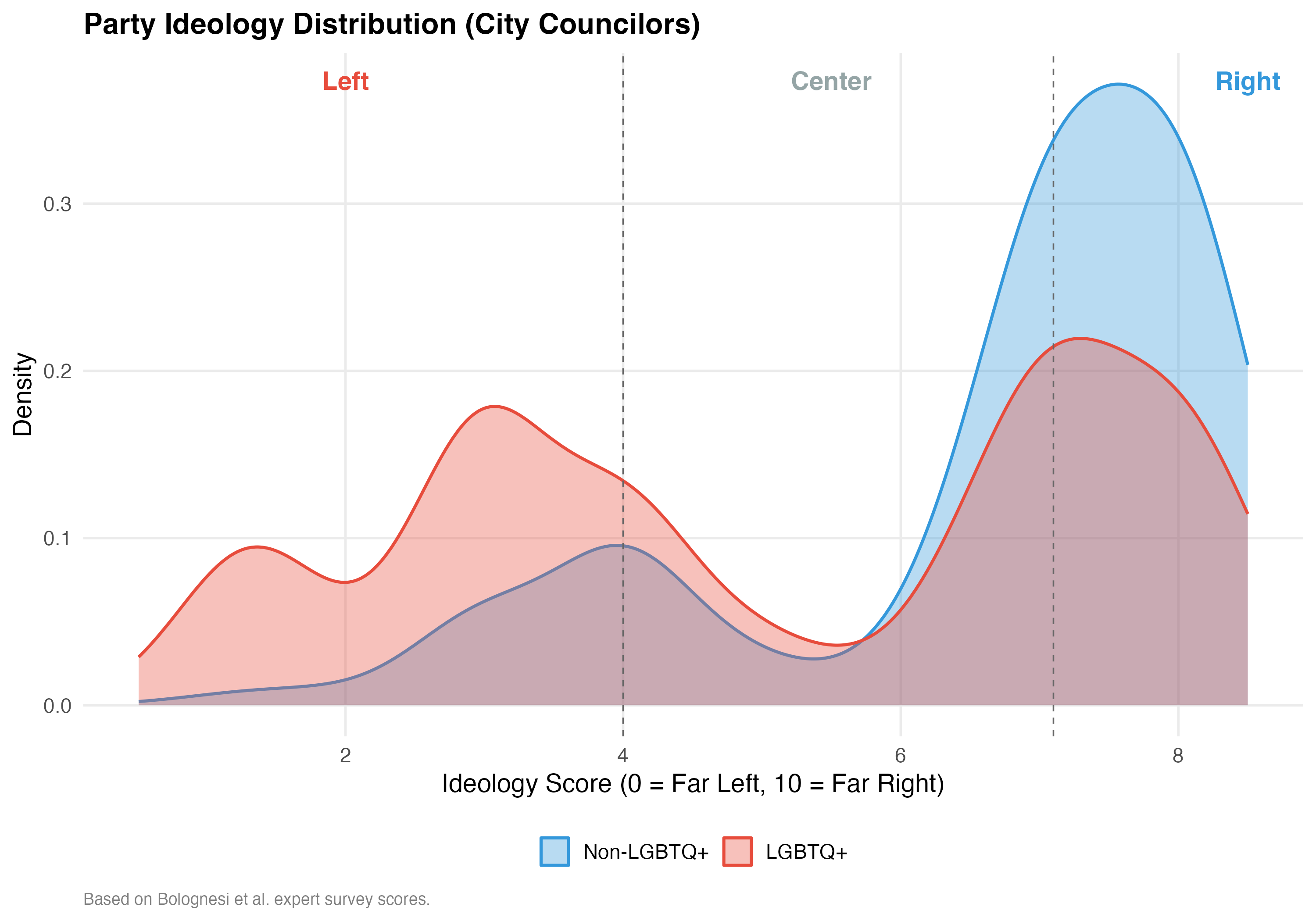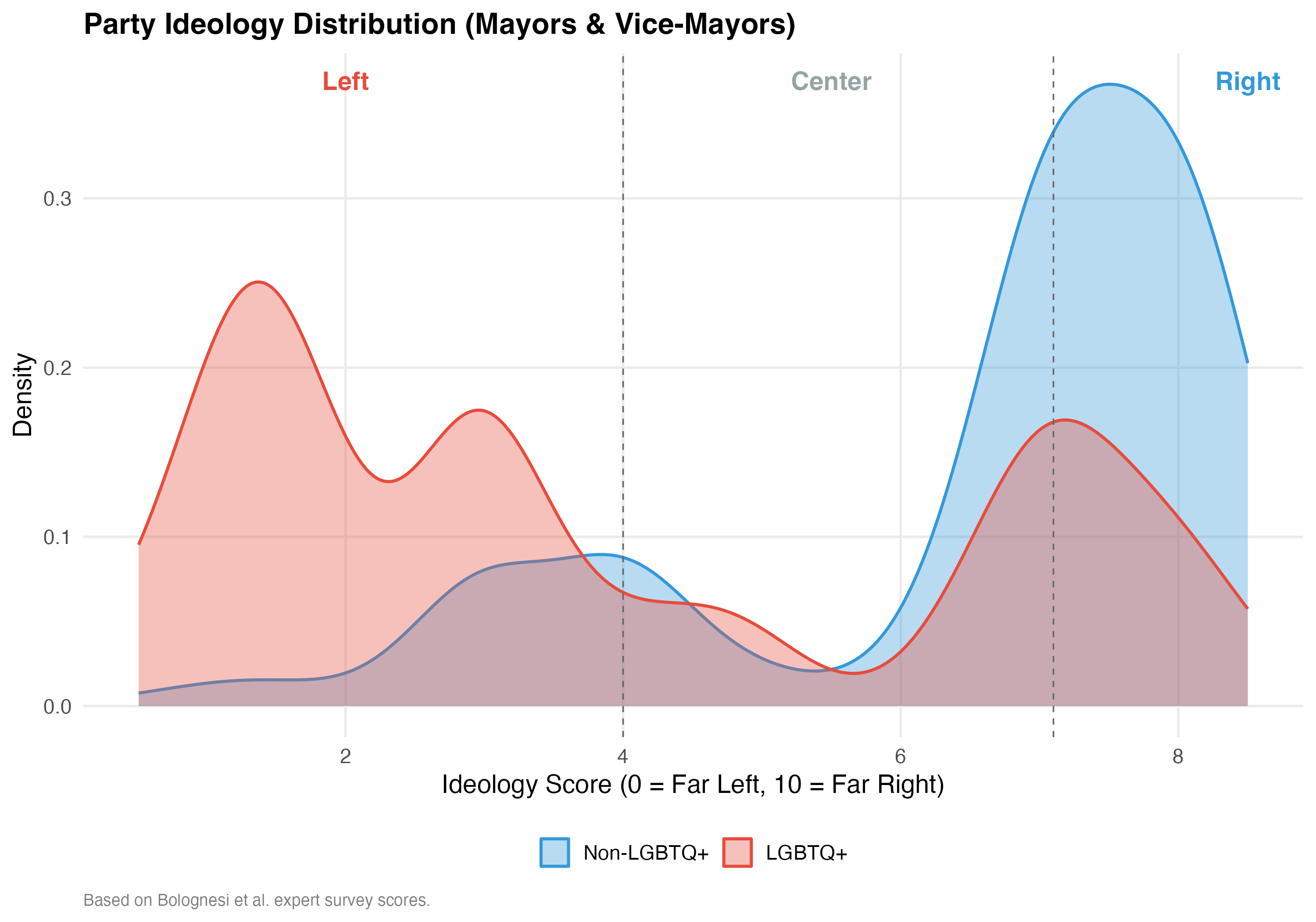 2. **Ideology**: The ideological distribution of LGBTQ+ candidates is compared to the non-LGBTQ+ baseline, showing the degree to which LGBTQ+ candidates concentrate in particular parts of the left-right spectrum.