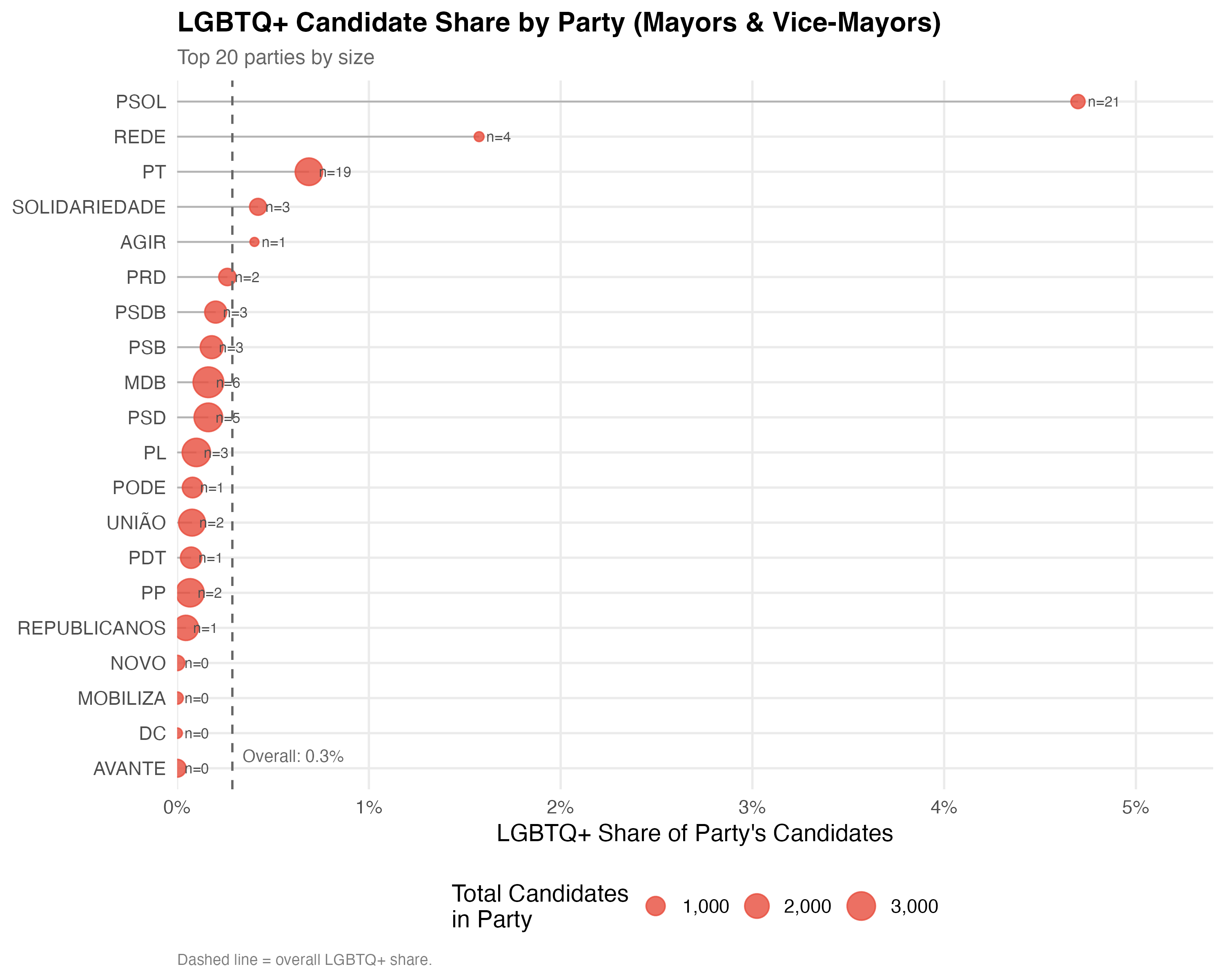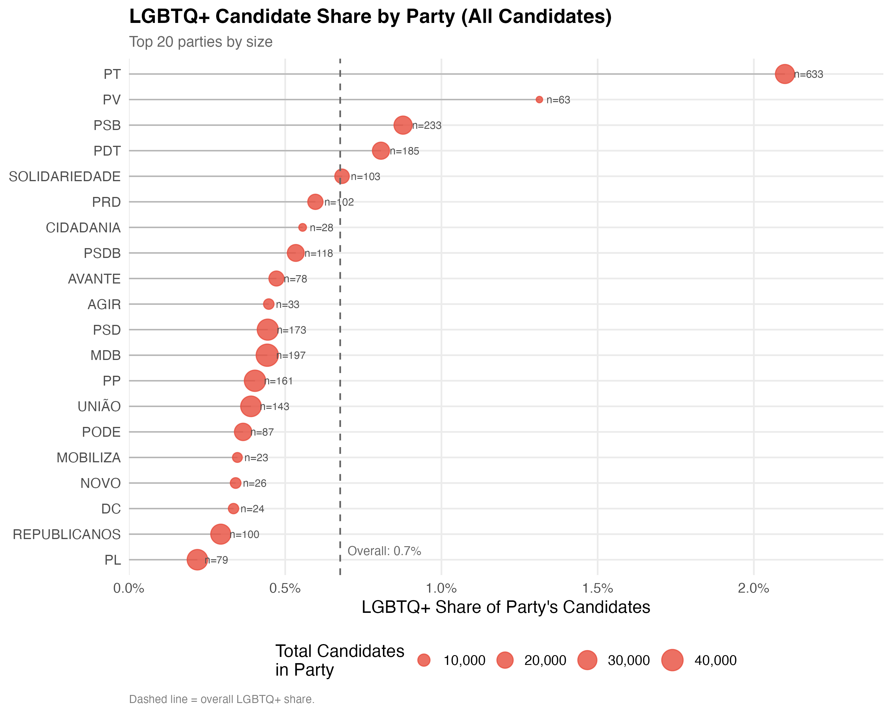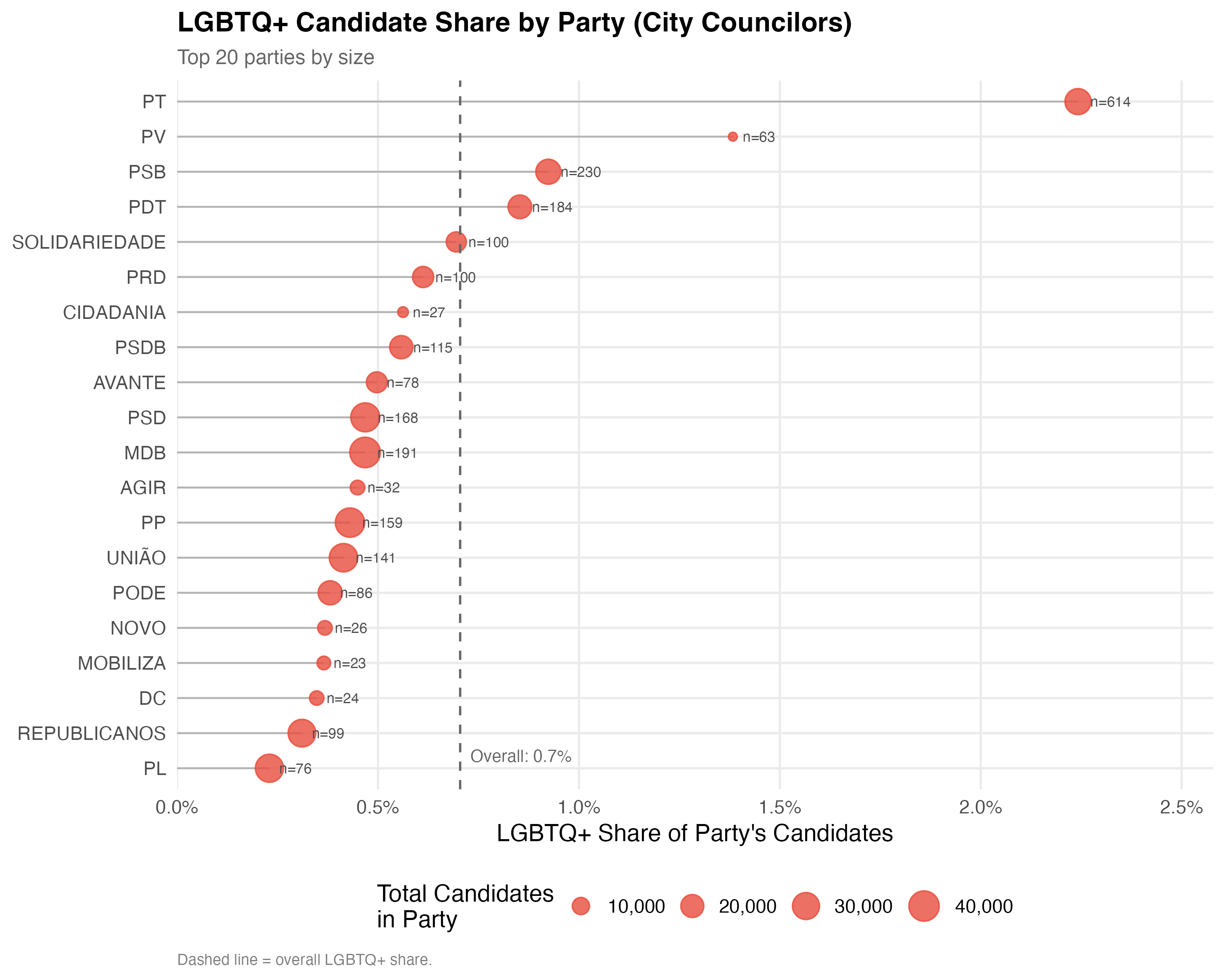 3. **Party concentration**: LGBTQ+ candidates are not uniformly distributed across parties. Some parties serve as key vehicles for LGBTQ+ candidacies while others have virtually none.