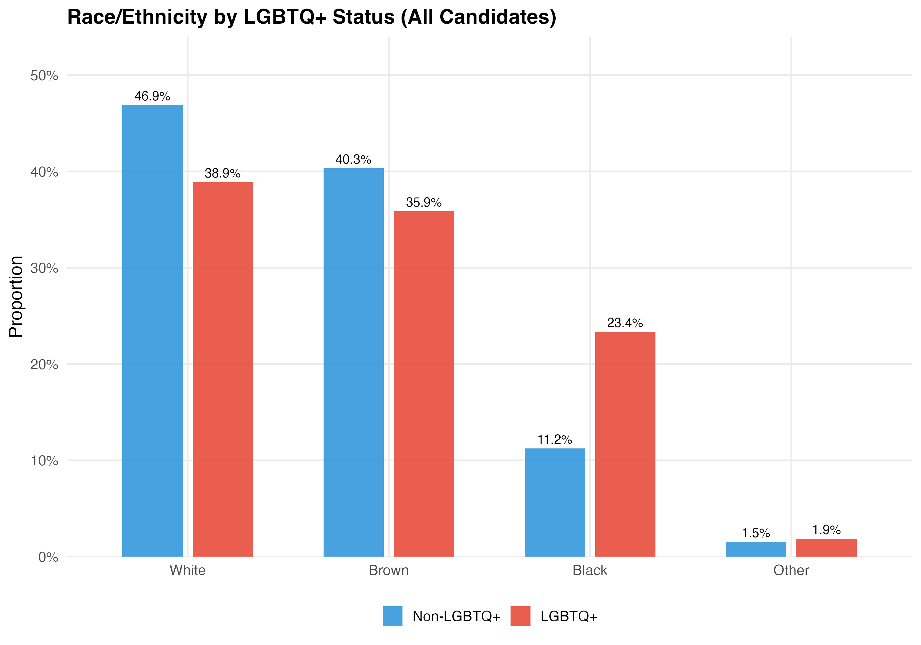 Differences in racial composition between LGBTQ+ and non-LGBTQ+ candidates have implications for understanding intersectional disadvantage. If LGBTQ+ candidates are disproportionately nonwhite, they may face compounded barriers --- a question we explore in depth in [Chapter 6](06_intersections.qmd).