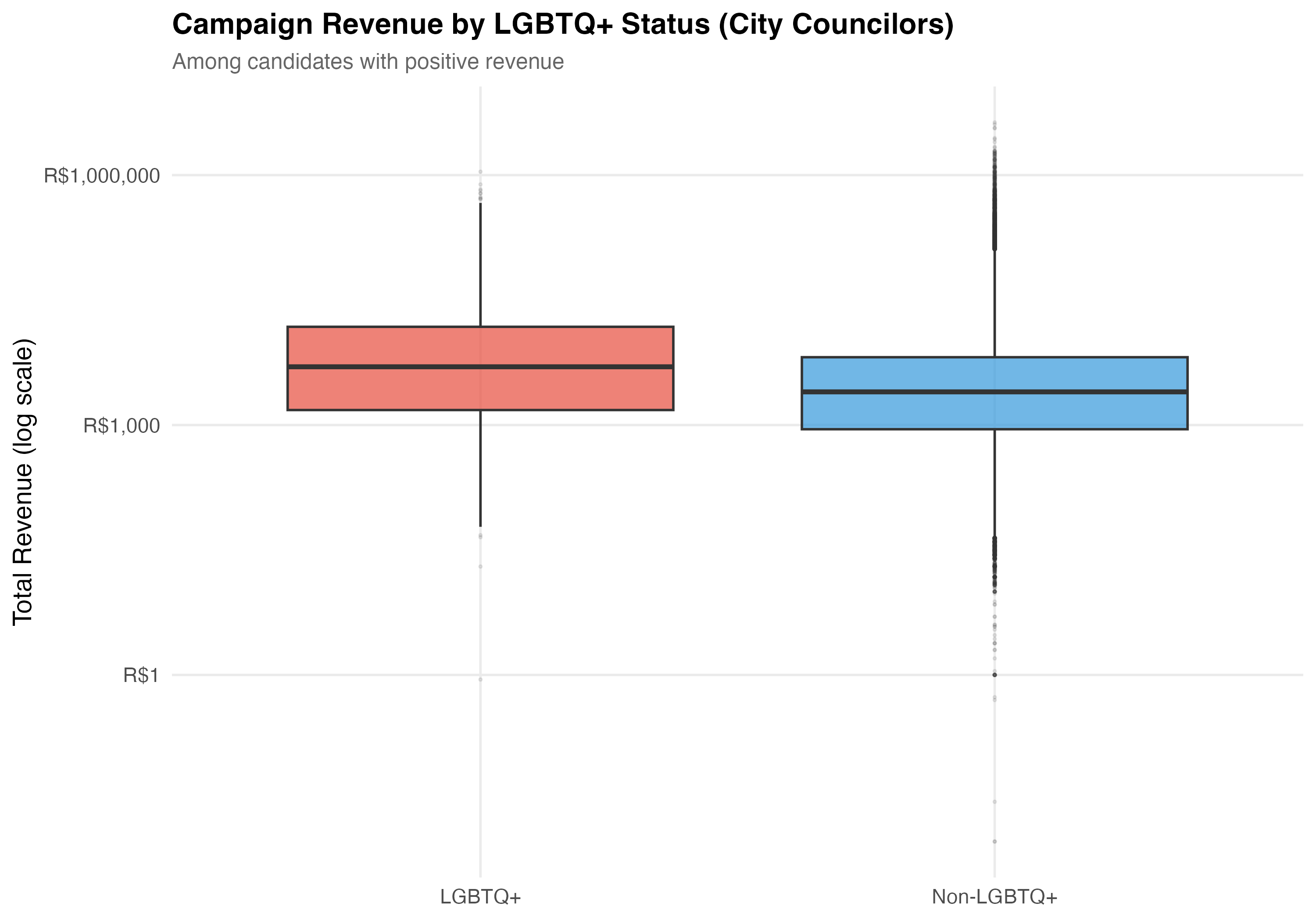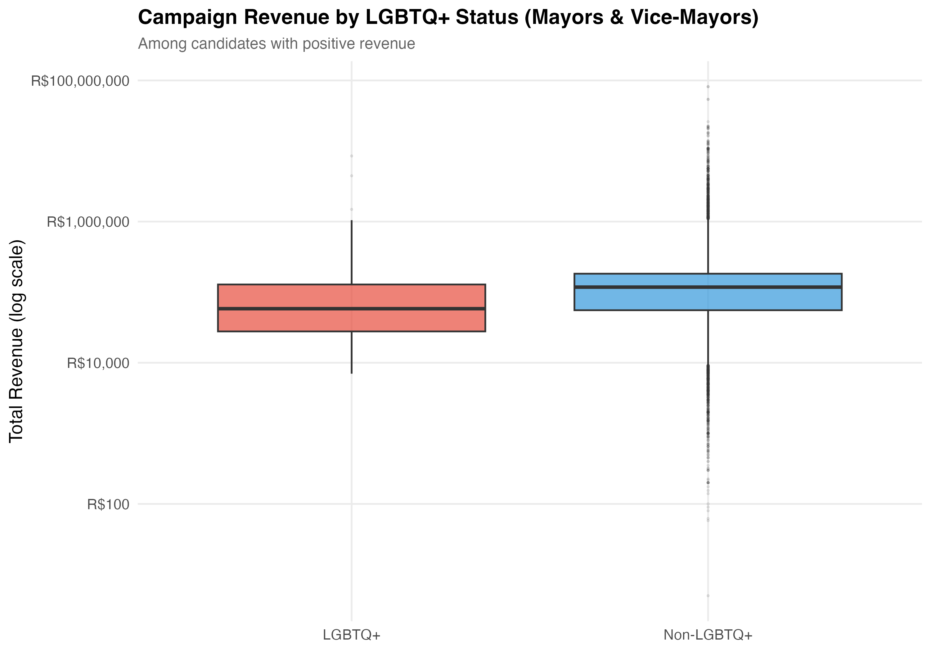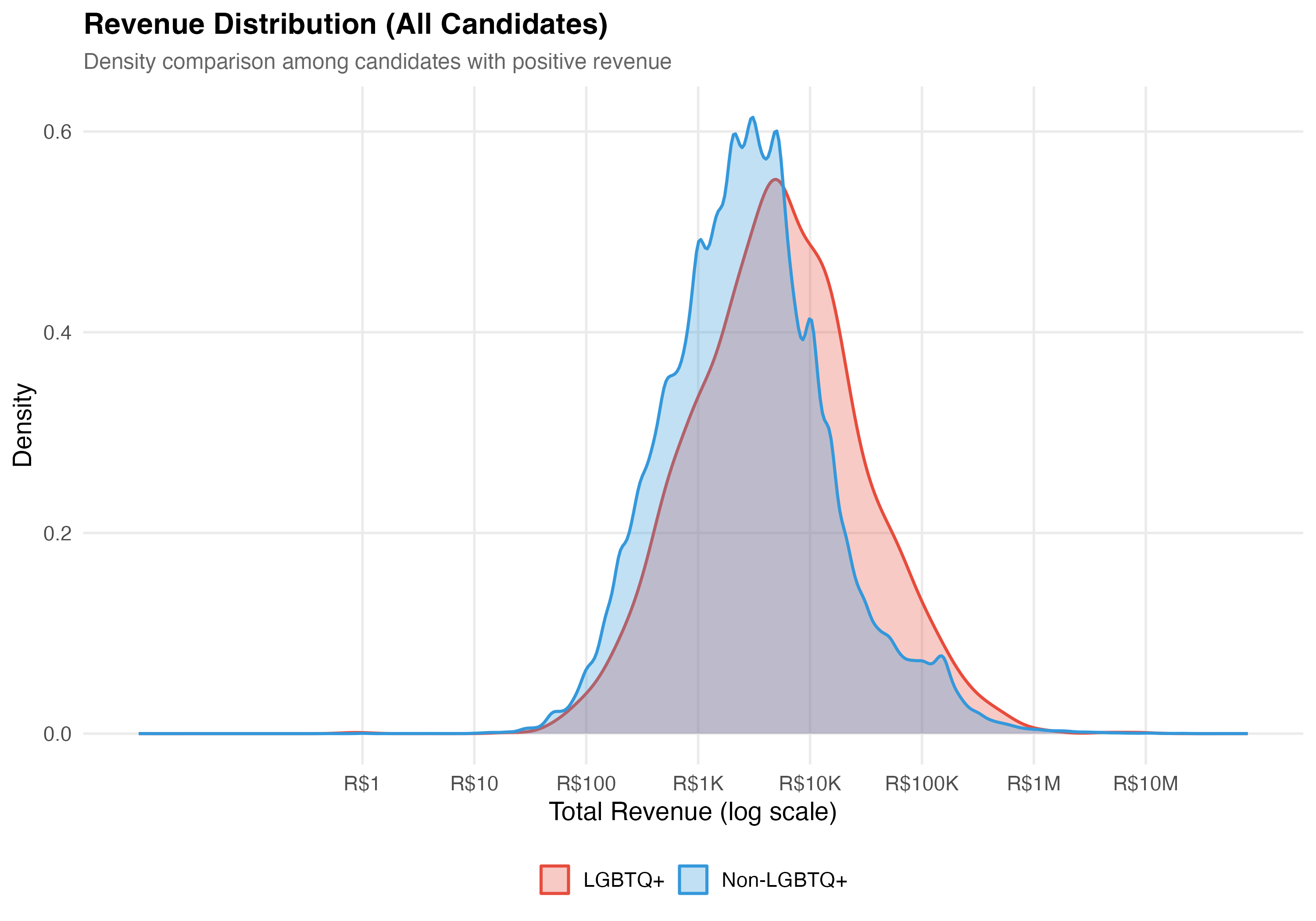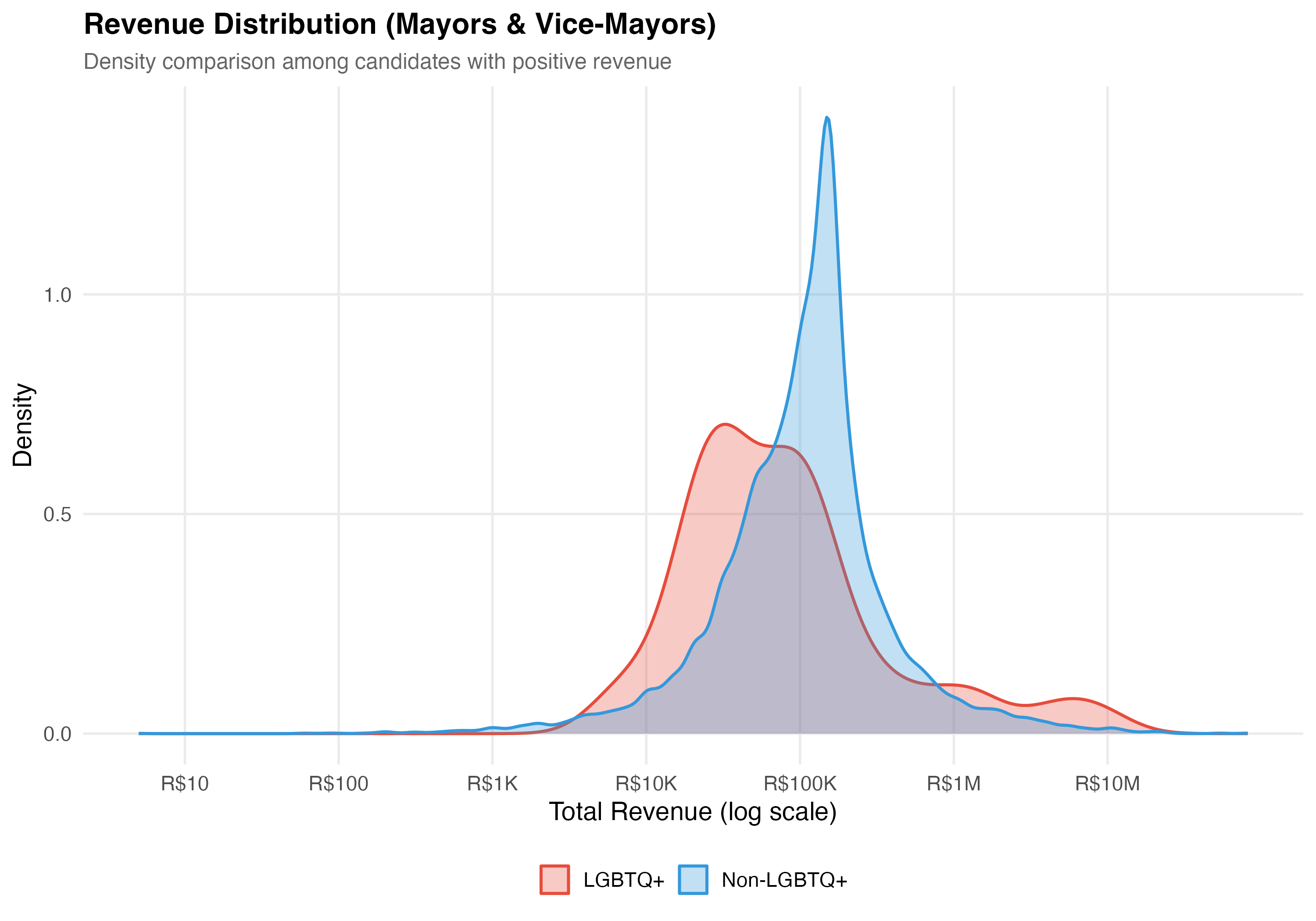 render_lgbtq_revenue <-function(data, tab_name) {# --- Side-by-side comparison table ---cat("### Revenue Comparison\n\n") revenue_comparison <- data %>%mutate(group =if_else(lgbtq_candidate, "LGBTQ+", "Non-LGBTQ+")) %>%group_by(group) %>%summarise(N =format_n(n()),`% Zero Rev.`=format_pct(mean(total_revenue ==0)),`Mean Rev.`=format_brl(mean(total_revenue)),`Median Rev.`=format_brl(median(total_revenue)),`SD Rev.`=format_brl(sd(total_revenue)),`Mean Trans.`=as.character(round(mean(n_transactions), 1)),`Mean Donors`=as.character(round(mean(n_unique_donors), 1)),`% Self-fund`=format_pct100(mean(pct_self)),`% Party`=format_pct100(mean(pct_party)),`% Individual`=format_pct100(mean(pct_individual)),`% Crowdfund`=format_pct100(mean(pct_crowdfunding)),.groups ="drop" ) revenue_comparison %>%pivot_longer(-group, names_to ="Metric", values_to ="value") %>%pivot_wider(names_from = group, values_from = value) %>%cat_kable(align =c("l", "r", "r"))# Compute position-specific stats for callout pos_stats <- data %>%group_by(lgbtq_candidate) %>%summarise(median_rev =median(total_revenue),mean_rev =mean(total_revenue),.groups ="drop" ) lgbtq_med <- pos_stats$median_rev[pos_stats$lgbtq_candidate ==TRUE] non_med <- pos_stats$median_rev[pos_stats$lgbtq_candidate ==FALSE] lgbtq_mn <- pos_stats$mean_rev[pos_stats$lgbtq_candidate ==TRUE] non_mn <- pos_stats$mean_rev[pos_stats$lgbtq_candidate ==FALSE] med_ratio <-if (non_med >0) lgbtq_med / non_med elseNA_real_ mn_ratio <-if (non_mn >0) lgbtq_mn / non_mn elseNA_real_cat("::: {.callout-note}\n")cat("## Revenue Comparison\n")cat(sprintf("In this tab (%s), the median revenue for LGBTQ+ candidates is %s vs. %s for non-LGBTQ+ (ratio: %.2f). ", tab_name, format_brl(lgbtq_med), format_brl(non_med),if (!is.na(med_ratio)) med_ratio else0))cat(sprintf("At the mean: %s vs. %s (ratio: %.2f).\n",format_brl(lgbtq_mn), format_brl(non_mn),if (!is.na(mn_ratio)) mn_ratio else0))cat(":::\n\n")# --- Revenue distribution comparison ---cat("### Revenue Distribution\n\n") pos_rev <- data %>%filter(total_revenue >0)if (nrow(pos_rev) >0) { p_density <- pos_rev %>%mutate(group =if_else(lgbtq_candidate, "LGBTQ+", "Non-LGBTQ+")) %>%ggplot(aes(x =log10(total_revenue), fill = group, color = group)) +geom_density(alpha =0.3, linewidth =0.8) +scale_fill_manual(values = pal_lgbtq, name =NULL) +scale_color_manual(values = pal_lgbtq, name =NULL) +scale_x_continuous(breaks =0:7,labels =c("R$1", "R$10", "R$100", "R$1K", "R$10K", "R$100K", "R$1M", "R$10M") ) +labs(x ="Total Revenue (log scale)",y ="Density",title =paste0("Revenue Distribution (", tab_name, ")"),subtitle ="Density comparison among candidates with positive revenue" )cat_plot(p_density, paste0("05-density-revenue-", pos_suffix(tab_name)))# Box plot p_box <- pos_rev %>%mutate(group =if_else(lgbtq_candidate, "LGBTQ+", "Non-LGBTQ+")) %>%ggplot(aes(x = group, y = total_revenue, fill = group)) +geom_boxplot(alpha =0.7, outlier.alpha =0.1, outlier.size =0.5) +scale_y_log10(labels =label_dollar(prefix ="R$", big.mark =",")) +scale_fill_manual(values = pal_lgbtq, guide ="none") +labs(x =NULL,y ="Total Revenue (log scale)",title =paste0("Campaign Revenue by LGBTQ+ Status (", tab_name, ")"),subtitle ="Among candidates with positive revenue" )cat_plot(p_box, paste0("05-box-revenue-", pos_suffix(tab_name))) }# --- Funding composition ---cat("### Funding Source Composition\n\n") p_comp <- data %>%mutate(group =if_else(lgbtq_candidate, "LGBTQ+", "Non-LGBTQ+")) %>%group_by(group) %>%summarise(`Self-funding`=sum(self_funding_amt, na.rm =TRUE),`Party funding`=sum(party_funding_amt, na.rm =TRUE),`Individual donors`=sum(individual_funding_amt, na.rm =TRUE),`Crowdfunding`=sum(crowdfunding_amt, na.rm =TRUE),.groups ="drop" ) %>%pivot_longer(-group, names_to ="source", values_to ="total") %>%group_by(group) %>%mutate(pct = total /sum(total)) %>%ungroup() %>%mutate(source =factor(source,levels =c("Party funding", "Self-funding","Individual donors", "Crowdfunding"))) %>%ggplot(aes(x = group, y = pct, fill = source)) +geom_col(alpha =0.9, width =0.6) +geom_text(aes(label =format_pct(pct)),position =position_stack(vjust =0.5), size =3.5, color ="white",fontface ="bold") +scale_fill_brewer(palette ="Set2", name ="Funding Source") +scale_y_continuous(labels = percent) +labs(x =NULL,y ="Share of Total Revenue",title =paste0("Funding Portfolios (", tab_name, ")"),subtitle ="Revenue composition by source for LGBTQ+ vs Non-LGBTQ+ candidates" )cat_plot(p_comp, paste0("05-composition-lgbtq-", pos_suffix(tab_name)))}render_position_tabset(render_lgbtq_revenue, df)