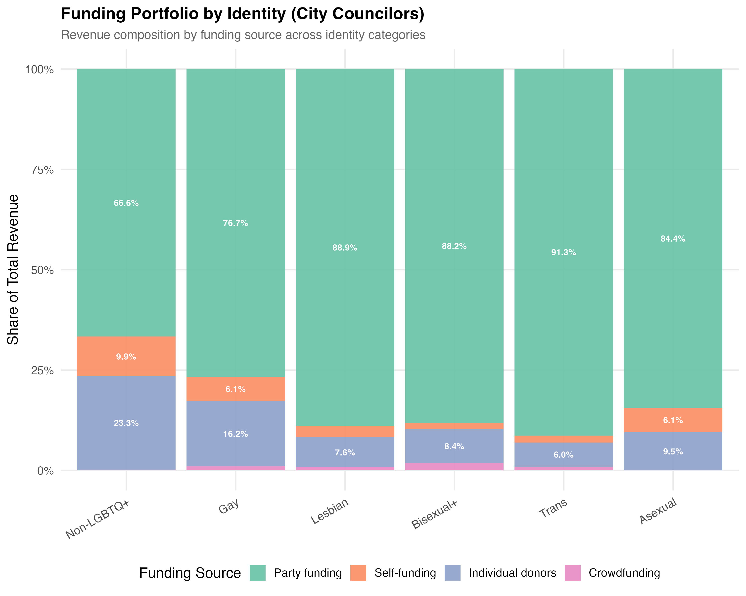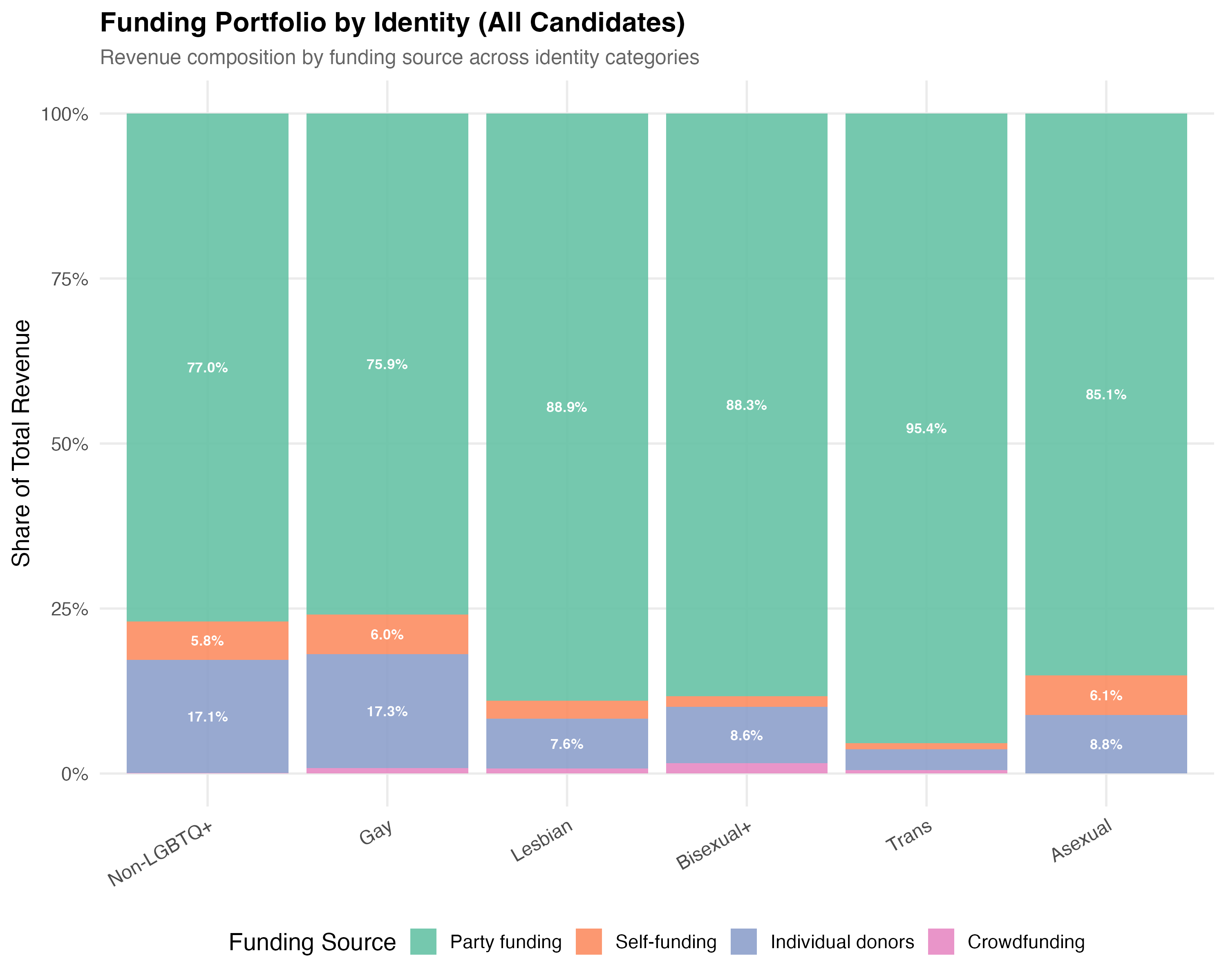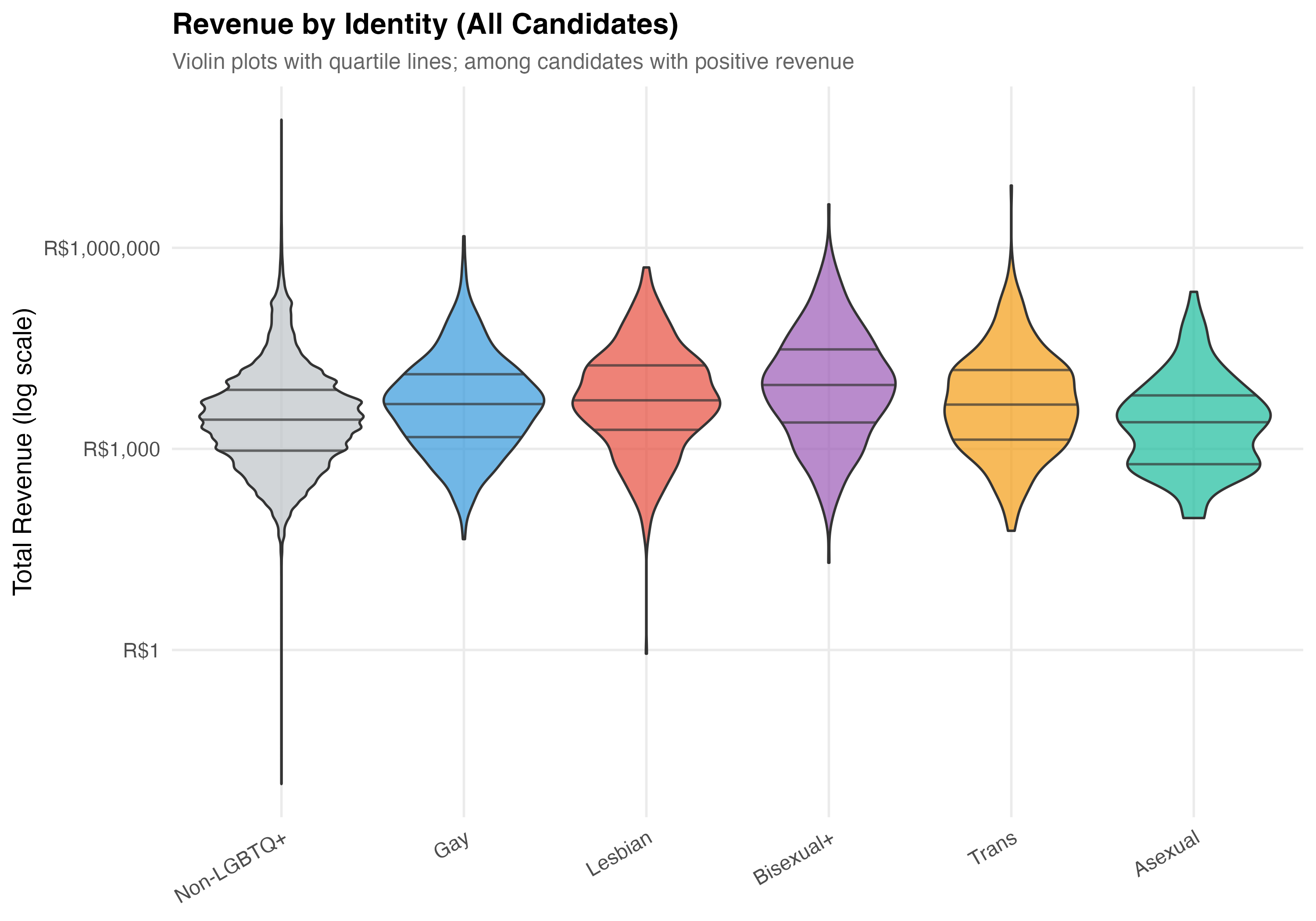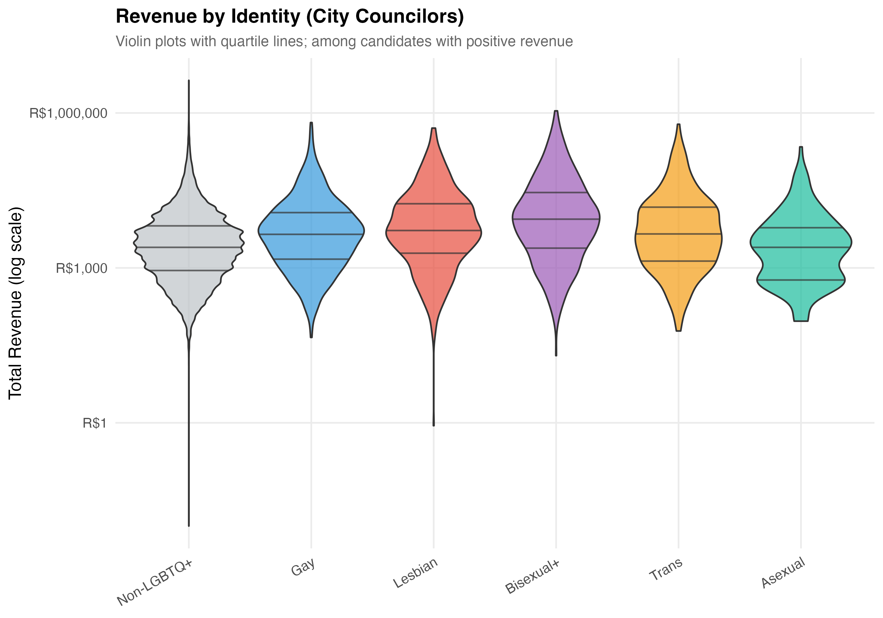Identity-specific patterns: Across 5 identity categories, Bisexual+ candidates have the highest median revenue (R$6,460) and Asexual candidates the lowest (R$1,330). Bisexual+ candidates rely most heavily on party funding (58.9% of revenue on average).