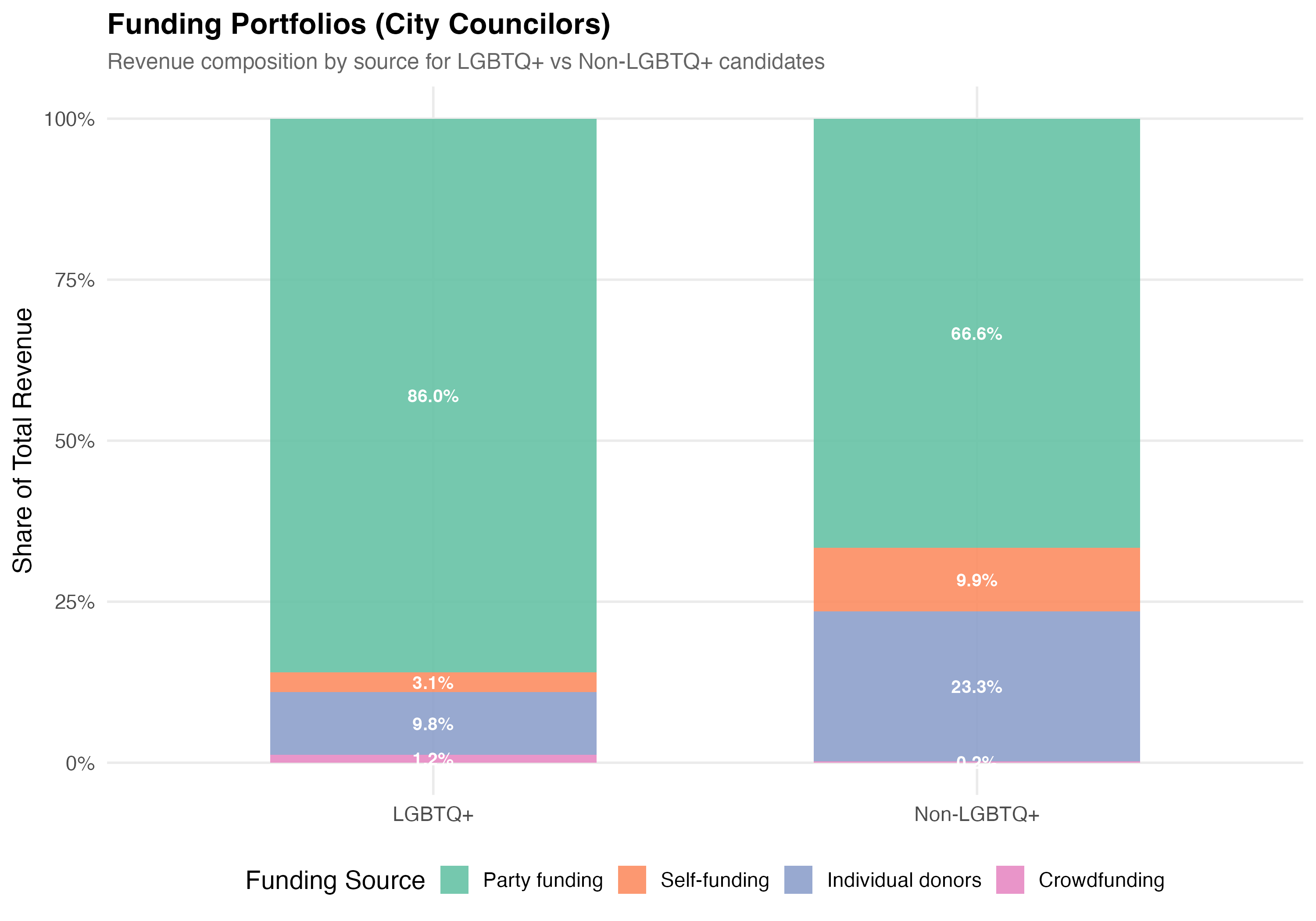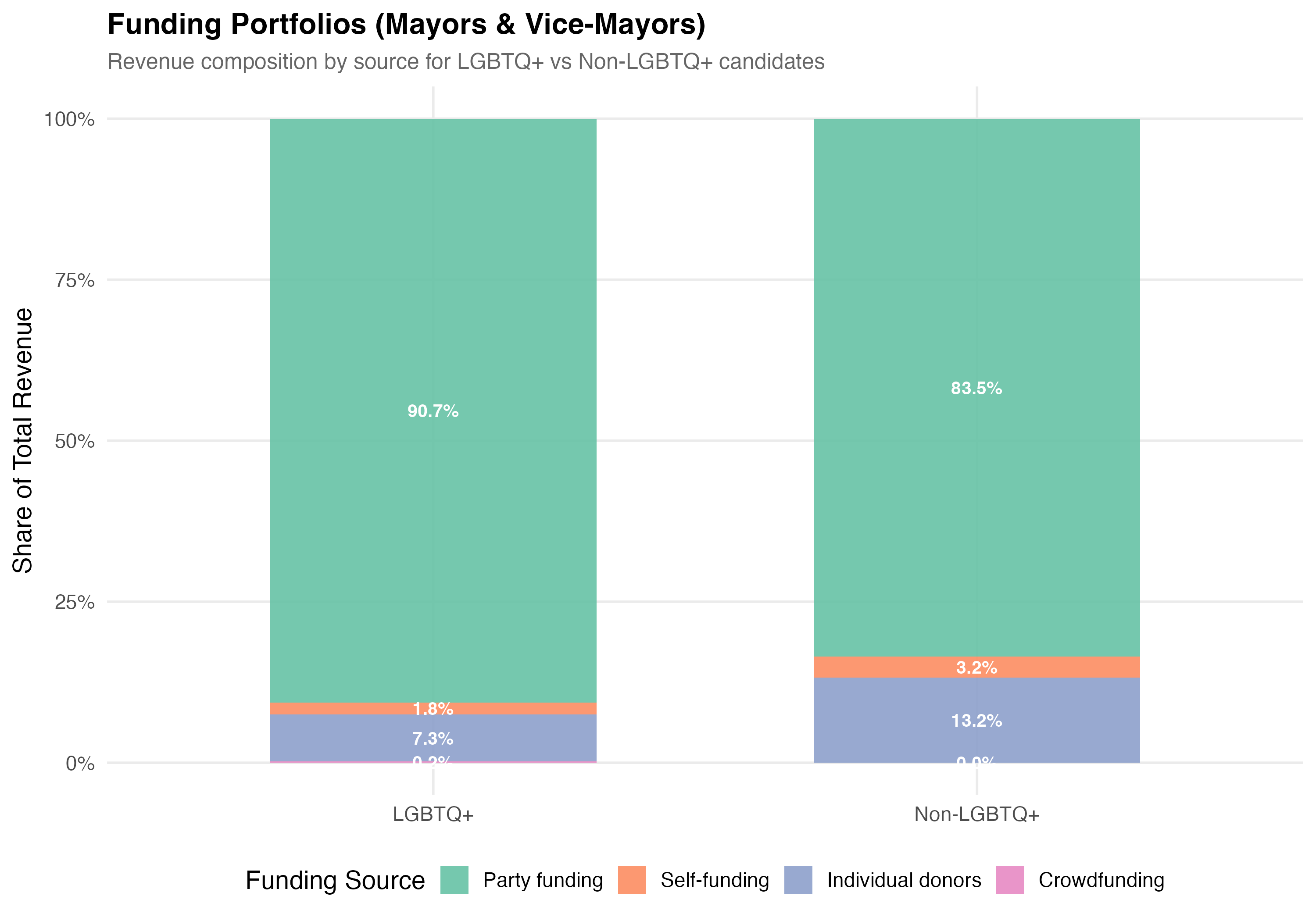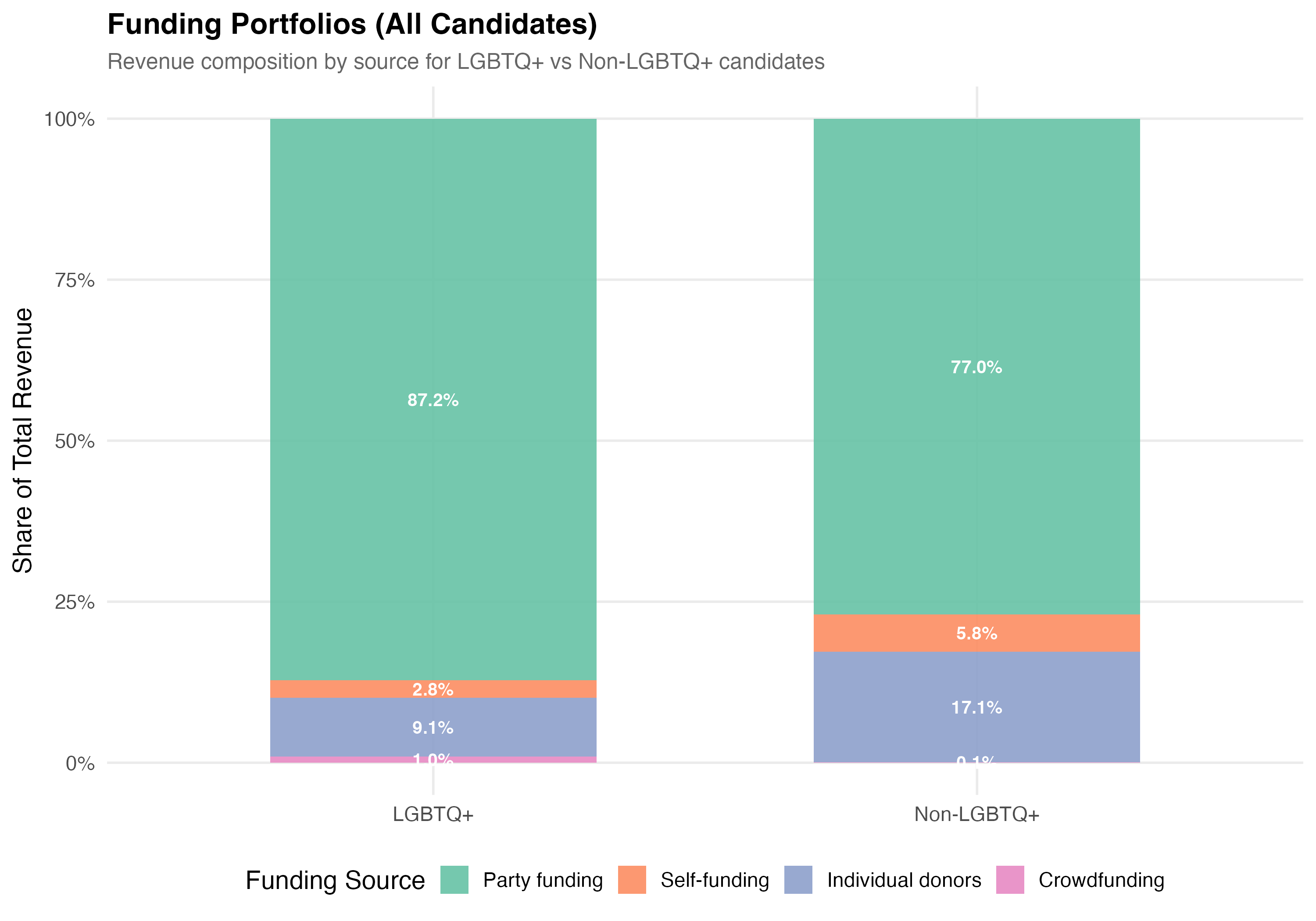 Funding composition: LGBTQ+ candidates have a higher average party funding share (47.6% vs 27.2%) and a lower average individual donor share (12.6% vs 17.3%) compared to non-LGBTQ+ candidates.