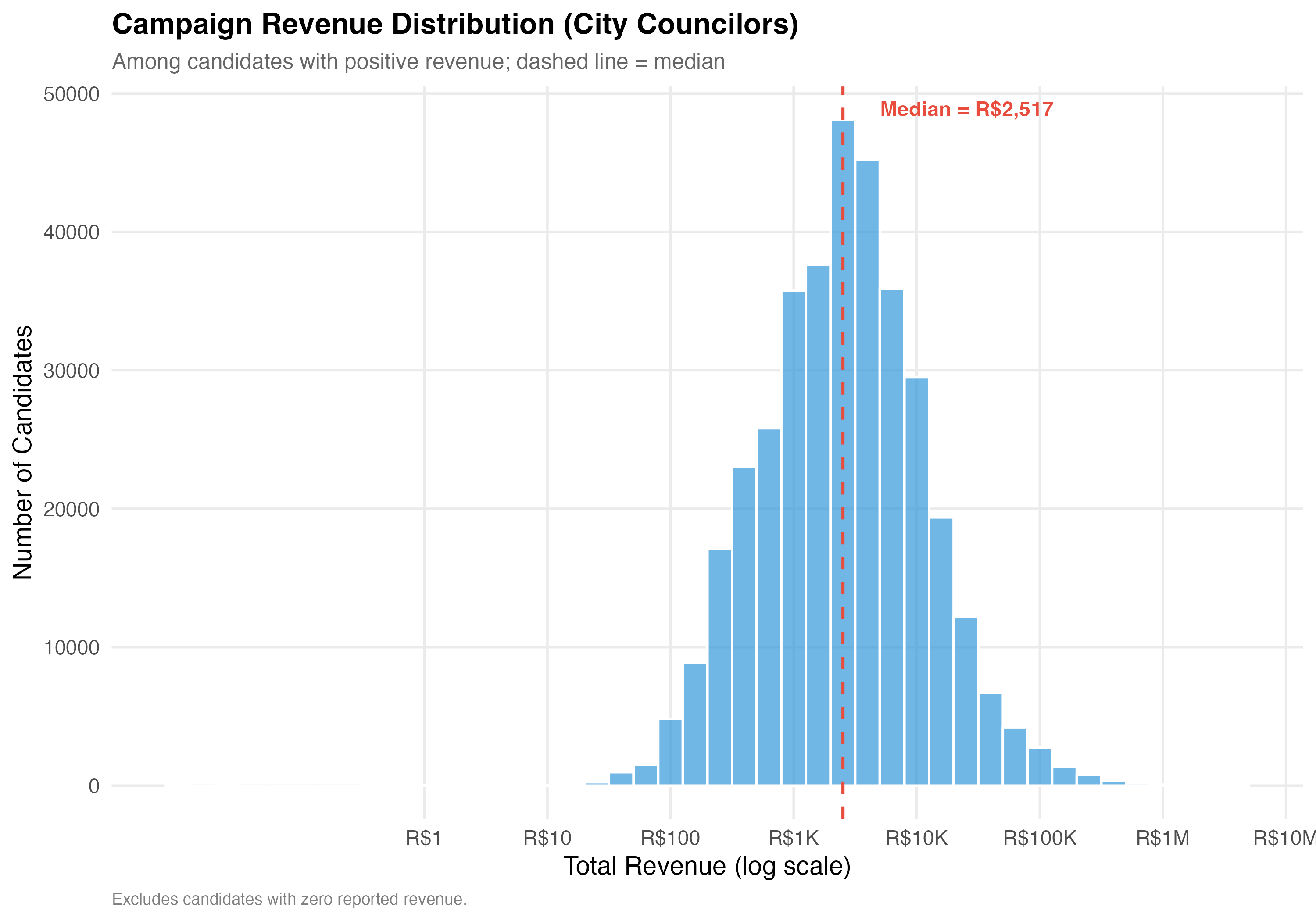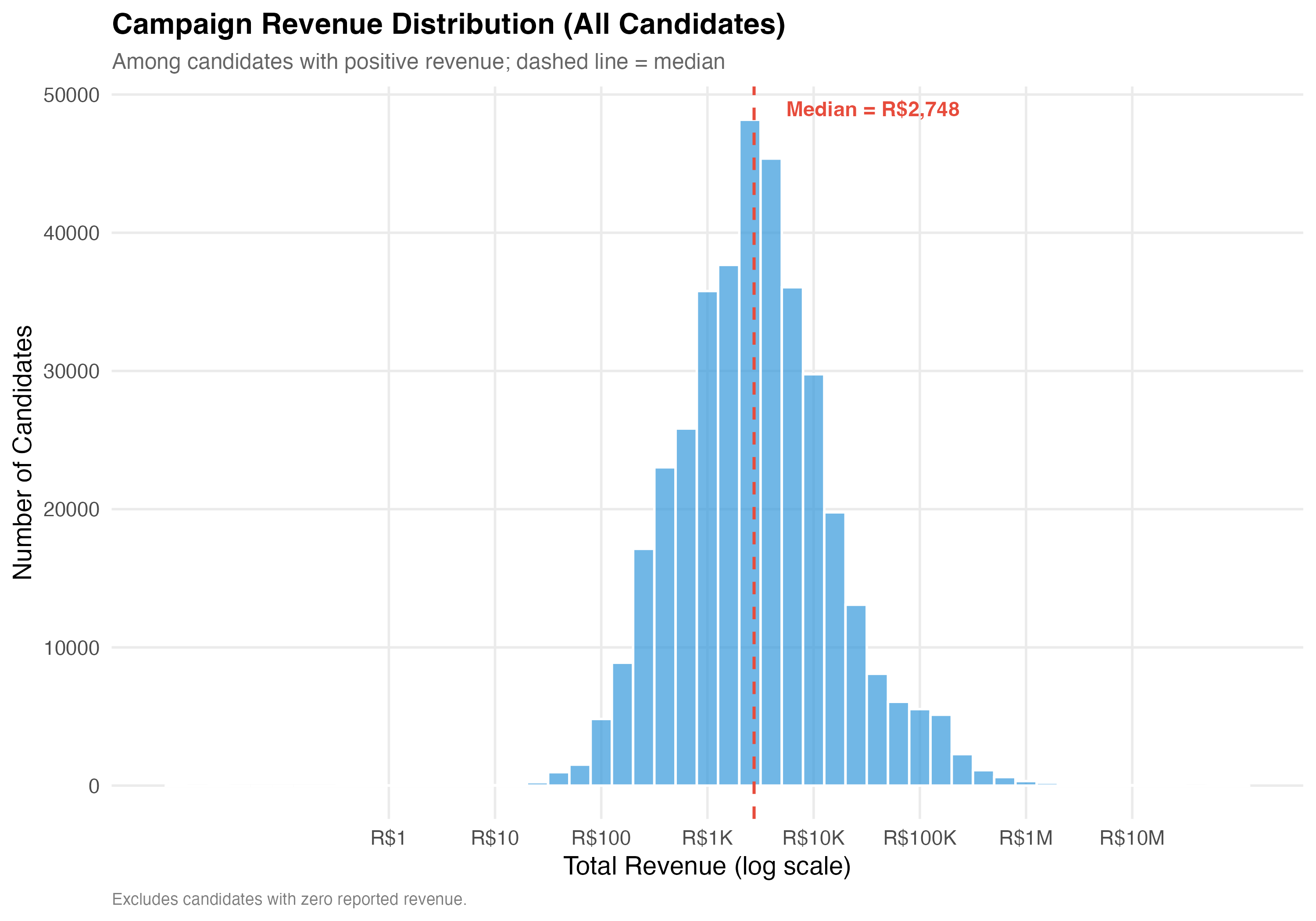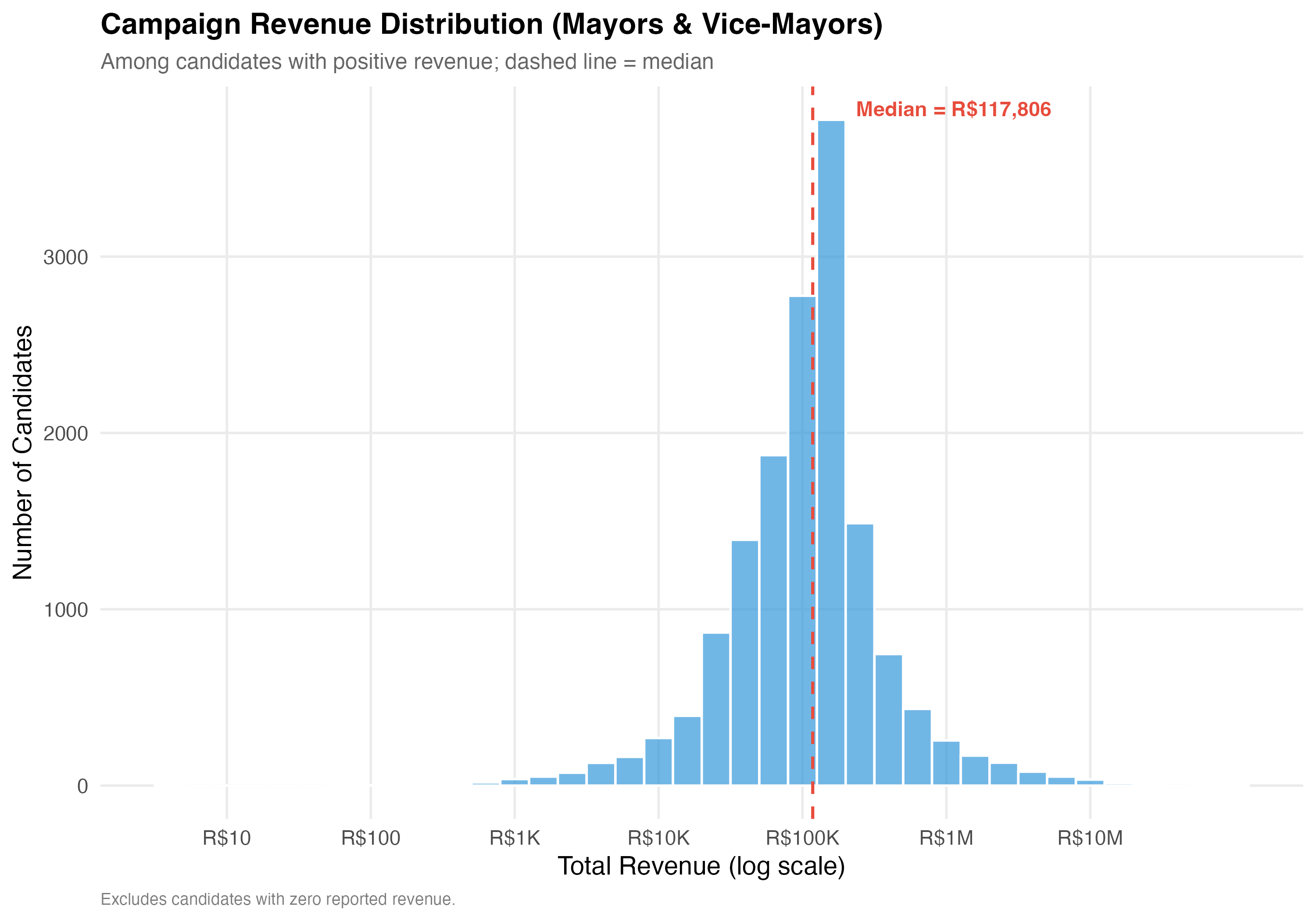 render_general_revenue <-function(data, tab_name) {# --- Revenue summary statistics ---cat("### Revenue Summary Statistics\n\n") revenue_stats <- data %>%summarise(N =format_n(n()),`Zero Revenue`=format_n(sum(total_revenue ==0)),`% Zero`=format_pct(mean(total_revenue ==0)),Mean =format_brl(mean(total_revenue)),SD =format_brl(sd(total_revenue)),Median =format_brl(median(total_revenue)),P25 =format_brl(quantile(total_revenue, 0.25)),P75 =format_brl(quantile(total_revenue, 0.75)),P99 =format_brl(quantile(total_revenue, 0.99)),Max =format_brl(max(total_revenue)) ) revenue_stats %>%pivot_longer(everything(), names_to ="Statistic", values_to ="Value") %>%cat_kable(align =c("l", "r"))# --- Revenue distribution histogram ---cat("### Revenue Distribution (Log Scale)\n\n") pos_rev <- data %>%filter(total_revenue >0)if (nrow(pos_rev) >0) { med_val <-median(pos_rev$total_revenue) p_dist <- pos_rev %>%ggplot(aes(x =log10(total_revenue))) +geom_histogram(binwidth =0.2, fill ="#3498DB", alpha =0.7, color ="white") +geom_vline(xintercept =log10(med_val),linetype ="dashed", color ="#E74C3C", linewidth =0.8) +annotate("text",x =log10(med_val) +0.3, y =Inf, vjust =2, hjust =0,label =paste0("Median = ", format_brl(med_val)),color ="#E74C3C", fontface ="bold", size =4) +scale_x_continuous(breaks =0:7,labels =c("R$1", "R$10", "R$100", "R$1K", "R$10K", "R$100K", "R$1M", "R$10M") ) +labs(x ="Total Revenue (log scale)",y ="Number of Candidates",title =paste0("Campaign Revenue Distribution (", tab_name, ")"),subtitle ="Among candidates with positive revenue; dashed line = median",caption ="Excludes candidates with zero reported revenue." )cat_plot(p_dist, paste0("05-revenue-dist-", pos_suffix(tab_name))) }# --- Revenue composition ---cat("### Revenue Composition by Source\n\n") comp <- data %>%summarise(`Self-funding`=sum(self_funding_amt, na.rm =TRUE),`Party funding`=sum(party_funding_amt, na.rm =TRUE),`Individual donors`=sum(individual_funding_amt, na.rm =TRUE),`Crowdfunding`=sum(crowdfunding_amt, na.rm =TRUE),`Other`=sum(total_revenue, na.rm =TRUE) -sum(self_funding_amt, na.rm =TRUE) -sum(party_funding_amt, na.rm =TRUE) -sum(individual_funding_amt, na.rm =TRUE) -sum(crowdfunding_amt, na.rm =TRUE) ) %>%pivot_longer(everything(), names_to ="source", values_to ="total") %>%mutate(pct = total /sum(total),source =factor(source,levels =c("Party funding", "Self-funding", "Individual donors","Crowdfunding", "Other")) ) p_comp <-ggplot(comp, aes(x ="", y = pct, fill = source)) +geom_col(width =0.6, alpha =0.9) +geom_text(aes(label =paste0(format_pct(pct), "\n", format_brl(total))),position =position_stack(vjust =0.5), size =3.5, color ="white",fontface ="bold") +coord_flip() +scale_fill_brewer(palette ="Set2", name ="Funding Source") +scale_y_continuous(labels = percent) +labs(x =NULL,y ="Share of Total Revenue",title =paste0("Where the Money Comes From (", tab_name, ")"),subtitle ="Aggregate revenue composition across all candidates" )cat_plot(p_comp, paste0("05-composition-overall-", pos_suffix(tab_name)))}render_position_tabset(render_general_revenue, df)