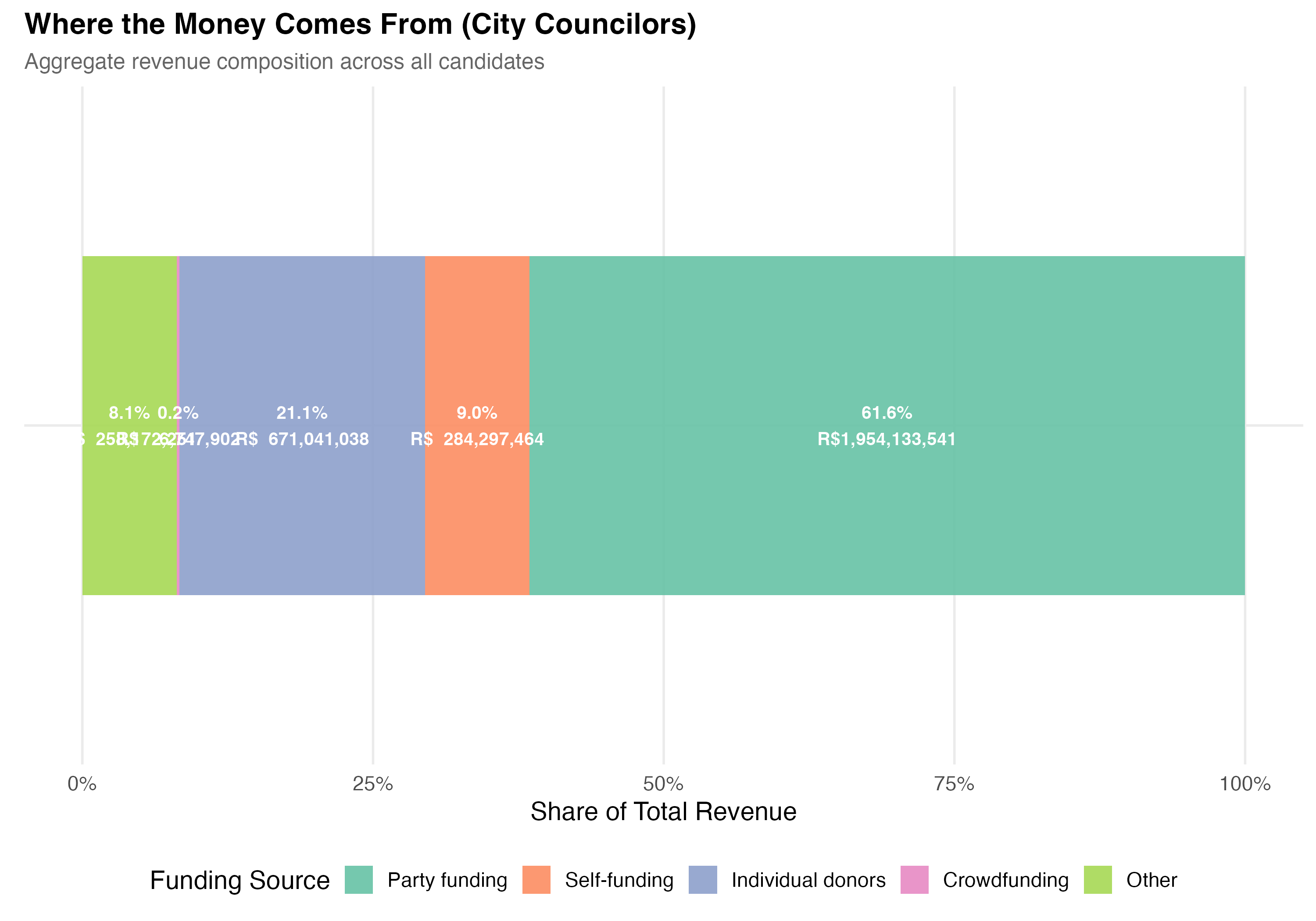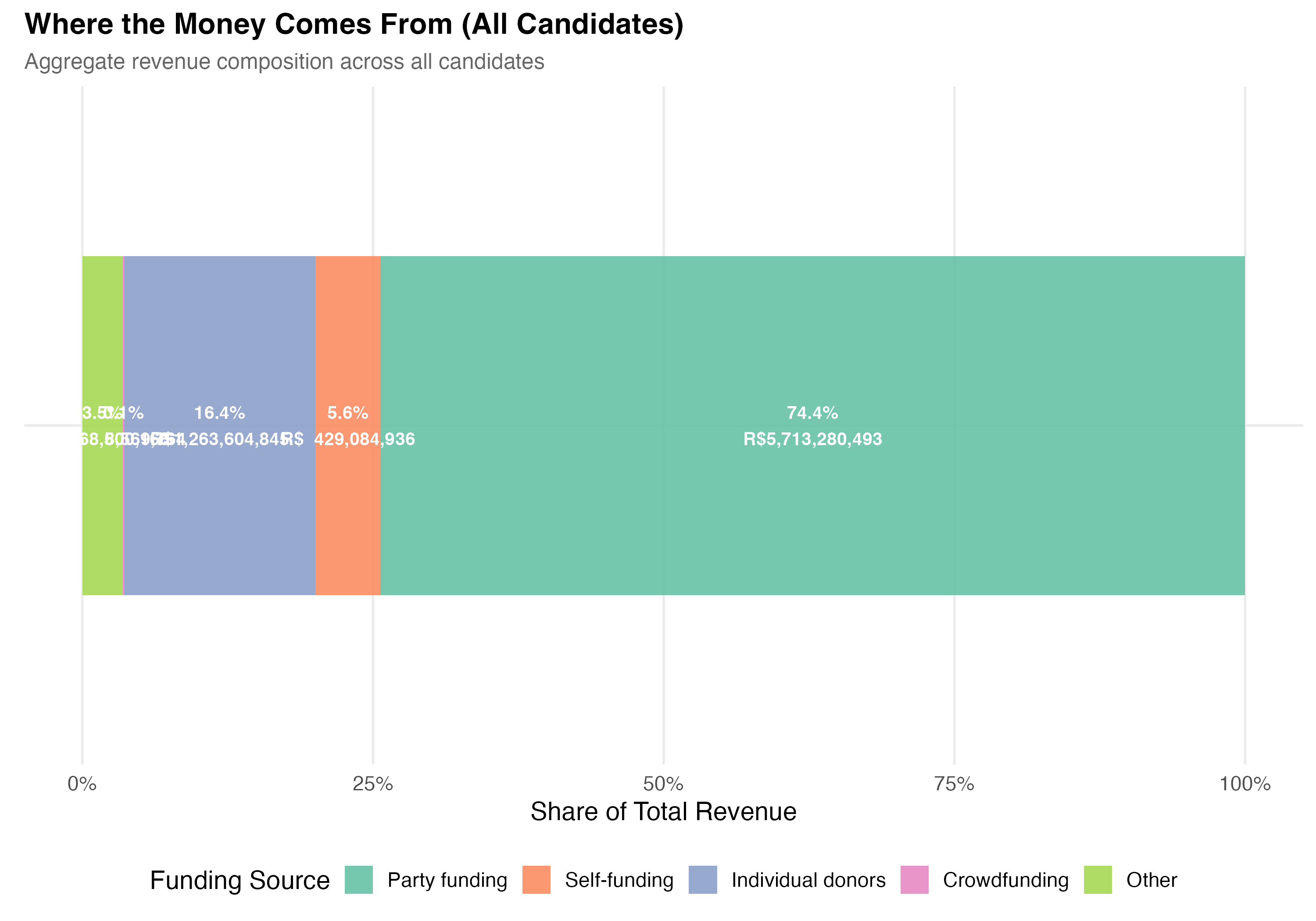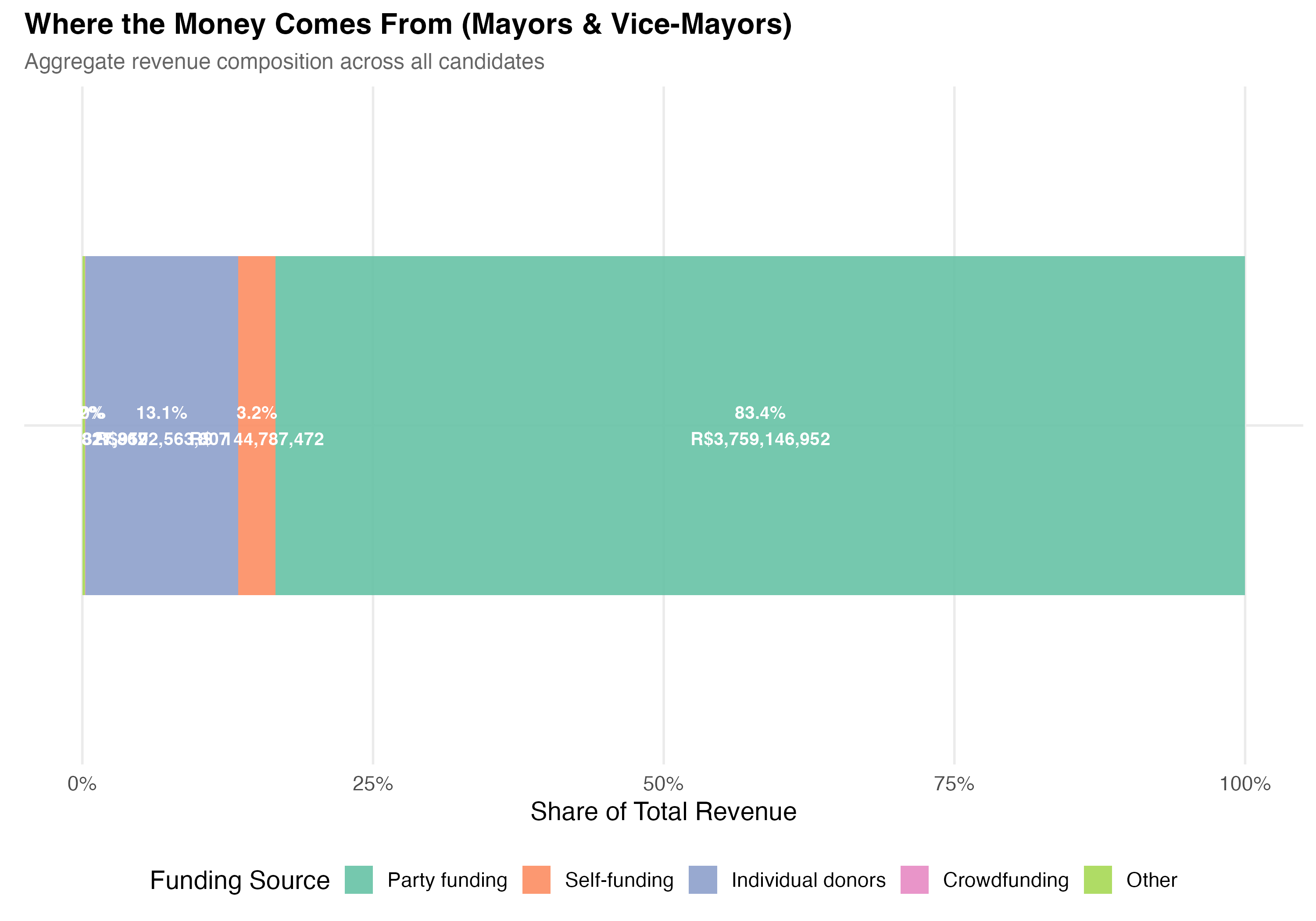 render_general_revenue <-function(data, tab_name) {# --- Revenue summary statistics ---cat("### Revenue Summary Statistics\n\n") revenue_stats <- data %>%summarise(N =format_n(n()),`Zero Revenue`=format_n(sum(total_revenue ==0)),`% Zero`=format_pct(mean(total_revenue ==0)),Mean =format_brl(mean(total_revenue)),SD =format_brl(sd(total_revenue)),Median =format_brl(median(total_revenue)),P25 =format_brl(quantile(total_revenue, 0.25)),P75 =format_brl(quantile(total_revenue, 0.75)),P99 =format_brl(quantile(total_revenue, 0.99)),Max =format_brl(max(total_revenue)) ) revenue_stats %>%pivot_longer(everything(), names_to ="Statistic", values_to ="Value") %>%cat_kable(align =c("l", "r"))# --- Revenue distribution histogram ---cat("### Revenue Distribution (Log Scale)\n\n") pos_rev <- data %>%filter(total_revenue >0)if (nrow(pos_rev) >0) { med_val <-median(pos_rev$total_revenue) p_dist <- pos_rev %>%ggplot(aes(x =log10(total_revenue))) +geom_histogram(binwidth =0.2, fill ="#3498DB", alpha =0.7, color ="white") +geom_vline(xintercept =log10(med_val),linetype ="dashed", color ="#E74C3C", linewidth =0.8) +annotate("text",x =log10(med_val) +0.3, y =Inf, vjust =2, hjust =0,label =paste0("Median = ", format_brl(med_val)),color ="#E74C3C", fontface ="bold", size =4) +scale_x_continuous(breaks =0:7,labels =c("R$1", "R$10", "R$100", "R$1K", "R$10K", "R$100K", "R$1M", "R$10M") ) +labs(x ="Total Revenue (log scale)",y ="Number of Candidates",title =paste0("Campaign Revenue Distribution (", tab_name, ")"),subtitle ="Among candidates with positive revenue; dashed line = median",caption ="Excludes candidates with zero reported revenue." )cat_plot(p_dist, paste0("05-revenue-dist-", pos_suffix(tab_name))) }# --- Revenue composition ---cat("### Revenue Composition by Source\n\n") comp <- data %>%summarise(`Self-funding`=sum(self_funding_amt, na.rm =TRUE),`Party funding`=sum(party_funding_amt, na.rm =TRUE),`Individual donors`=sum(individual_funding_amt, na.rm =TRUE),`Crowdfunding`=sum(crowdfunding_amt, na.rm =TRUE),`Other`=sum(total_revenue, na.rm =TRUE) -sum(self_funding_amt, na.rm =TRUE) -sum(party_funding_amt, na.rm =TRUE) -sum(individual_funding_amt, na.rm =TRUE) -sum(crowdfunding_amt, na.rm =TRUE) ) %>%pivot_longer(everything(), names_to ="source", values_to ="total") %>%mutate(pct = total /sum(total),source =factor(source,levels =c("Party funding", "Self-funding", "Individual donors","Crowdfunding", "Other")) ) p_comp <-ggplot(comp, aes(x ="", y = pct, fill = source)) +geom_col(width =0.6, alpha =0.9) +geom_text(aes(label =paste0(format_pct(pct), "\n", format_brl(total))),position =position_stack(vjust =0.5), size =3.5, color ="white",fontface ="bold") +coord_flip() +scale_fill_brewer(palette ="Set2", name ="Funding Source") +scale_y_continuous(labels = percent) +labs(x =NULL,y ="Share of Total Revenue",title =paste0("Where the Money Comes From (", tab_name, ")"),subtitle ="Aggregate revenue composition across all candidates" )cat_plot(p_comp, paste0("05-composition-overall-", pos_suffix(tab_name)))}render_position_tabset(render_general_revenue, df)