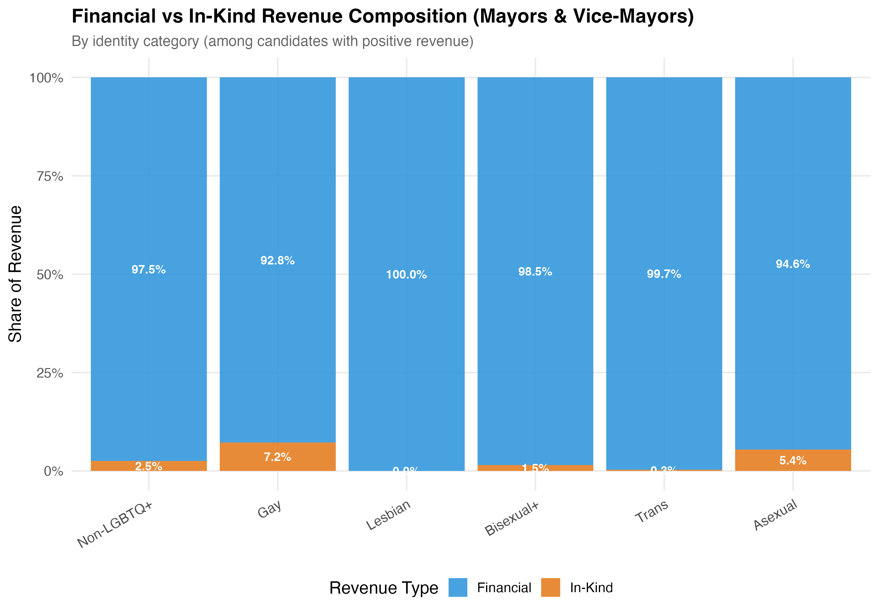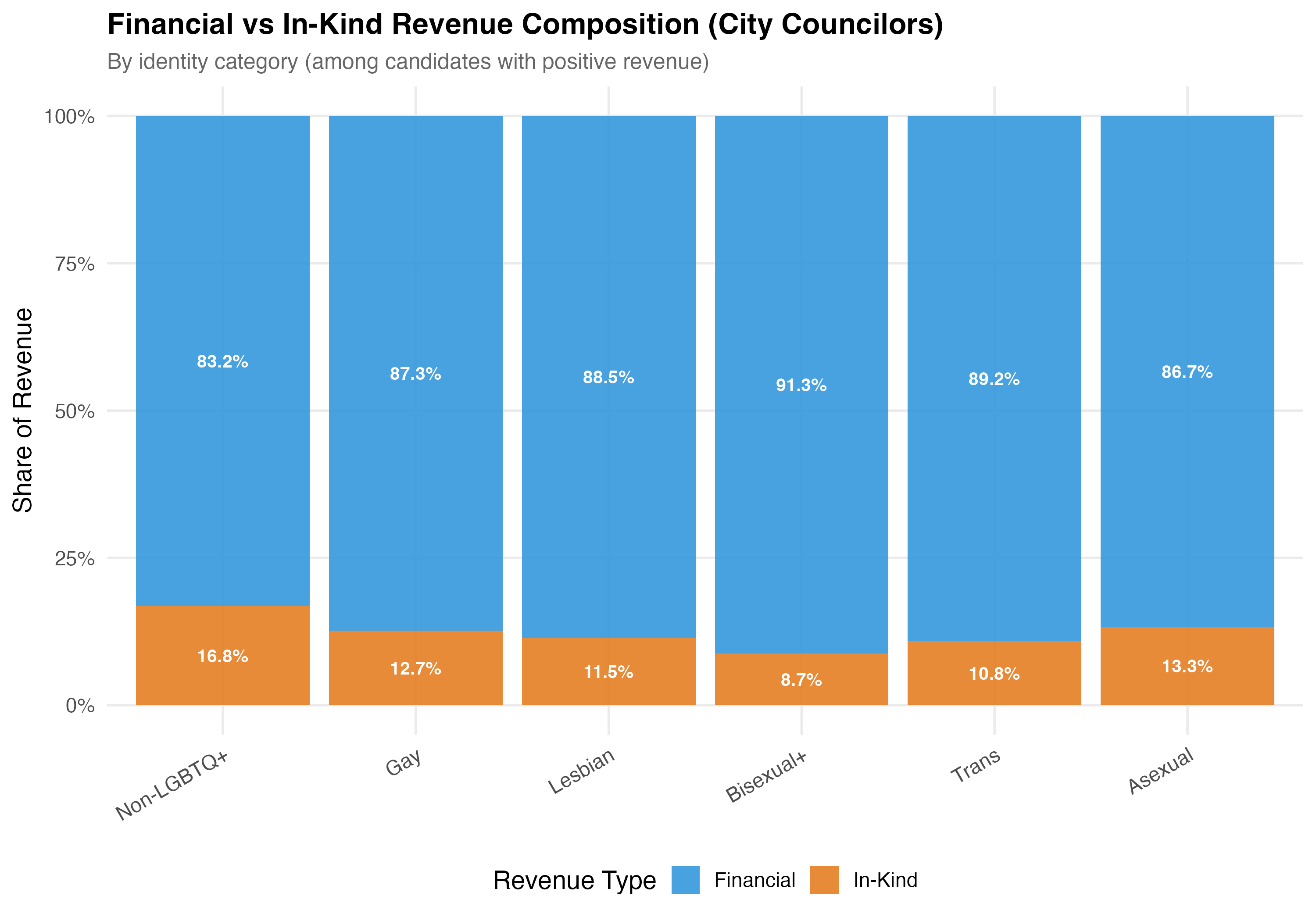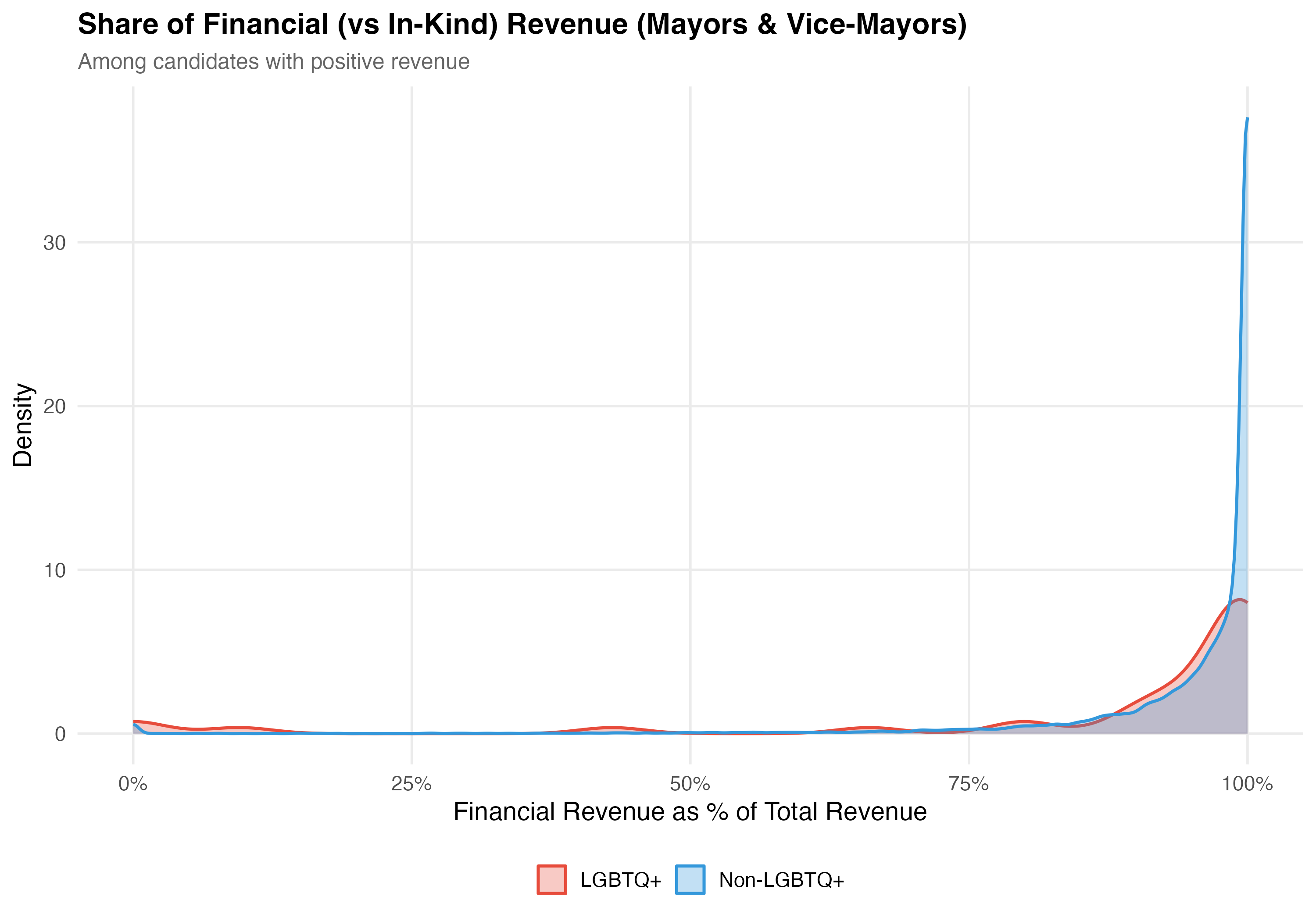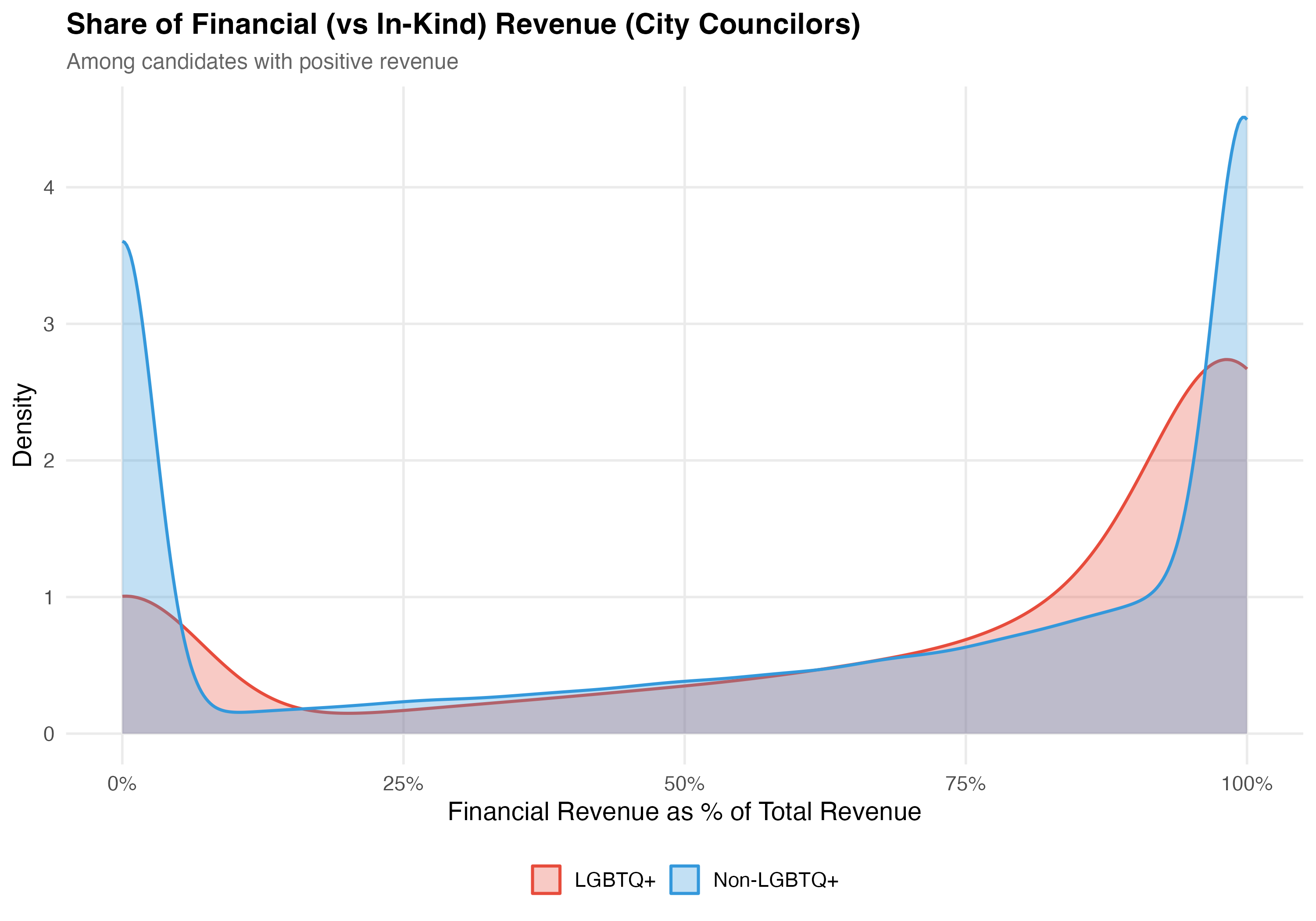 render_financial_inkind <-function(data, tab_name) {# --- Financial vs In-Kind comparison table ---cat("### Financial vs In-Kind Revenue\n\n") data %>%mutate(group =if_else(lgbtq_candidate, "LGBTQ+", "Non-LGBTQ+")) %>%group_by(group) %>%summarise(N =format_n(n()),`Total Financial`=format_brl(sum(financial_amt, na.rm =TRUE)),`Total In-Kind`=format_brl(sum(inkind_amt, na.rm =TRUE)),`Mean % Financial`=format_pct100(mean(pct_financial, na.rm =TRUE)),`Mean % In-Kind`=format_pct100(mean(pct_inkind, na.rm =TRUE)),`Median % Financial`=format_pct100(median(pct_financial, na.rm =TRUE)),`Median % In-Kind`=format_pct100(median(pct_inkind, na.rm =TRUE)),.groups ="drop" ) %>%rename(Group = group) %>%cat_kable(align =c("l", "r", "r", "r", "r", "r", "r", "r"))# --- Density plot of financial share ---cat("### Financial Share Distribution\n\n") pos_rev <- data %>%filter(total_revenue >0)if (nrow(pos_rev) >0) { p_density <- pos_rev %>%mutate(group =if_else(lgbtq_candidate, "LGBTQ+", "Non-LGBTQ+")) %>%ggplot(aes(x = pct_financial /100, fill = group, color = group)) +geom_density(alpha =0.3, linewidth =0.8) +scale_fill_manual(values = pal_lgbtq, name =NULL) +scale_color_manual(values = pal_lgbtq, name =NULL) +scale_x_continuous(labels = percent, limits =c(0, 1)) +labs(x ="Financial Revenue as % of Total Revenue",y ="Density",title =paste0("Share of Financial (vs In-Kind) Revenue (", tab_name, ")"),subtitle ="Among candidates with positive revenue" )cat_plot(p_density, paste0("05-financial-inkind-density-", pos_suffix(tab_name))) }# --- Stacked bar by identity category ---cat("### Financial vs In-Kind by Identity\n\n") p_identity <- data %>%filter(total_revenue >0) %>%mutate(plot_category =if_else(lgbtq_candidate, as.character(lgbt_category), "Non-LGBTQ+"),plot_category =factor(plot_category,levels =c("Non-LGBTQ+", "Gay", "Lesbian", "Bisexual+","Trans", "Asexual")) ) %>%filter(!is.na(plot_category)) %>%group_by(plot_category) %>%summarise(Financial =sum(financial_amt, na.rm =TRUE),`In-Kind`=sum(inkind_amt, na.rm =TRUE),.groups ="drop" ) %>%pivot_longer(-plot_category, names_to ="type", values_to ="total") %>%group_by(plot_category) %>%mutate(pct = total /sum(total)) %>%ungroup() %>%ggplot(aes(x = plot_category, y = pct, fill = type)) +geom_col(alpha =0.9) +geom_text(aes(label =format_pct(pct)),position =position_stack(vjust =0.5), size =3.5, color ="white",fontface ="bold") +scale_fill_manual(values =c("Financial"="#3498DB", "In-Kind"="#E67E22"),name ="Revenue Type") +scale_y_continuous(labels = percent) +labs(x =NULL,y ="Share of Revenue",title =paste0("Financial vs In-Kind Revenue Composition (", tab_name, ")"),subtitle ="By identity category (among candidates with positive revenue)" ) +theme(axis.text.x =element_text(angle =30, hjust =1))cat_plot(p_identity, paste0("05-financial-inkind-identity-", pos_suffix(tab_name)))cat("::: {.callout-note}\n")cat("## Financial vs. In-Kind\n")cat("Financial contributions are direct monetary transfers (cash, PIX, bank transfers). ")cat("In-kind contributions are non-monetary goods and services assigned a monetary value ")cat("for accounting purposes. The table and density plot above compare these two categories ")cat("across LGBTQ+ and non-LGBTQ+ candidates.\n")cat(":::\n\n")}render_position_tabset(render_financial_inkind, df)