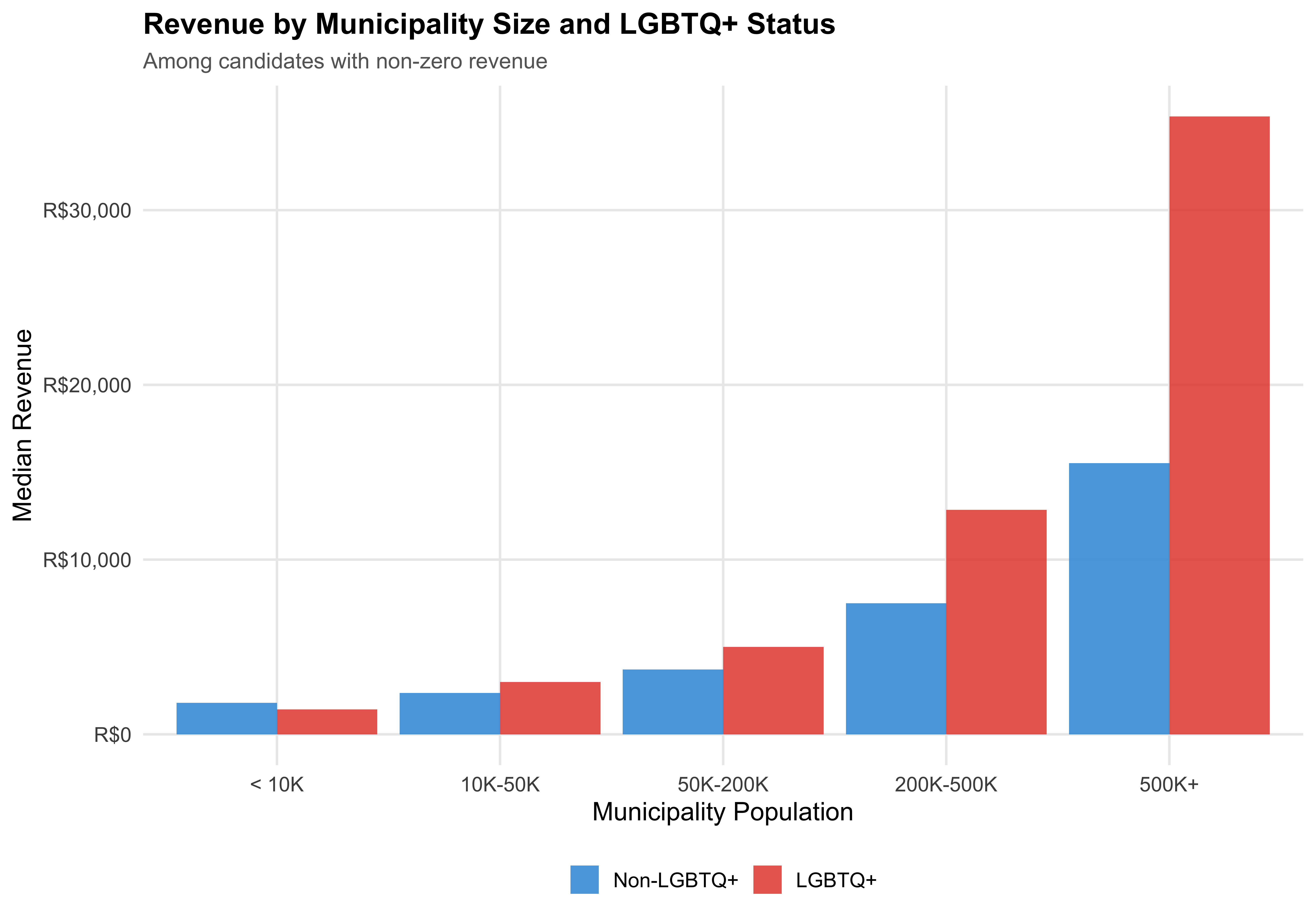 ggplot(rev_by_pop, aes(x = pop_bracket, y = median_rev, fill = lgbtq_label)) +geom_col(position ="dodge", alpha =0.85) +scale_y_continuous(labels = scales::label_dollar(prefix ="R$", big.mark =",")) +scale_fill_manual(values = pal_lgbtq) +labs(x ="Municipality Population",y ="Median Revenue",fill =NULL,title ="Revenue by Municipality Size and LGBTQ+ Status",subtitle ="Among candidates with non-zero revenue" )save_figure(last_plot(), "05_revenue_by_pop_bracket")