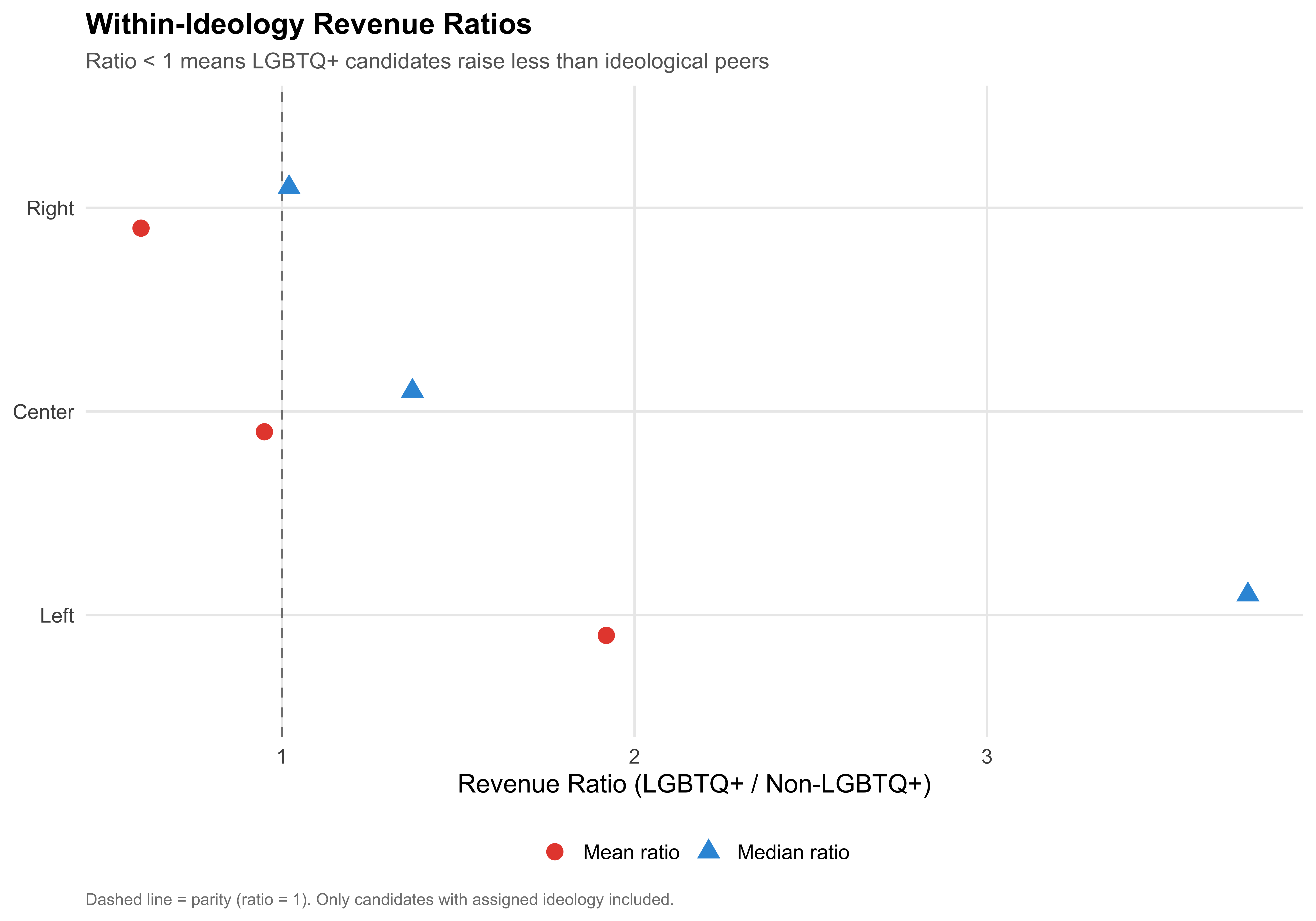 Within-ideology patterns: Of 3 ideological blocs examined, 2 show a mean revenue ratio below 1 (LGBTQ+ candidates raising less than ideological peers) and 1 show a ratio above 1.