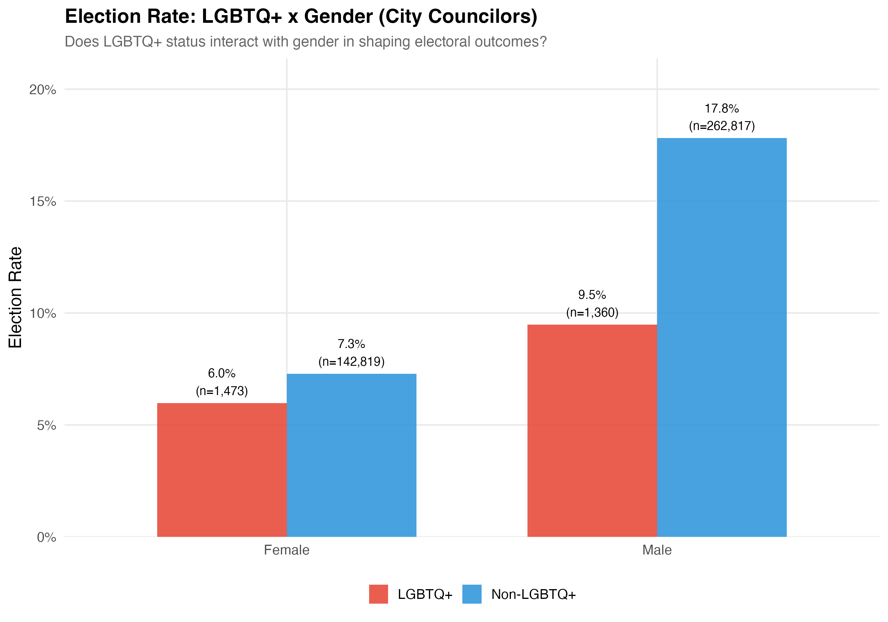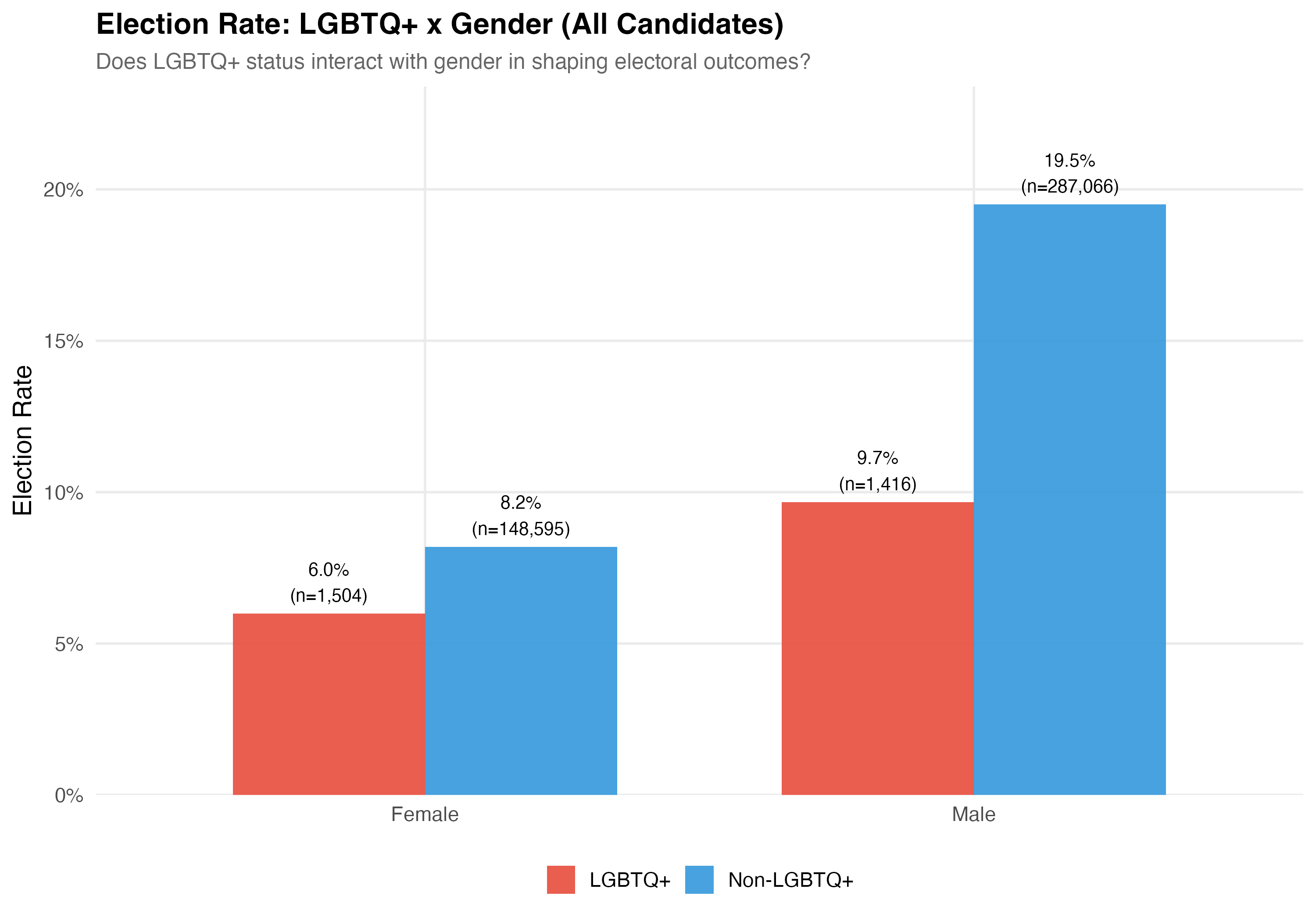 The “double disadvantage” hypothesis predicts that marginalized identities compound rather than substitute for each other — so LGBTQ+ women would face the lowest election rates and revenue. The data above allow us to assess whether this pattern holds.