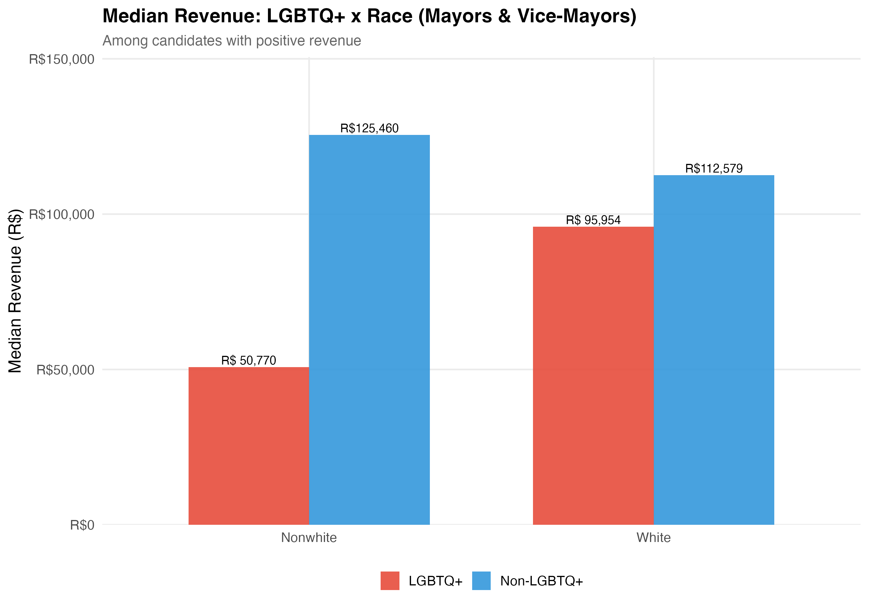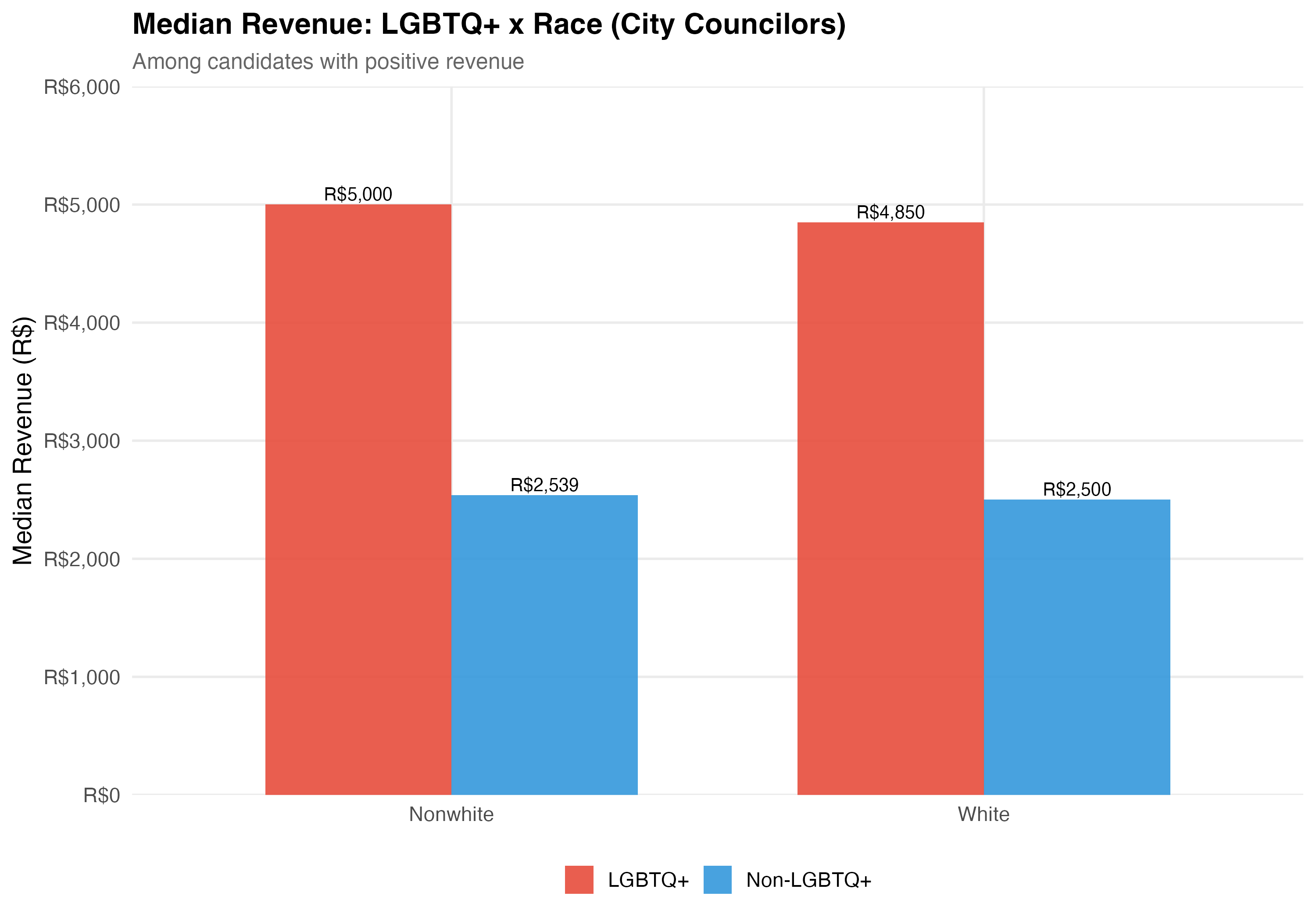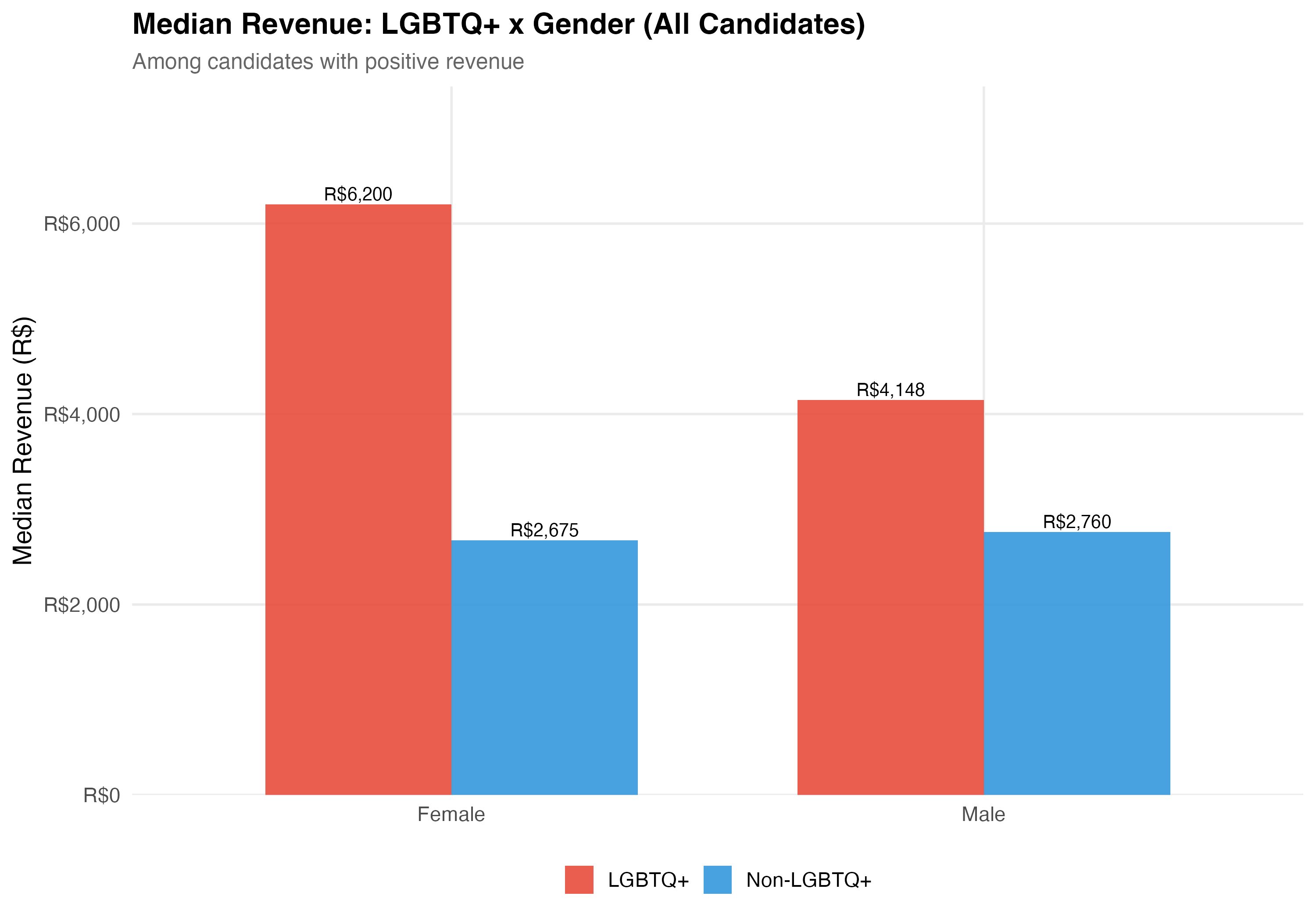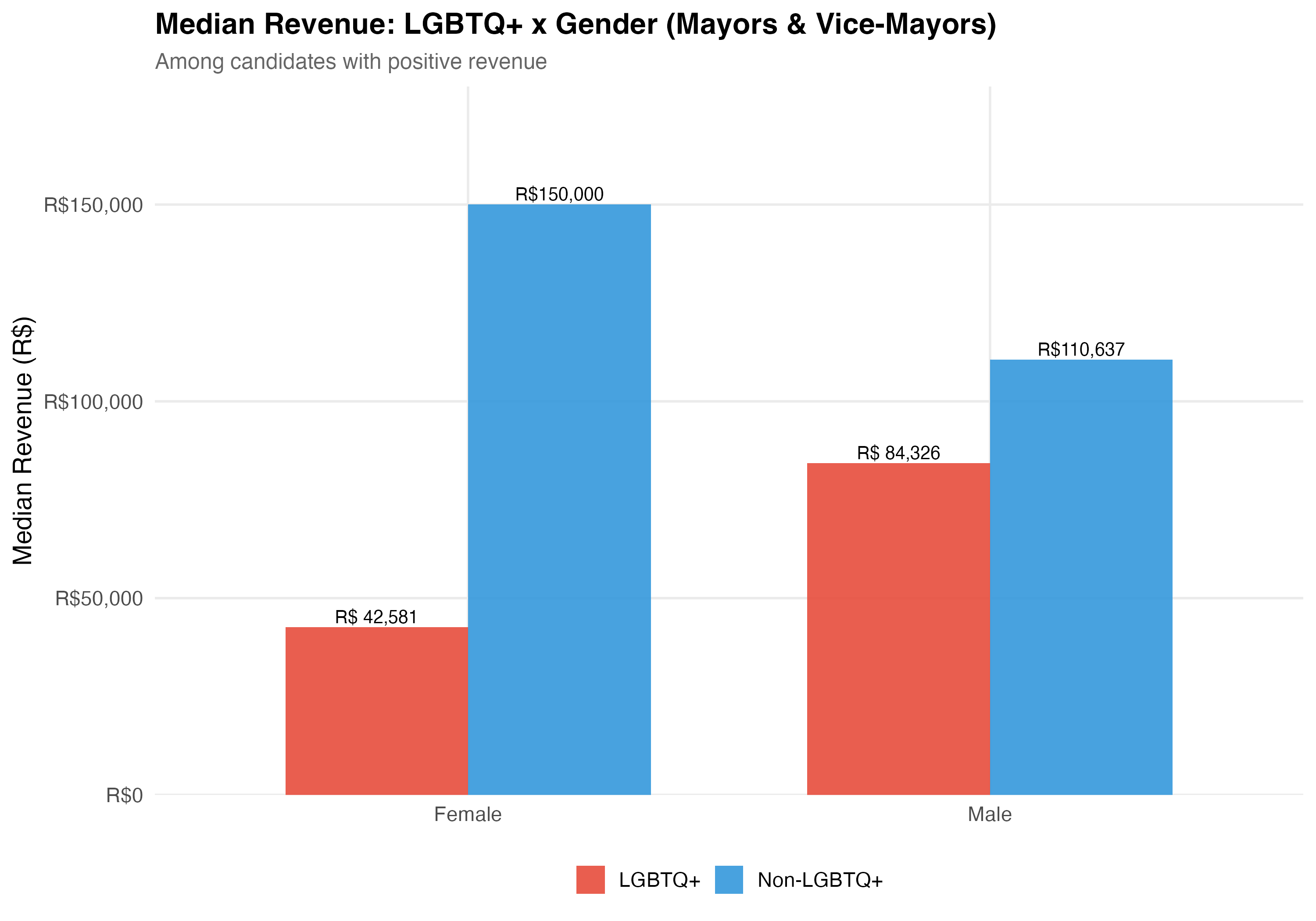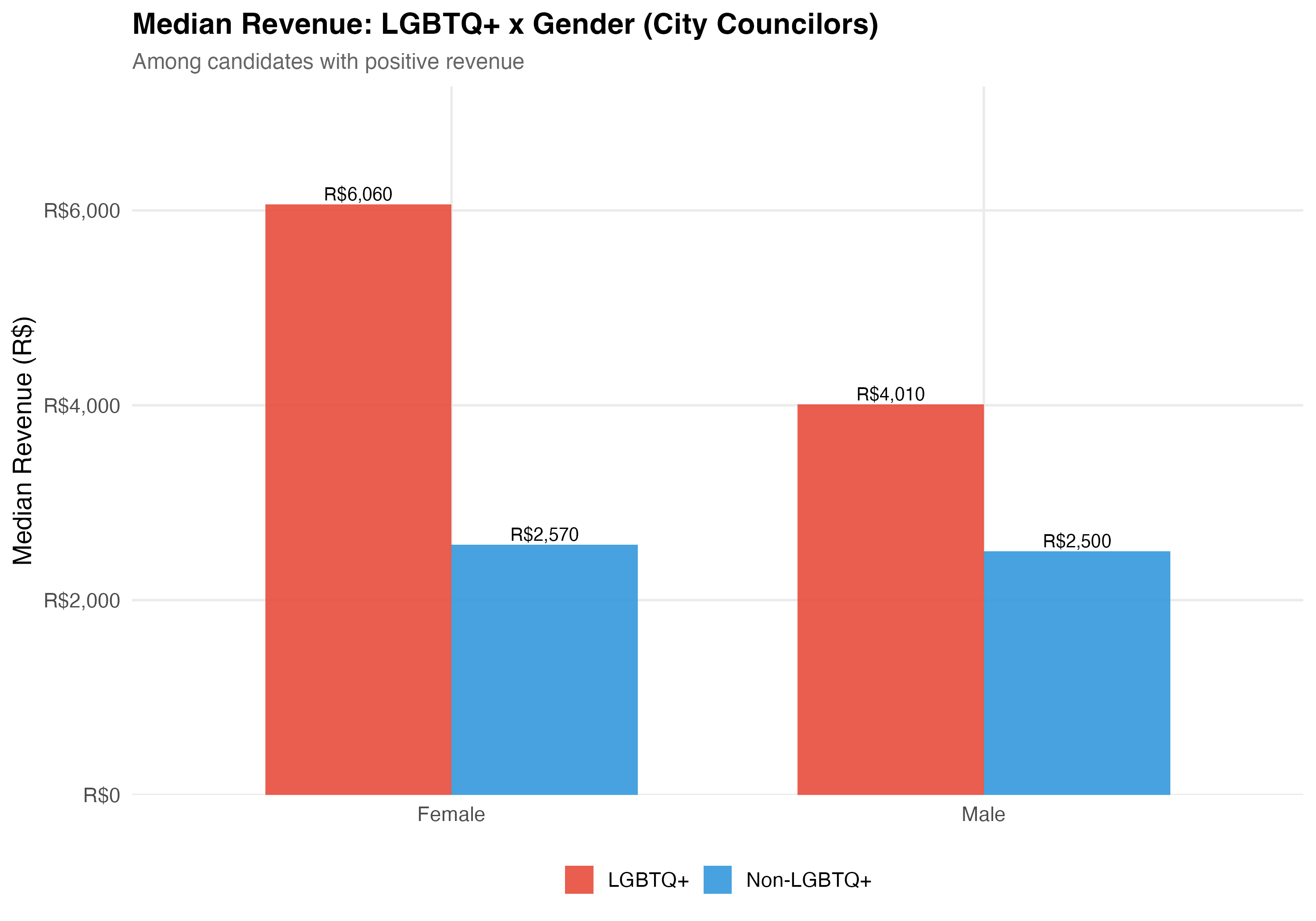 render_gender_intersection <-function(data, tab_name) { d <- data %>%filter(!is.na(female), !is.na(elected)) %>%mutate(lgbtq_group =if_else(lgbtq_candidate, "LGBTQ+", "Non-LGBTQ+"),gender_label =if_else(female, "Female", "Male") )# --- Cross-tabulation table ---cat("### Cross-Tabulation\n\n") lgbtq_gender <- d %>%group_by(lgbtq_group, gender_label) %>%summarise(N =n(),Elected =sum(elected),`Elect. Rate`=format_pct(mean(elected)),`Mean Rev.`=format_brl(mean(total_revenue, na.rm =TRUE)),`Median Rev.`=format_brl(median(total_revenue, na.rm =TRUE)),.groups ="drop" ) lgbtq_gender %>%rename(`LGBTQ+ Status`= lgbtq_group, Gender = gender_label) %>%cat_kable(align =c("l", "l", "r", "r", "r", "r", "r"))# --- Election rate chart ---cat("### Election Rate\n\n") p_rate <- d %>%group_by(lgbtq_group, gender_label) %>%summarise(rate =mean(elected), n =n(), .groups ="drop") %>%ggplot(aes(x = gender_label, y = rate, fill = lgbtq_group)) +geom_col(position ="dodge", alpha =0.9, width =0.7) +geom_text(aes(label =paste0(format_pct(rate), "\n(n=", format_n(n), ")")),position =position_dodge(width =0.7), vjust =-0.3, size =3.5) +scale_fill_manual(values = pal_lgbtq, name =NULL) +scale_y_continuous(labels = percent, expand =expansion(mult =c(0, 0.2))) +labs(x =NULL, y ="Election Rate",title =paste0("Election Rate: LGBTQ+ x Gender (", tab_name, ")"),subtitle ="Does LGBTQ+ status interact with gender in shaping electoral outcomes?" )cat_plot(p_rate, paste0("06-lgbtq-gender-rate-", pos_suffix(tab_name)))# --- Revenue chart ---cat("### Median Revenue\n\n") rev_data <- data %>%filter(!is.na(female), total_revenue >0) %>%mutate(lgbtq_group =if_else(lgbtq_candidate, "LGBTQ+", "Non-LGBTQ+"),gender_label =if_else(female, "Female", "Male") ) %>%group_by(lgbtq_group, gender_label) %>%summarise(median_rev =median(total_revenue), n =n(), .groups ="drop") p_rev <- rev_data %>%ggplot(aes(x = gender_label, y = median_rev, fill = lgbtq_group)) +geom_col(position ="dodge", alpha =0.9, width =0.7) +geom_text(aes(label =format_brl(median_rev)),position =position_dodge(width =0.7), vjust =-0.3, size =3.5) +scale_fill_manual(values = pal_lgbtq, name =NULL) +scale_y_continuous(labels =label_dollar(prefix ="R$", big.mark =","),expand =expansion(mult =c(0, 0.2))) +labs(x =NULL, y ="Median Revenue (R$)",title =paste0("Median Revenue: LGBTQ+ x Gender (", tab_name, ")"),subtitle ="Among candidates with positive revenue" )cat_plot(p_rev, paste0("06-lgbtq-gender-revenue-", pos_suffix(tab_name)))cat("::: {.callout-important}\n")cat("## Double Disadvantage?\n")cat("The \"double disadvantage\" hypothesis predicts that marginalized identities compound ","rather than substitute for each other --- so LGBTQ+ women would face the lowest ","election rates and revenue. The data above allow us to assess whether this pattern holds.\n")cat(":::\n\n")}render_position_tabset(render_gender_intersection, df)