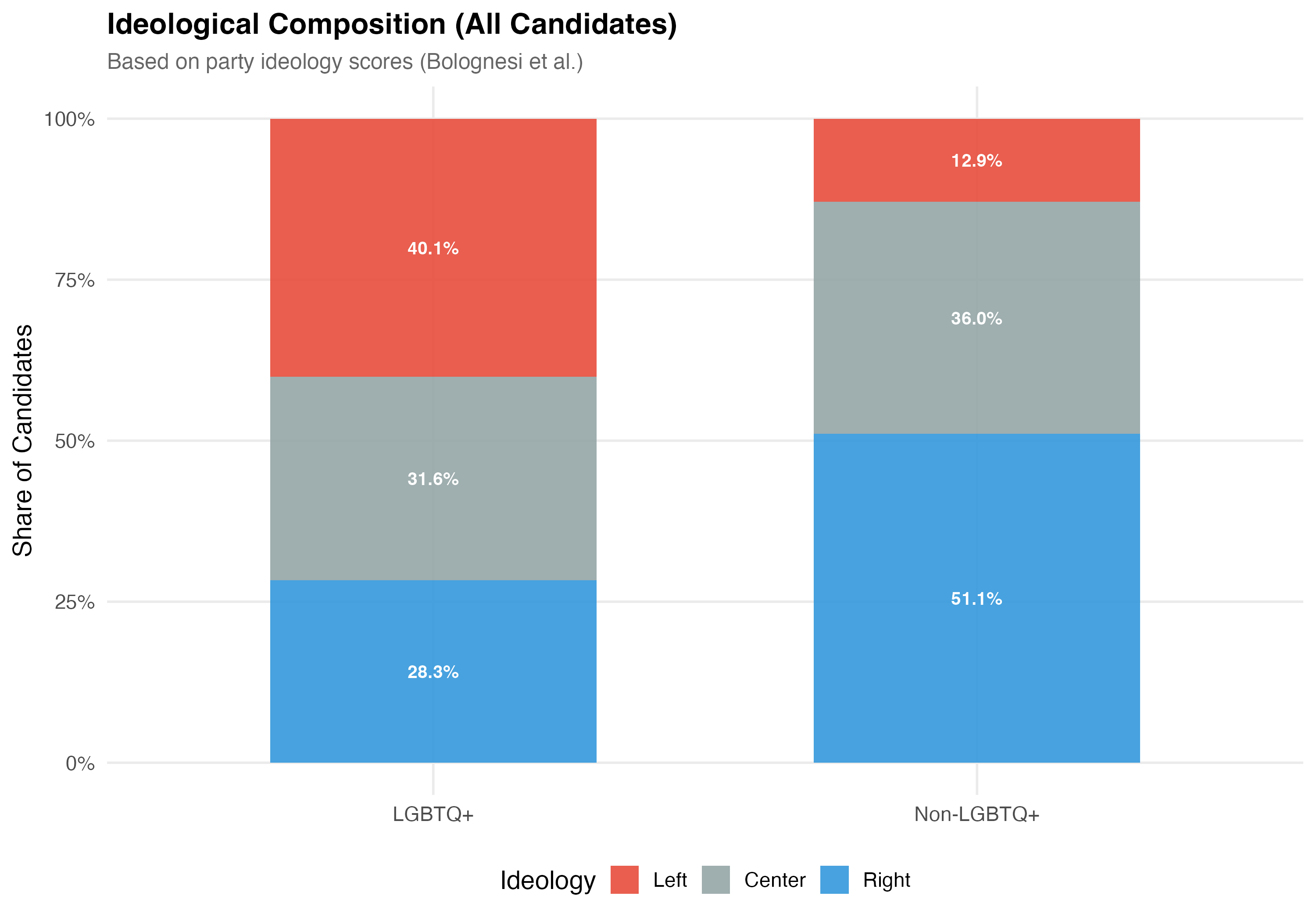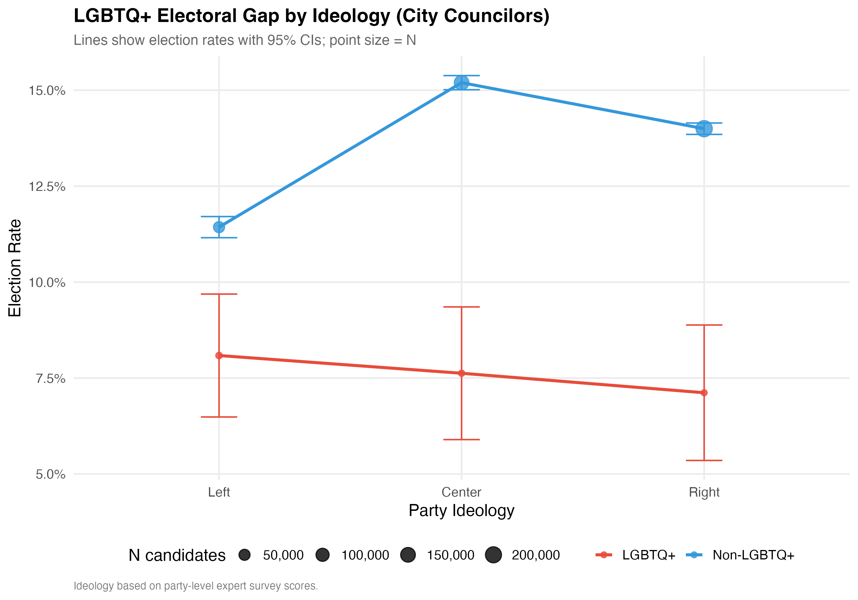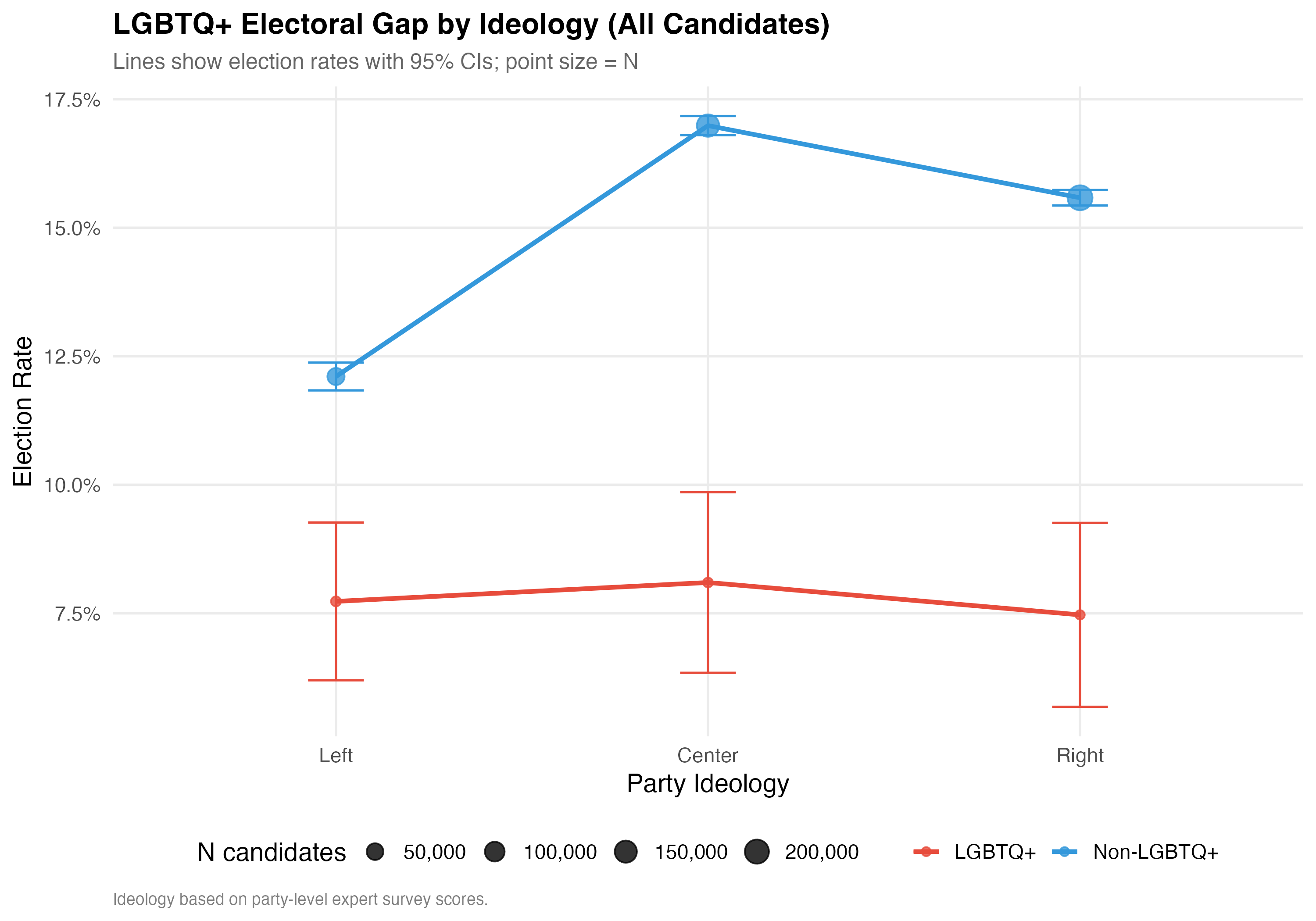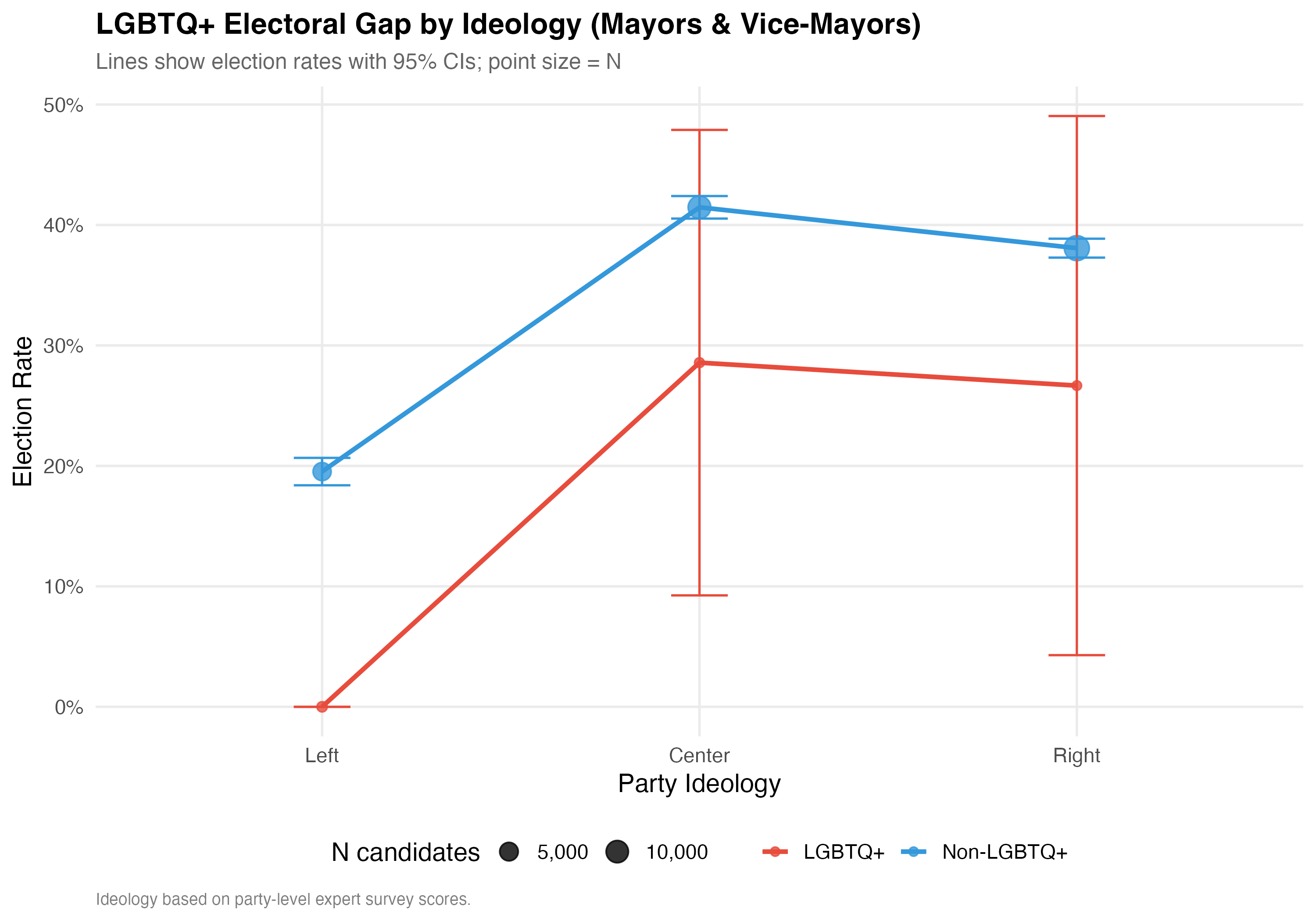 Ideology x LGBTQ+: The interaction plot reveals the degree to which the partisan environment moderates the relationship between LGBTQ+ status and electoral outcomes across left, center, and right parties.
