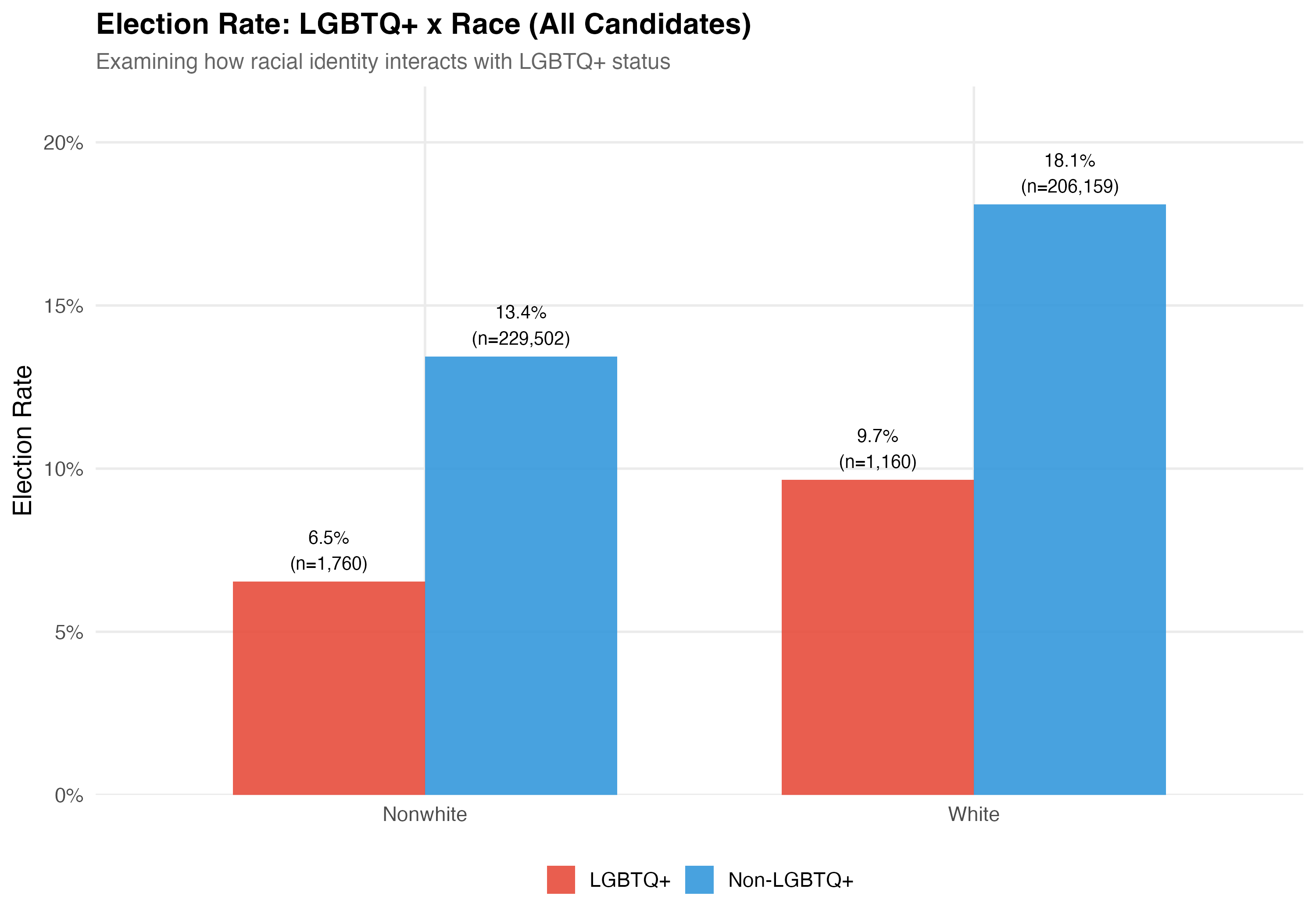 Race x LGBTQ+: The interaction between LGBTQ+ status and race tests whether nonwhite LGBTQ+ candidates face compounding disadvantage, and whether the effects are additive or multiplicative.