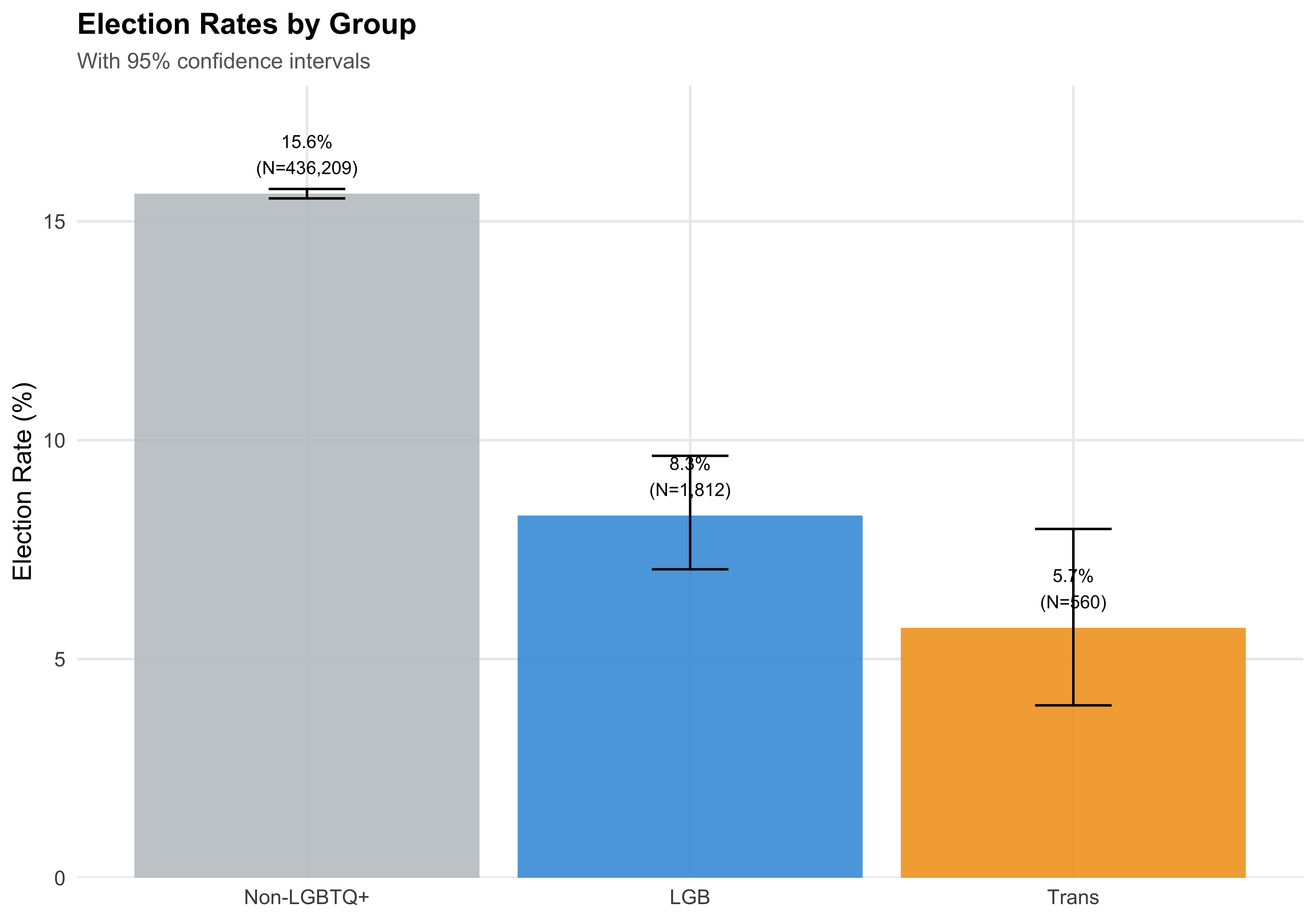 The three-way comparison reveals whether the aggregate LGBTQ+ patterns are driven by one subgroup or represent a shared experience. Trans candidates may face distinct barriers — reflected in different election rates, revenue levels, and funding source composition — that are masked when the LGBTQ+ category is treated as monolithic.