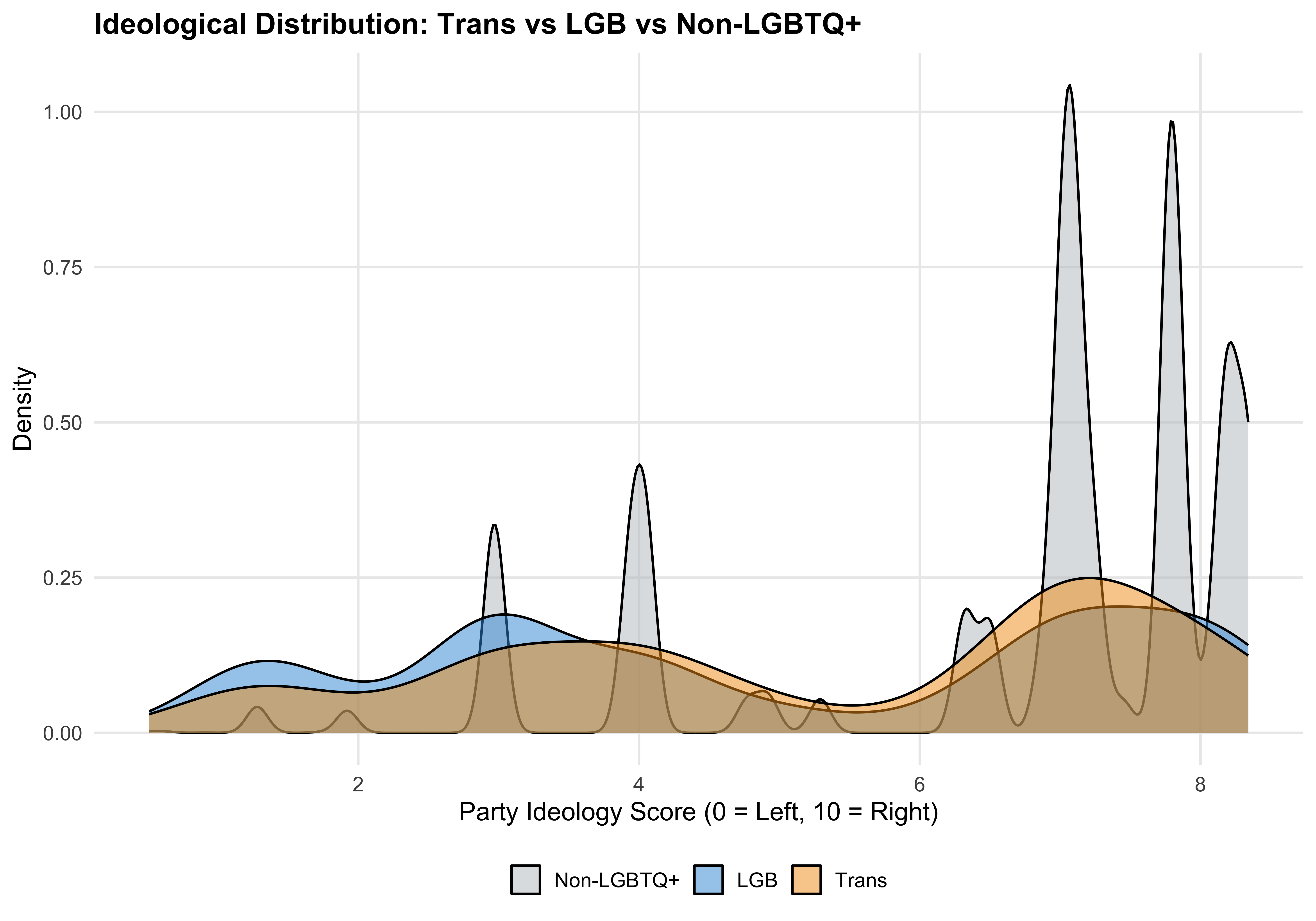 source(here::here("code", "00_setup.R"))df <-readRDS(paths$analysis_full_rds)# Set ideology category ordering: Left → Center → Right# Create three-way group for Trans vs LGB vs Non-LGBTQ+ comparisondf <- df %>%mutate(ideology_category =factor(ideology_category, levels = ideology_levels),threeway_group =case_when( trans_candidate ~"Trans", lgb_candidate ~"LGB",TRUE~"Non-LGBTQ+" ) %>%factor(levels =c("Non-LGBTQ+", "LGB", "Trans")) )