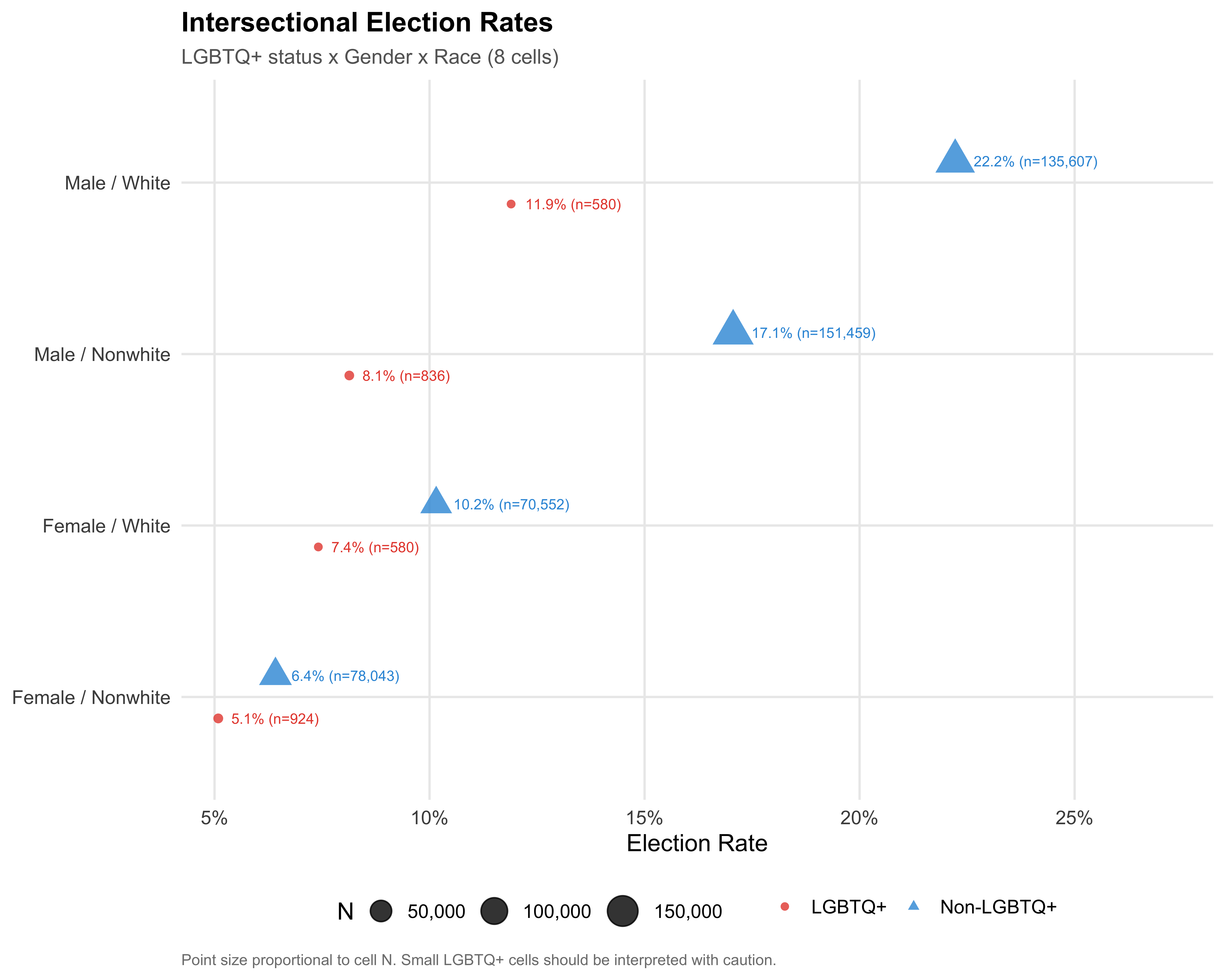 Triple intersection: The eight-cell analysis (LGBTQ+ x gender x race) identifies the most and least advantaged candidate profiles, providing a map of intersectional privilege and disadvantage.
