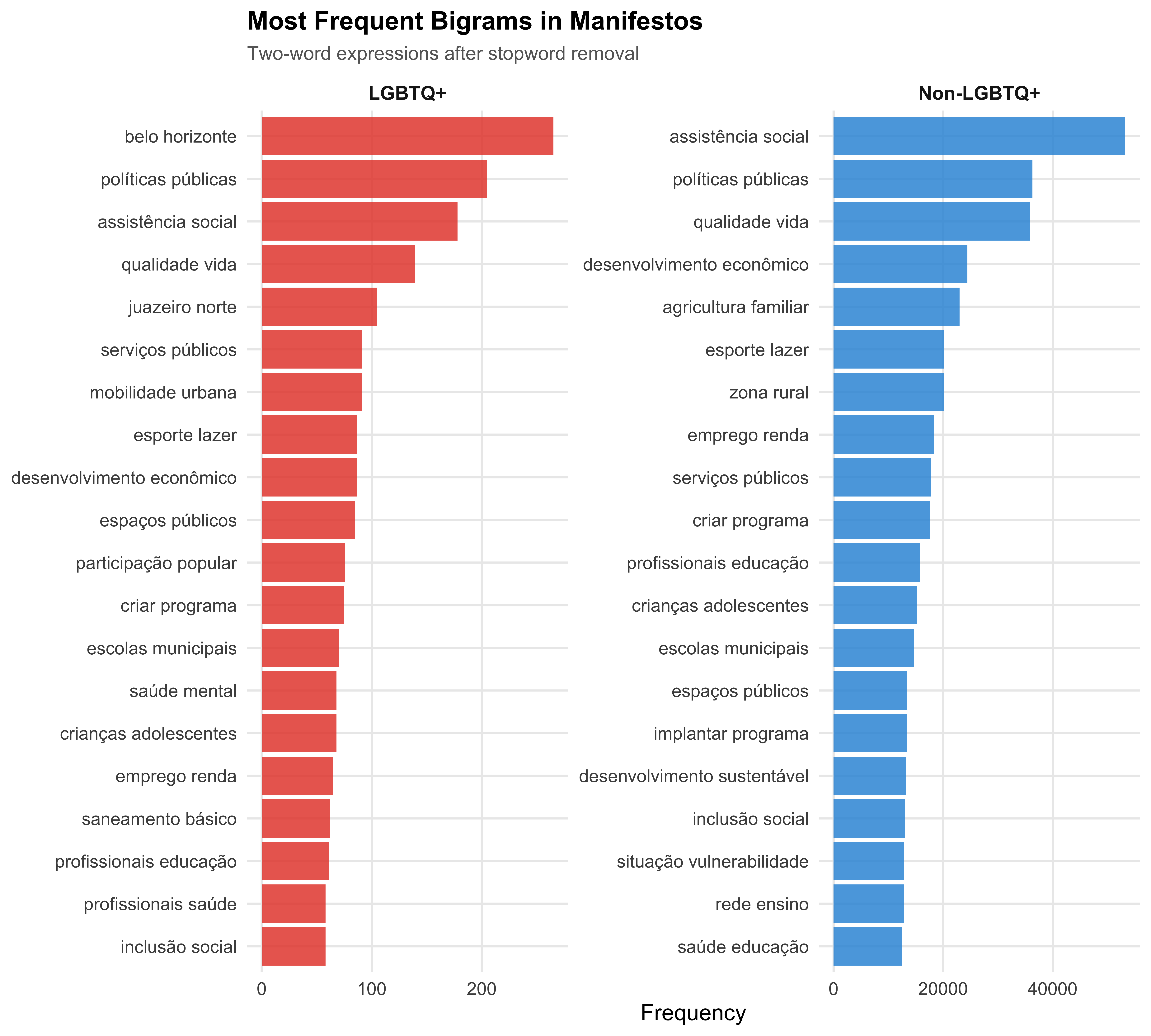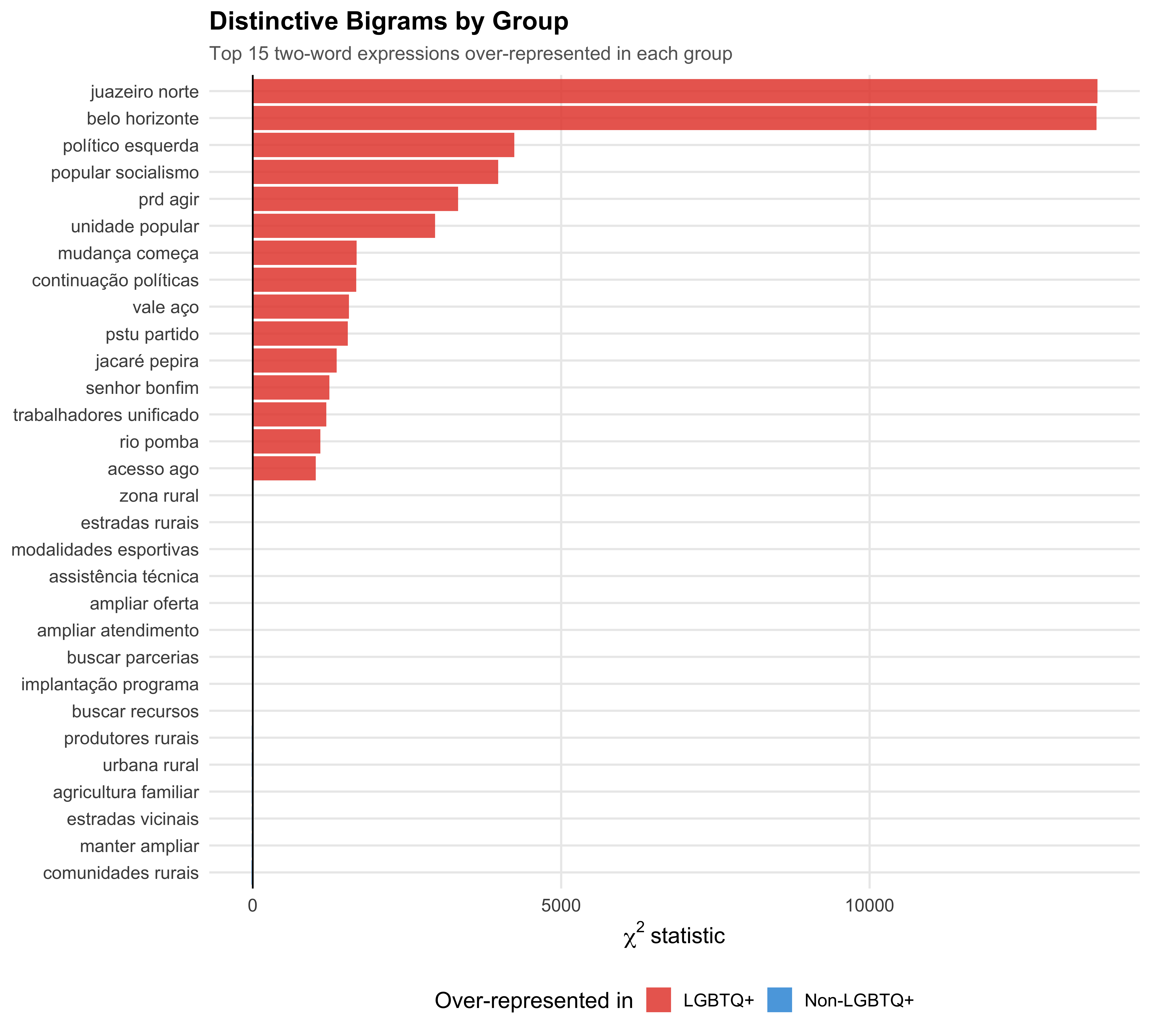 Single words lose multi-word expressions that carry important meaning in Portuguese political discourse. We examine the most frequent bigrams (two-word sequences) and compare distinctive bigrams across groups.