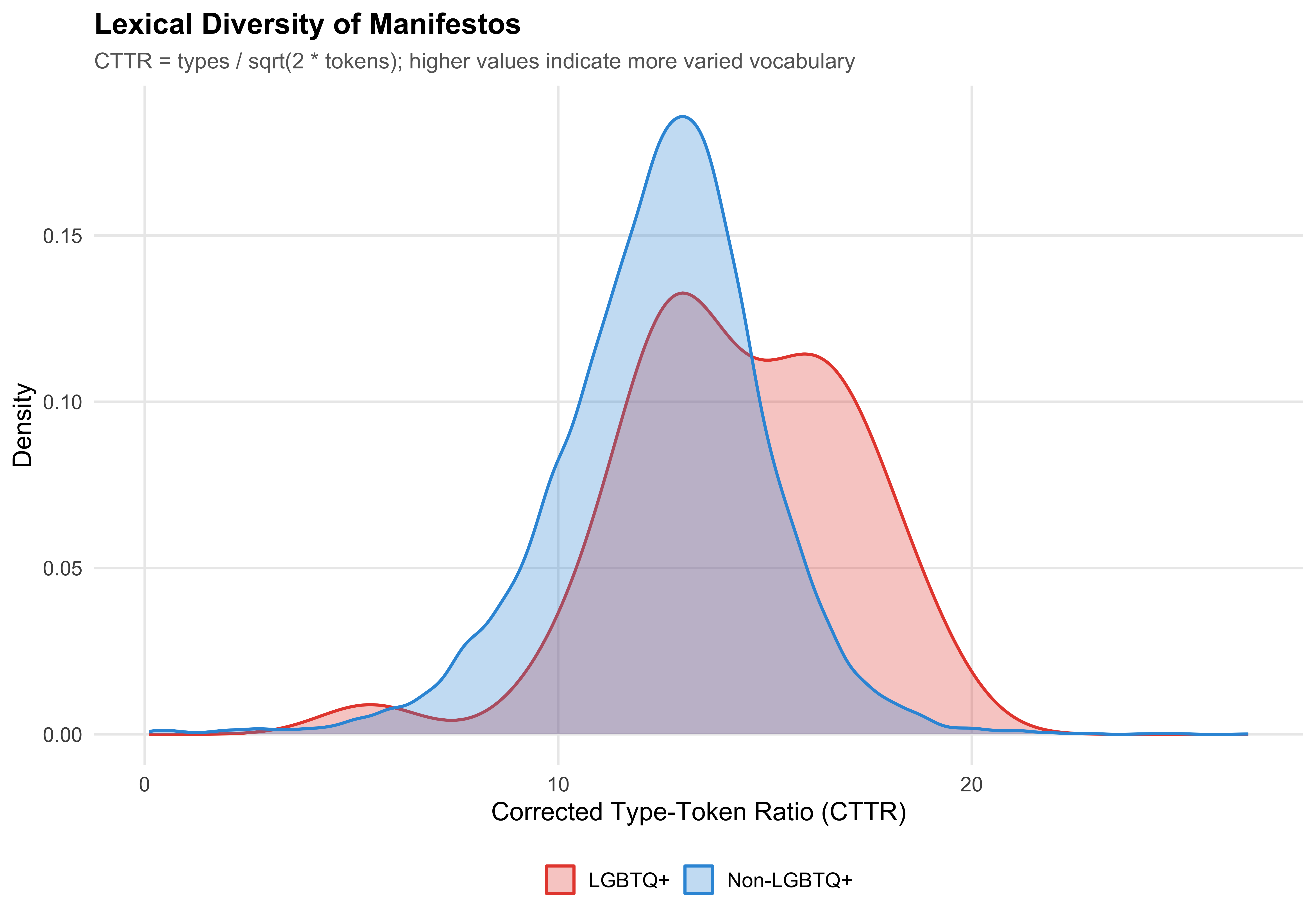 ggplot(mayors, aes(x = cttr, fill = lgbtq_label, color = lgbtq_label)) +geom_density(alpha =0.3, linewidth =0.8) +scale_fill_manual(values = pal_lgbtq) +scale_color_manual(values = pal_lgbtq) +labs(x ="Corrected Type-Token Ratio (CTTR)",y ="Density",fill =NULL,color =NULL,title ="Lexical Diversity of Manifestos",subtitle ="CTTR = types / sqrt(2 * tokens); higher values indicate more varied vocabulary" )save_figure(last_plot(), "07_lexdiv_comparison")