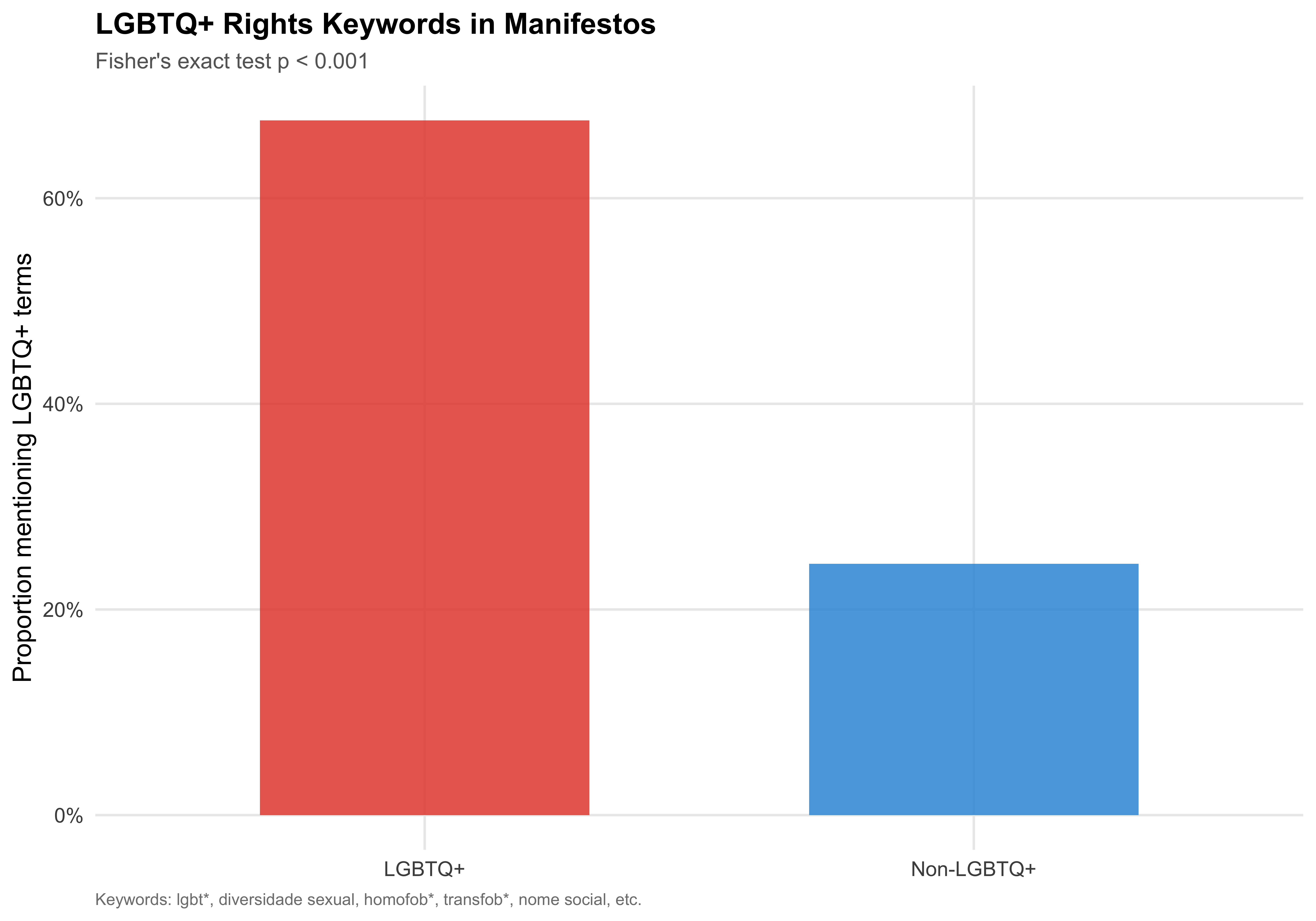 Do LGBTQ+ candidates explicitly mention LGBTQ+ rights issues in their manifestos? We search for a targeted set of keywords.