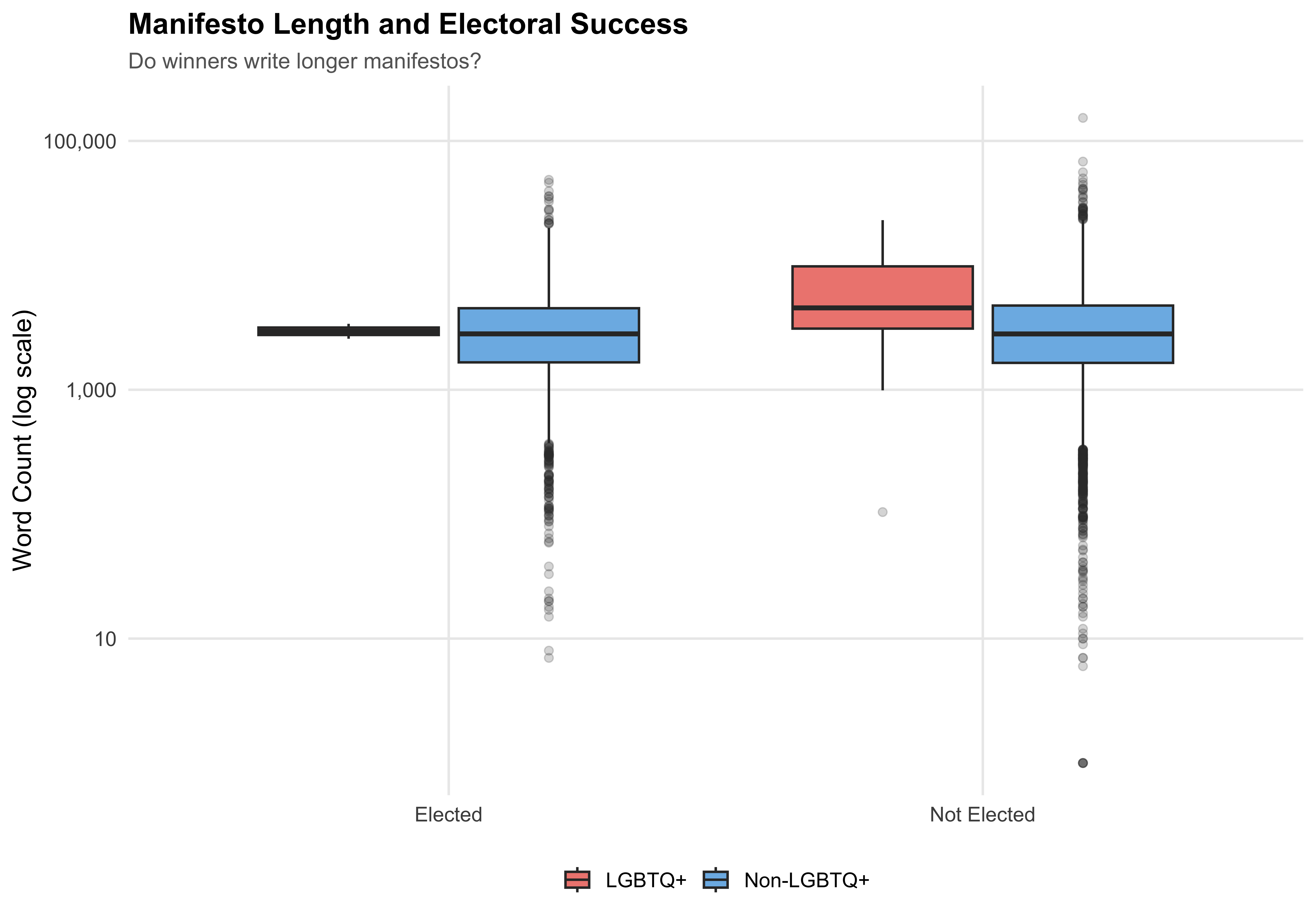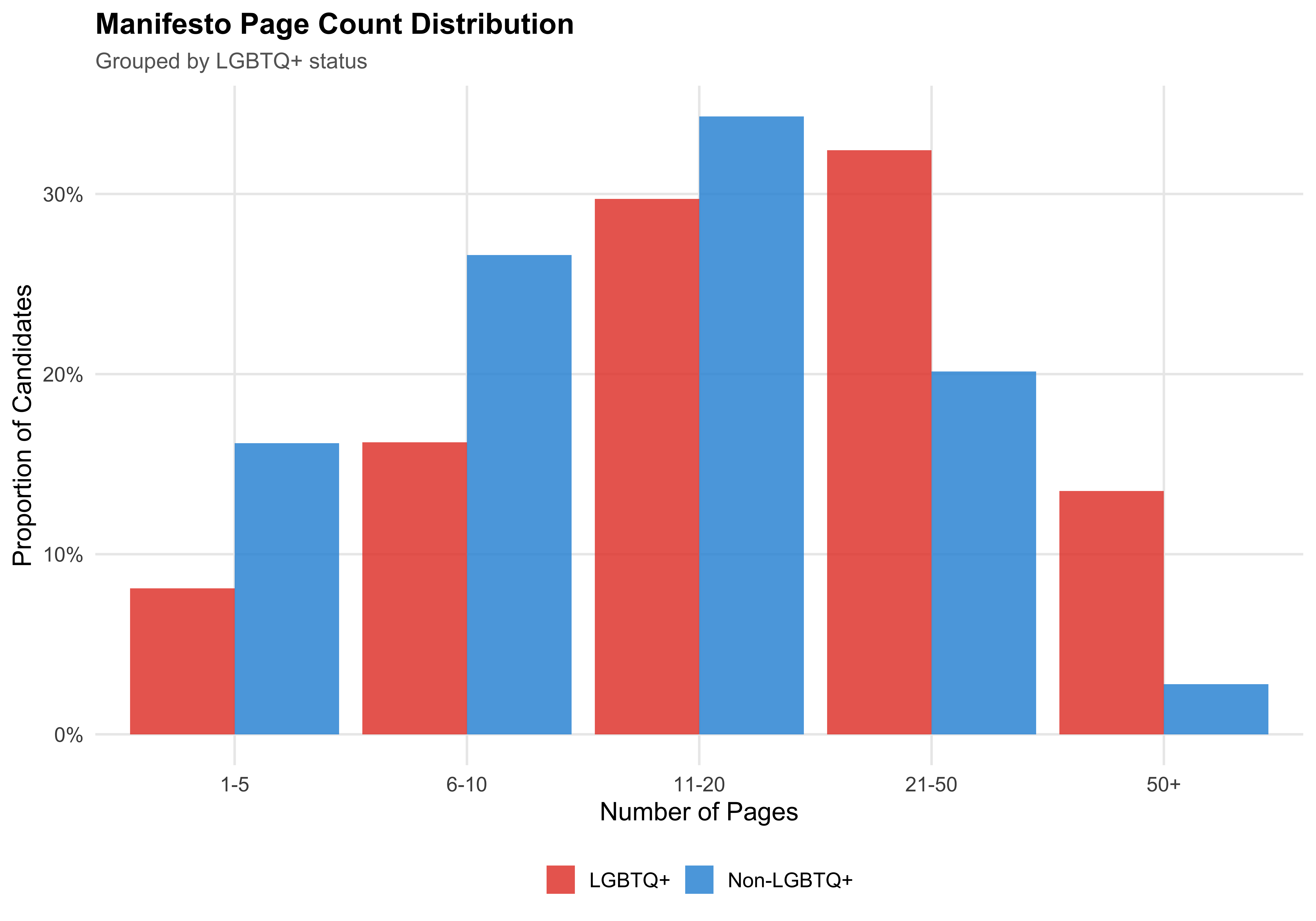 LGBTQ+ candidates write manifestos that are longer than those of non-LGBTQ+ candidates (median 4,517 vs 2,819 words). The median page count is 19 for LGBTQ+ candidates and 12 for non-LGBTQ+ candidates.