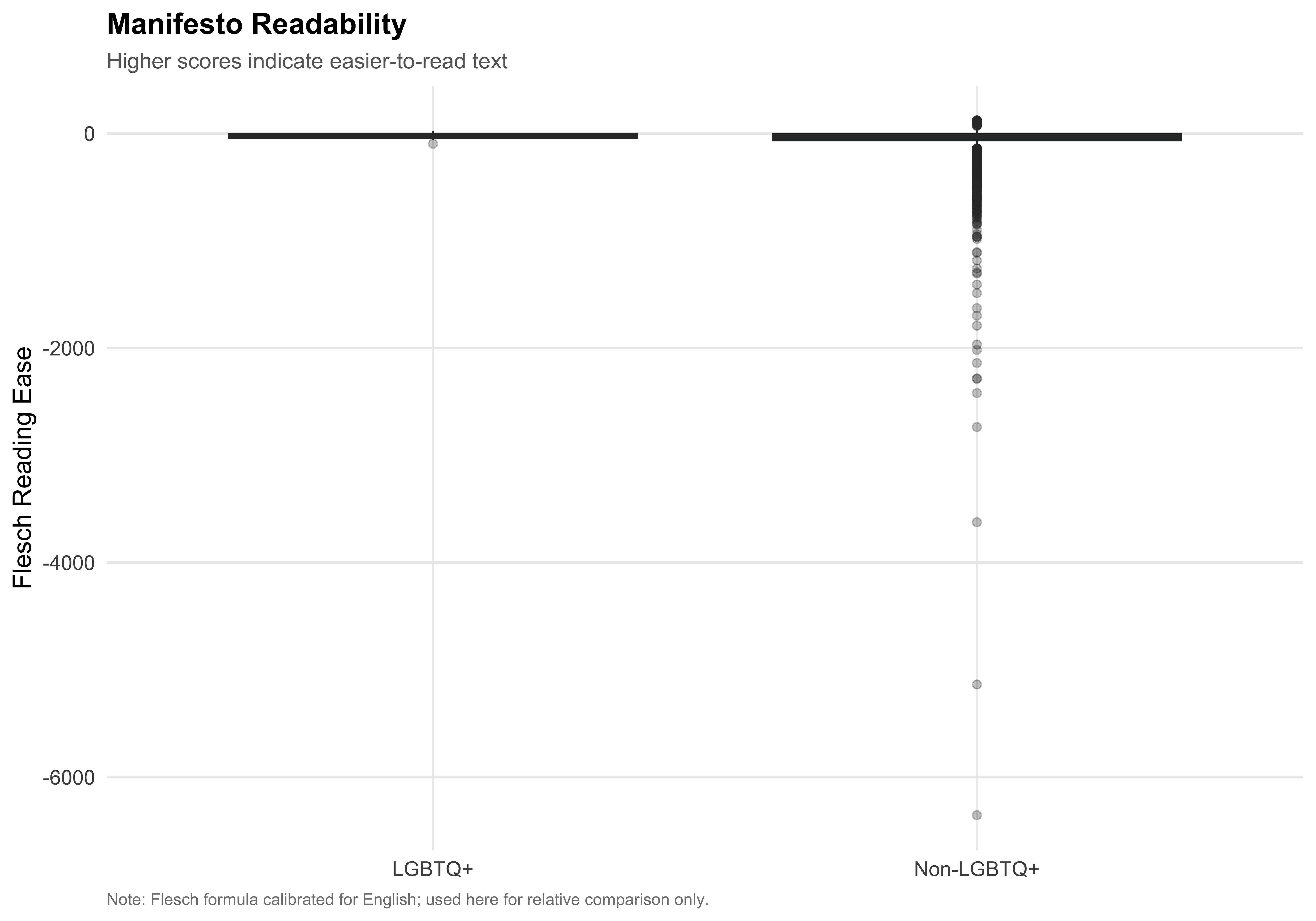 ggplot(mayors, aes(x = lgbtq_label, y = flesch, fill = lgbtq_label)) +geom_boxplot(alpha =0.7, outlier.alpha =0.3) +scale_fill_manual(values = pal_lgbtq) +labs(x =NULL,y ="Flesch Reading Ease",fill =NULL,title ="Manifesto Readability",subtitle ="Higher scores indicate easier-to-read text",caption ="Note: Flesch formula calibrated for English; used here for relative comparison only." ) +guides(fill ="none")save_figure(last_plot(), "07_readability_comparison")