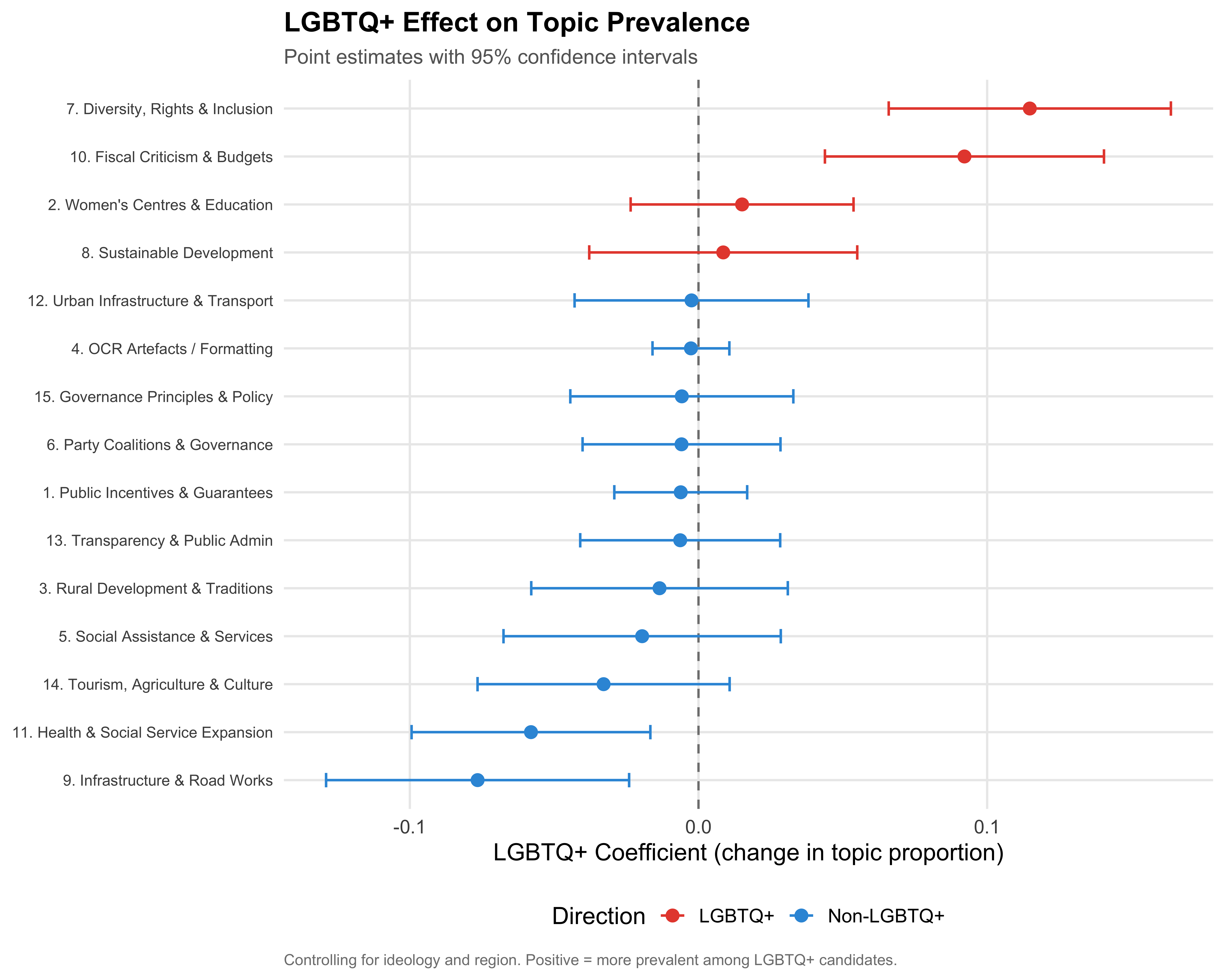 effect_plot_data <- effect_summary %>%mutate(Topic_Label =paste0(Topic, ". ", Label),direction =if_else(Estimate >0, "LGBTQ+", "Non-LGBTQ+"),lower = Estimate -1.96* SE,upper = Estimate +1.96* SE )ggplot(effect_plot_data, aes(x = Estimate, y =reorder(Topic_Label, Estimate),color = direction)) +geom_vline(xintercept =0, linetype ="dashed", color ="grey50") +geom_errorbarh(aes(xmin = lower, xmax = upper), height =0.3, linewidth =0.7) +geom_point(size =3) +scale_color_manual(values = pal_lgbtq) +labs(x ="LGBTQ+ Coefficient (change in topic proportion)",y =NULL,color ="Direction",title ="LGBTQ+ Effect on Topic Prevalence",subtitle ="Point estimates with 95% confidence intervals",caption ="Controlling for ideology and region. Positive = more prevalent among LGBTQ+ candidates." ) +theme(axis.text.y =element_text(size =9))save_figure(last_plot(), "07_stm_lgbtq_effect", height =8)