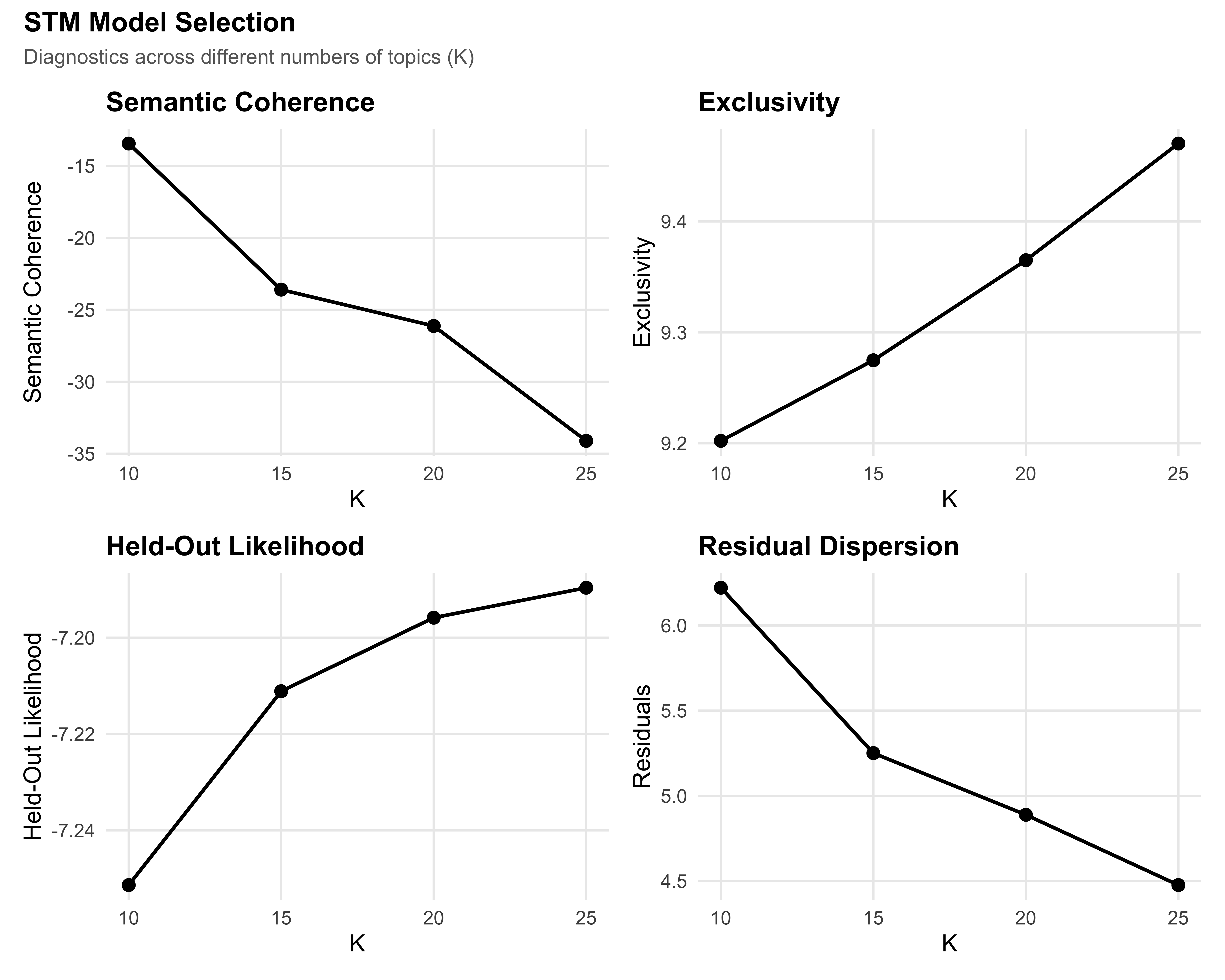 We evaluate models with K = 10, 15, 20, and 25 topics using four diagnostics: semantic coherence (do top words co-occur?), exclusivity (are top words unique to topics?), held-out likelihood (predictive fit), and residual dispersion. We select K = 15 as a balance between coherence and exclusivity, favoring interpretability for a descriptive analysis.