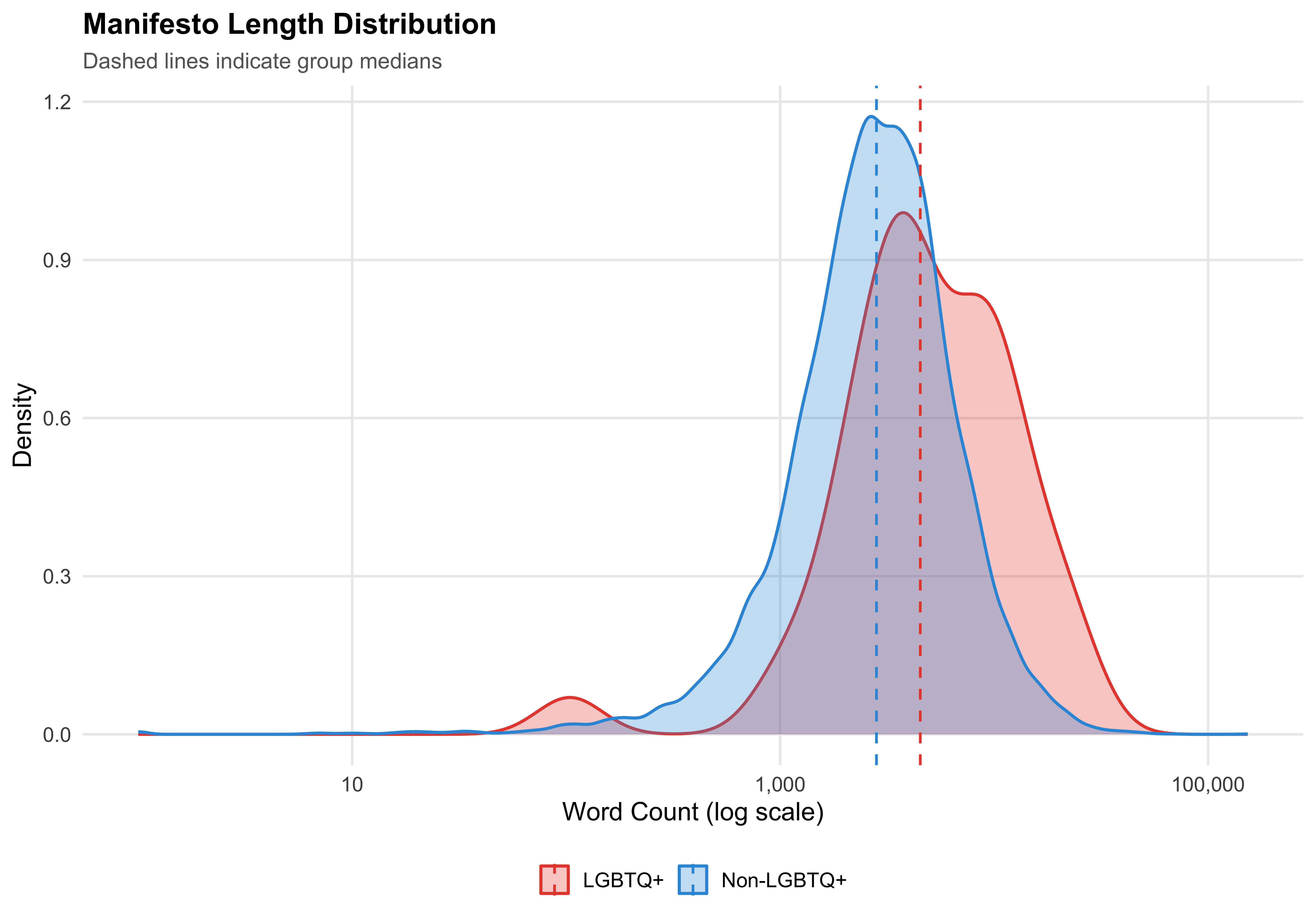 Corpus characteristics: LGBTQ+ candidate manifestos are longer than their non-LGBTQ+ counterparts (median 4,517 vs 2,819 words).
