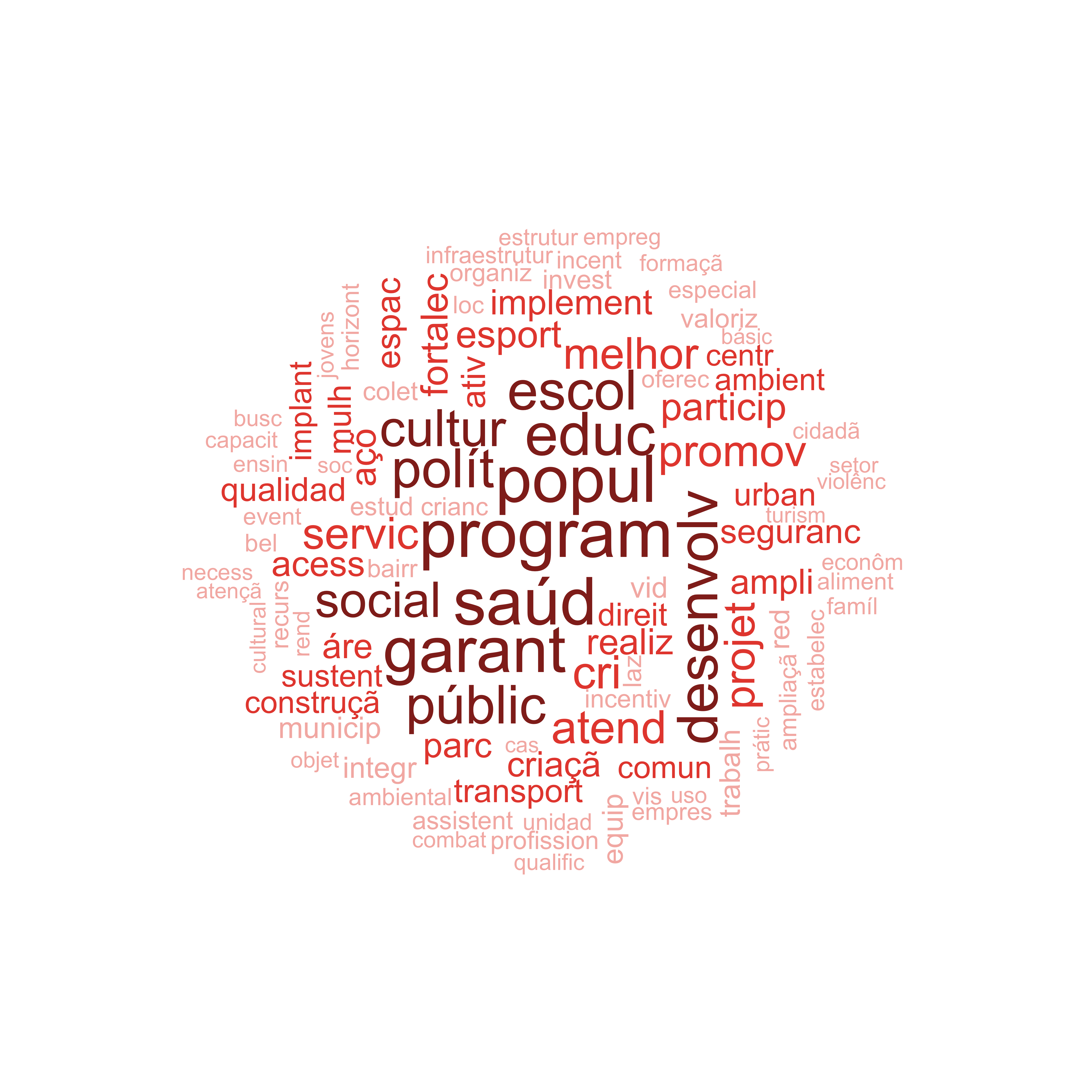 # --- Build the NLP pipeline (shared across sections 4-6) ---# Portuguese stopwords: combine two sources for broad coveragept_stopwords <-unique(c(stopwords("pt", source ="snowball"),stopwords("pt", source ="stopwords-iso")))# Domain-specific stopwords common in Brazilian political manifestosmanifesto_stopwords <-c("município", "municipio", "cidade", "prefeito", "prefeita","vice", "candidato", "candidata", "governo", "plano","proposta", "propostas", "gestão", "gestao", "administração","administracao", "público", "publico", "pública", "publica","municipal", "prefeitura", "câmara", "camara", "vereador","secretaria", "artigo", "lei", "parágrafo", "inciso","nº", "art", "cf", "cpf", "cnpj", "ainda", "além", "cada","forma", "bem", "toda", "todo", "todos", "todas", "será","deve", "deverá", "podem", "podem", "sendo", "através","assim", "sobre", "entre", "onde", "acordo", "partir")all_stopwords <-unique(c(pt_stopwords, manifesto_stopwords))# Tokenizetoks <-tokens(corp, remove_punct =TRUE, remove_numbers =TRUE,remove_symbols =TRUE) %>%tokens_tolower() %>%tokens_remove(pattern = all_stopwords) %>%tokens_remove(pattern ="^.{1,2}$", valuetype ="regex")# Stemmed version for frequency and STMtoks_stem <-tokens_wordstem(toks, language ="portuguese")# DFMsdfm_raw <-dfm(toks) # unstemmed (for dictionary lookup)dfm_stem <-dfm(toks_stem) # stemmed# Trimmed version for keyness and STM# Convert count threshold to proportion (compatible with all quanteda versions)dfm_trimmed <- dfm_stem %>%dfm_trim(min_docfreq =10/ndoc(dfm_stem), max_docfreq =0.95,docfreq_type ="prop")