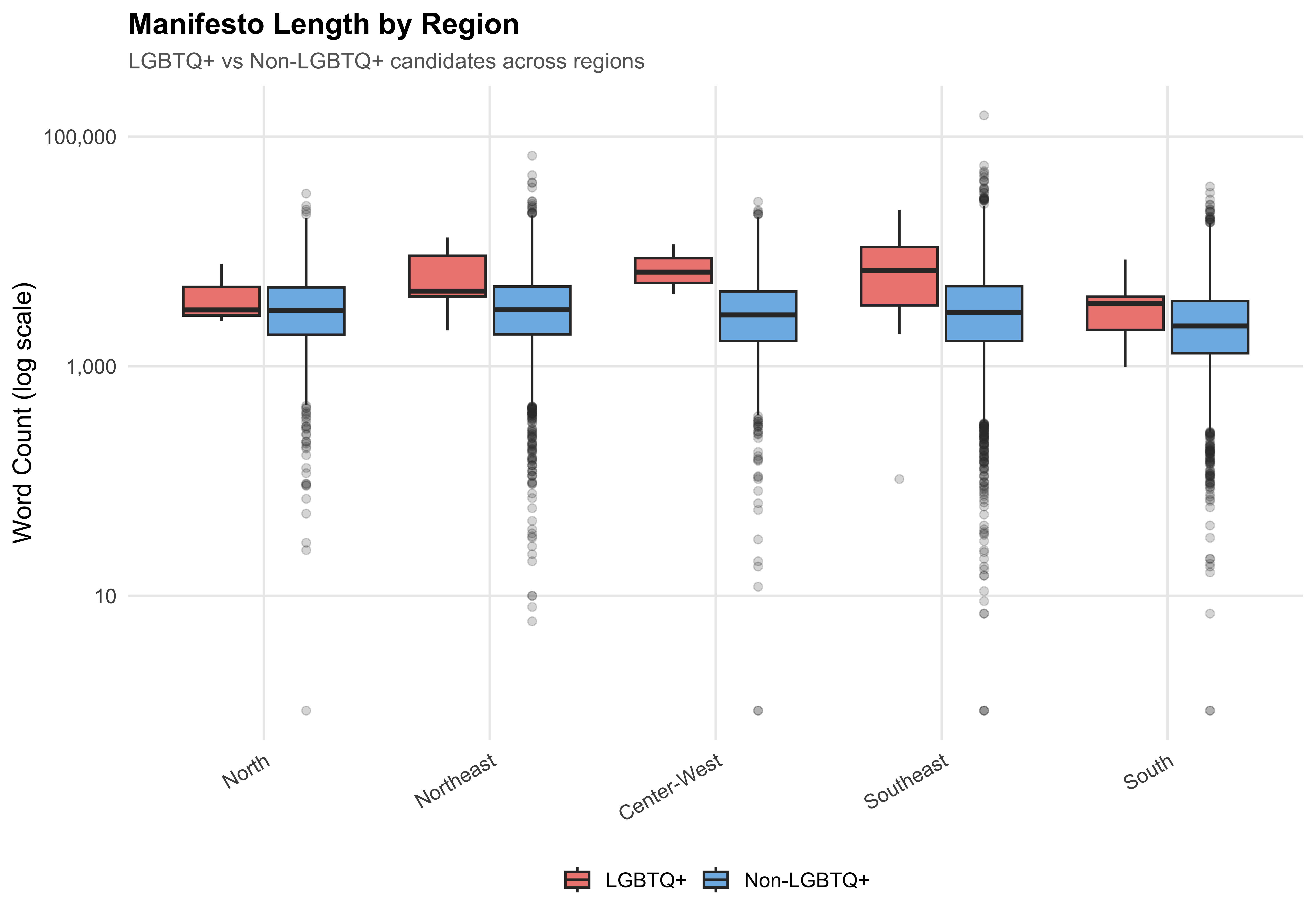ggplot(mayors %>%filter(!is.na(region)),aes(x = region, y = manifesto_n_words, fill = lgbtq_label)) +geom_boxplot(alpha =0.7, outlier.alpha =0.2) +scale_y_log10(labels =label_comma()) +scale_fill_manual(values = pal_lgbtq) +labs(x =NULL,y ="Word Count (log scale)",fill =NULL,title ="Manifesto Length by Region",subtitle ="LGBTQ+ vs Non-LGBTQ+ candidates across regions" ) +theme(axis.text.x =element_text(angle =30, hjust =1))save_figure(last_plot(), "07_words_region")